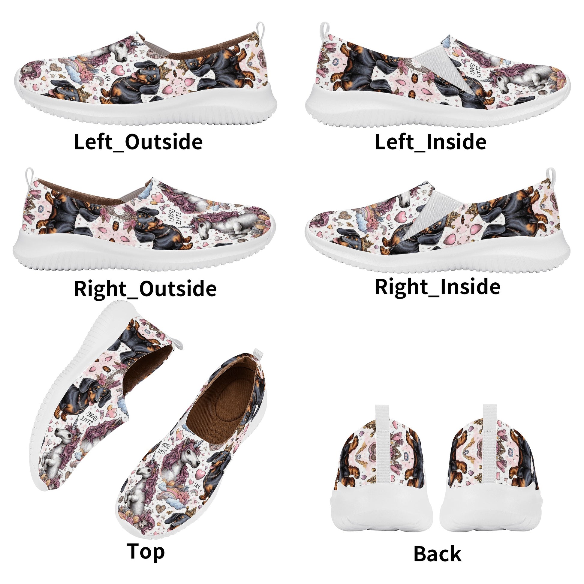 Estos zapatos presentan un estampado personalizado de perros salchicha en varias poses y colores, con un fondo blanco y sin sombras. Están diseñados para ser lindos, extravagantes y divertidos, como tus amigos de cuatro patas.