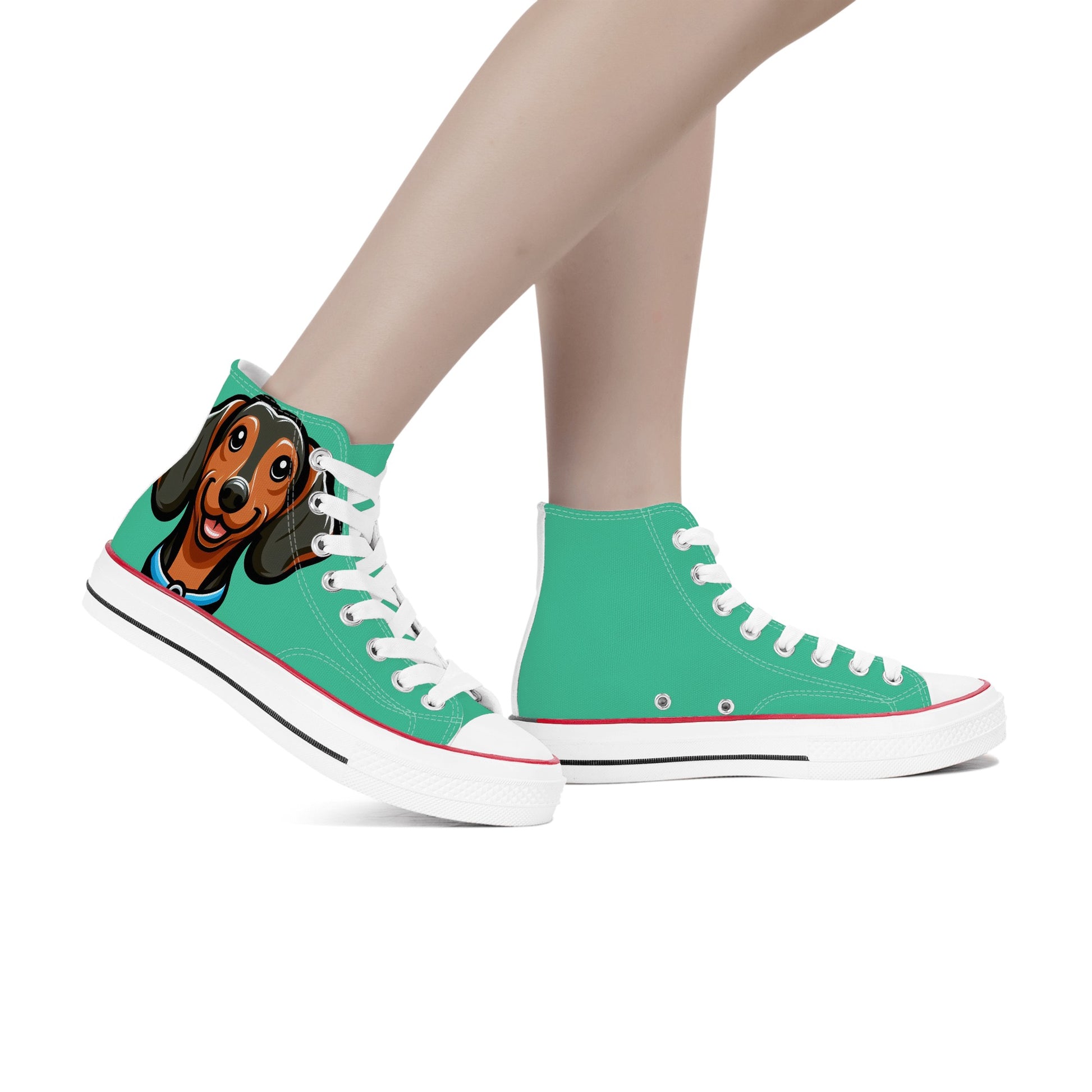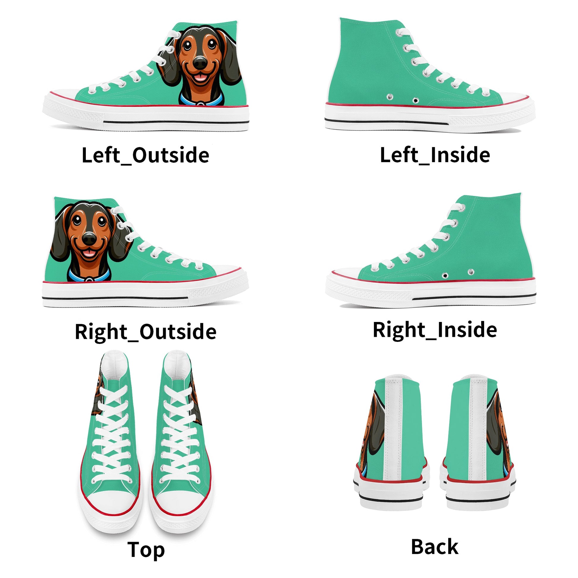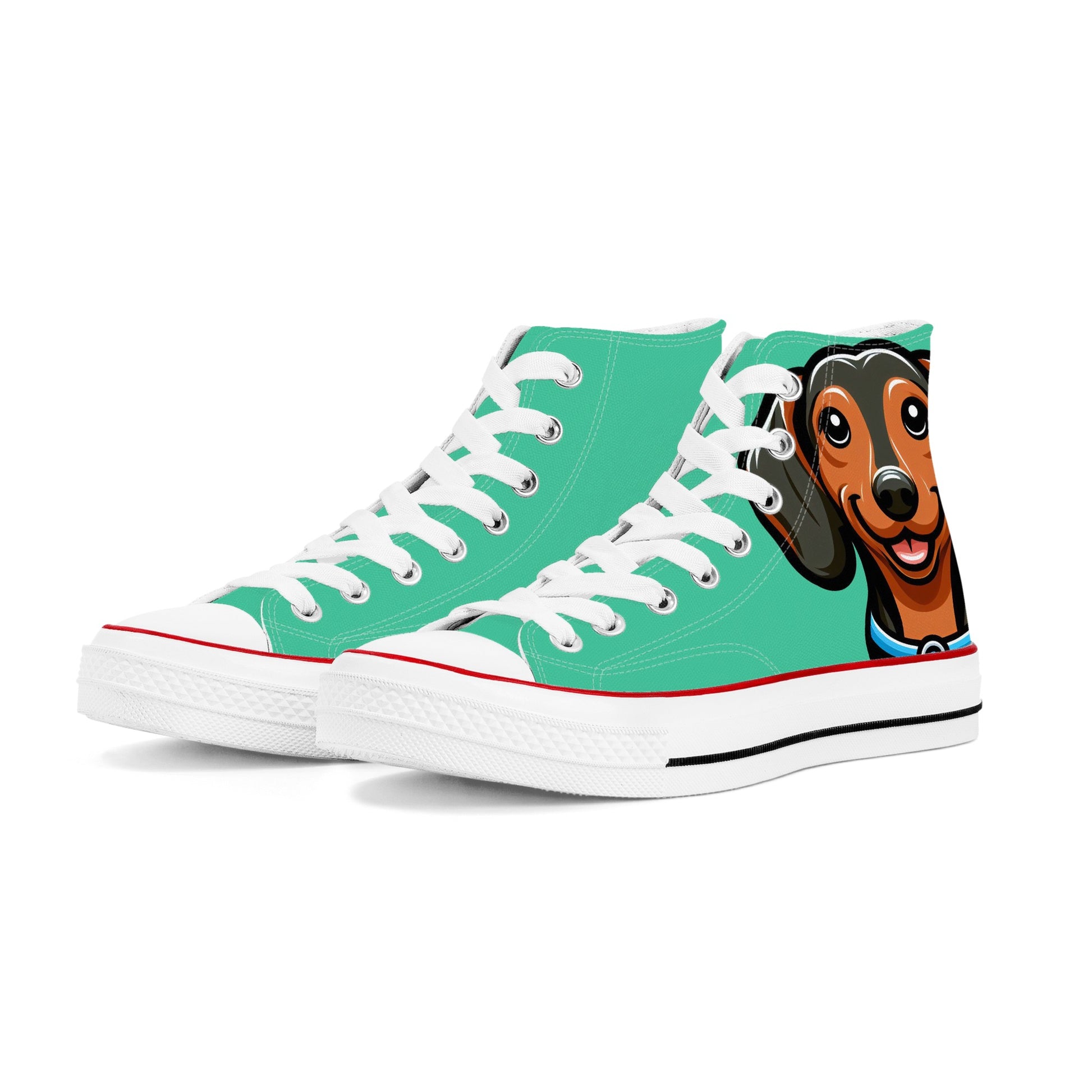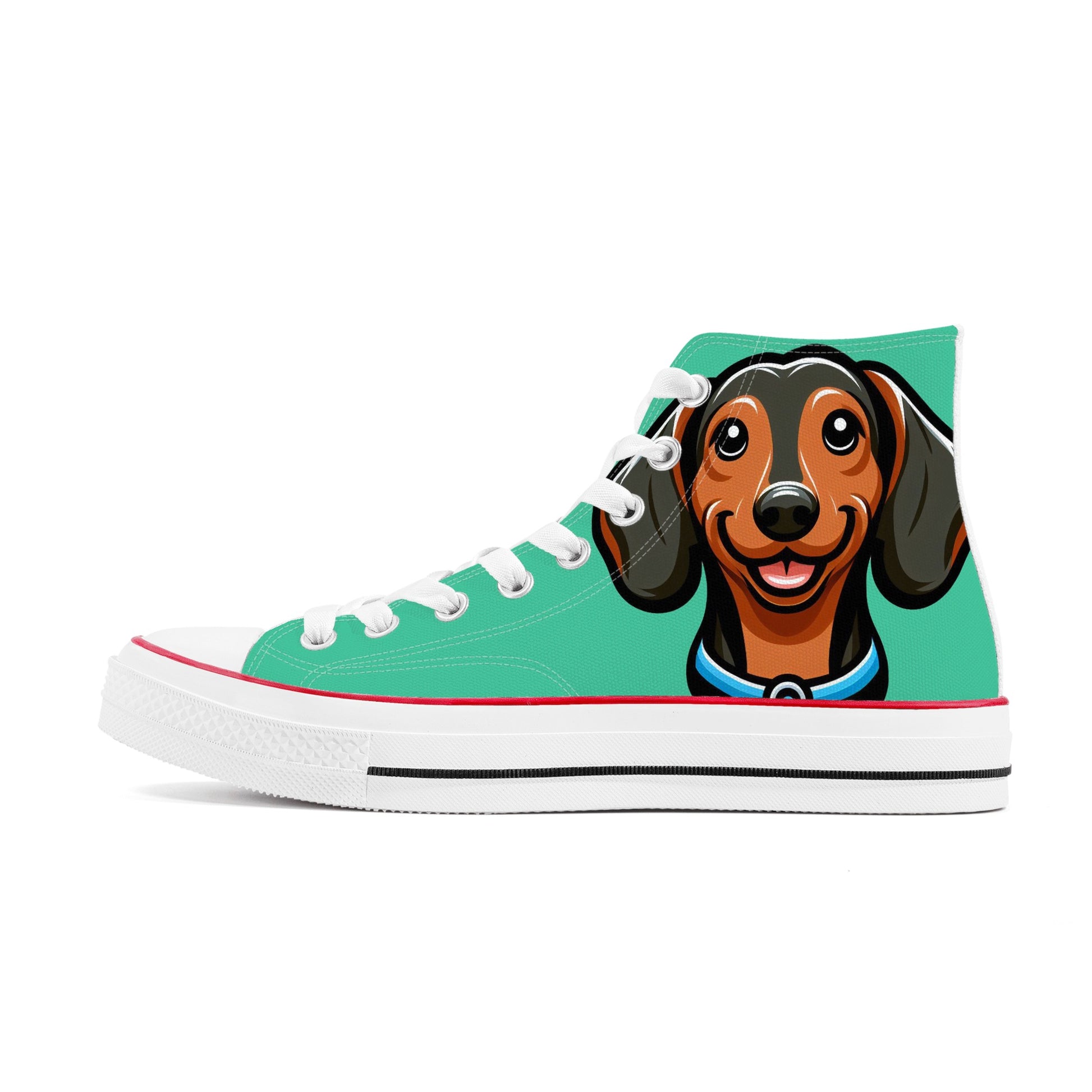 Si te encantan los perros salchicha, los perros encantadores y leales con cuerpos largos y patas cortas, te encantarán estos zapatos personalizados con estampado integral que presentan un divertido diseño de perro salchicha.