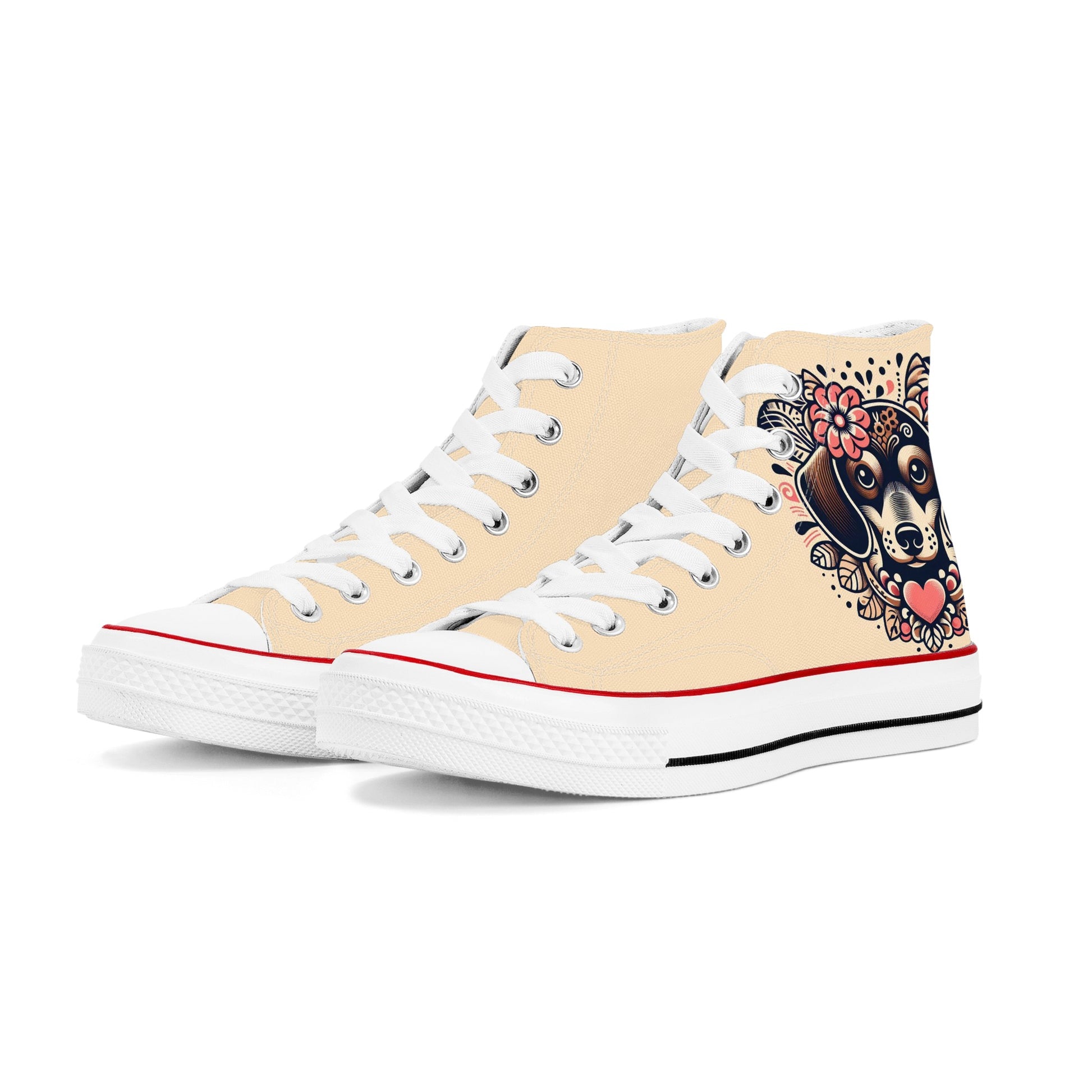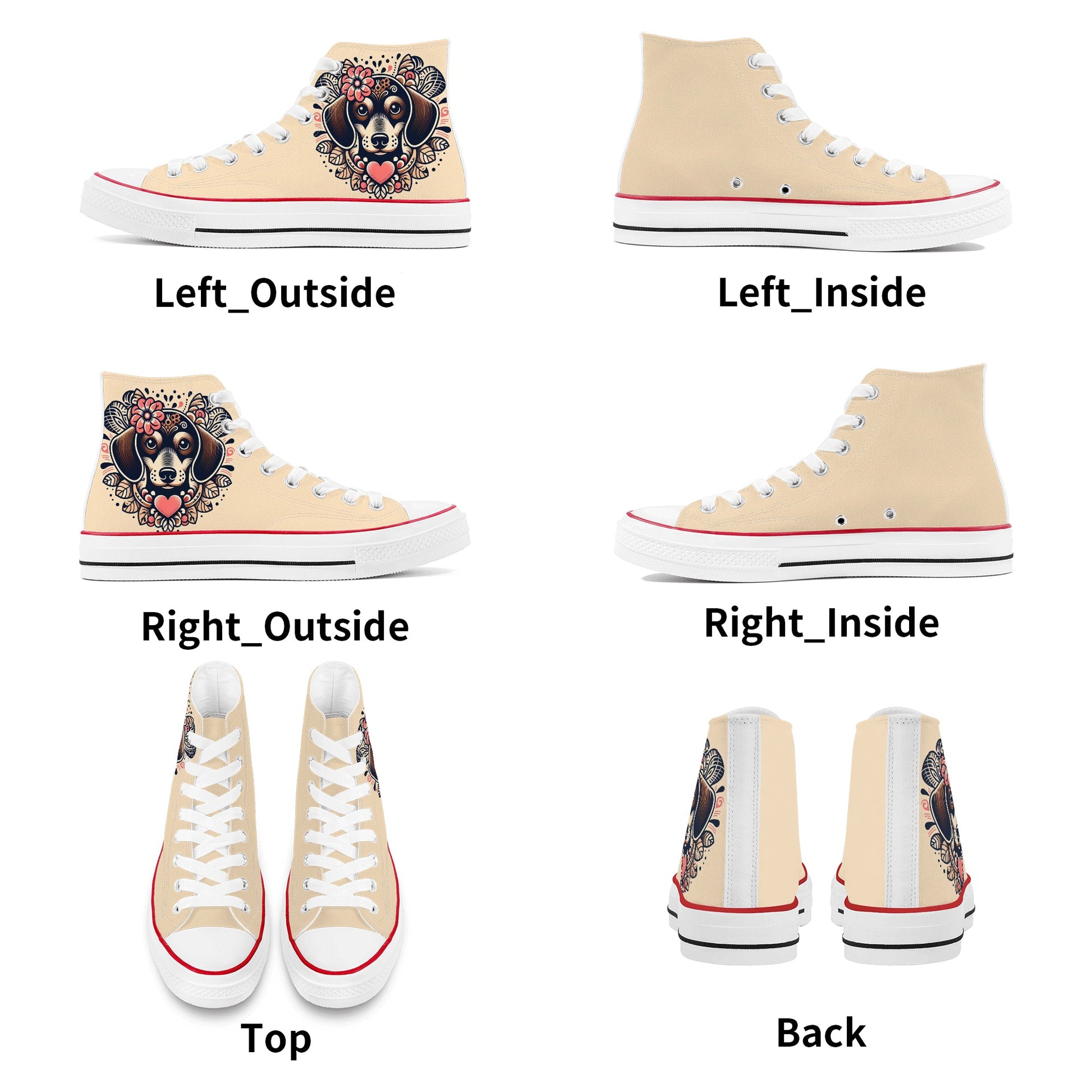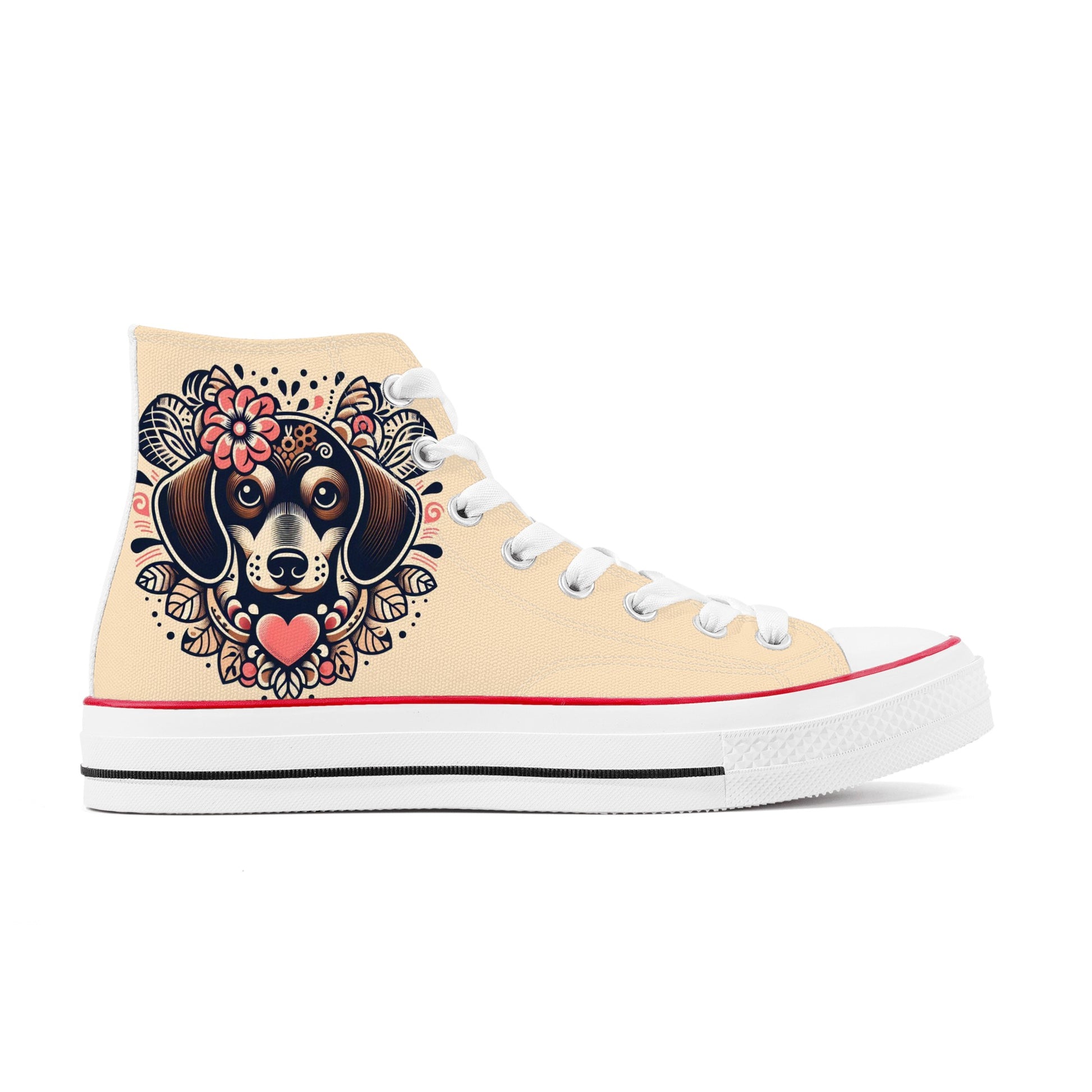 Si te encantan los perros salchicha, los perros encantadores y leales con cuerpos largos y patas cortas, te encantarán estos zapatos personalizados con estampado integral que presentan un divertido diseño de perro salchicha.