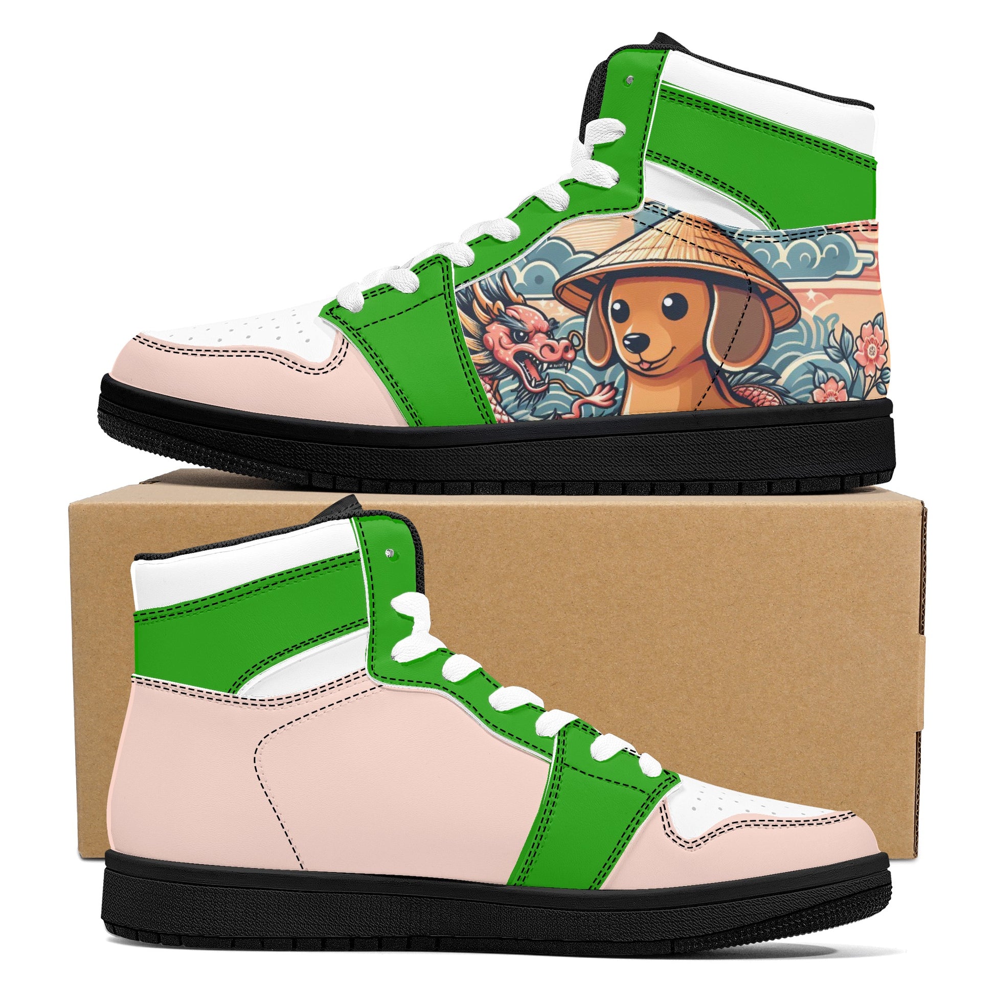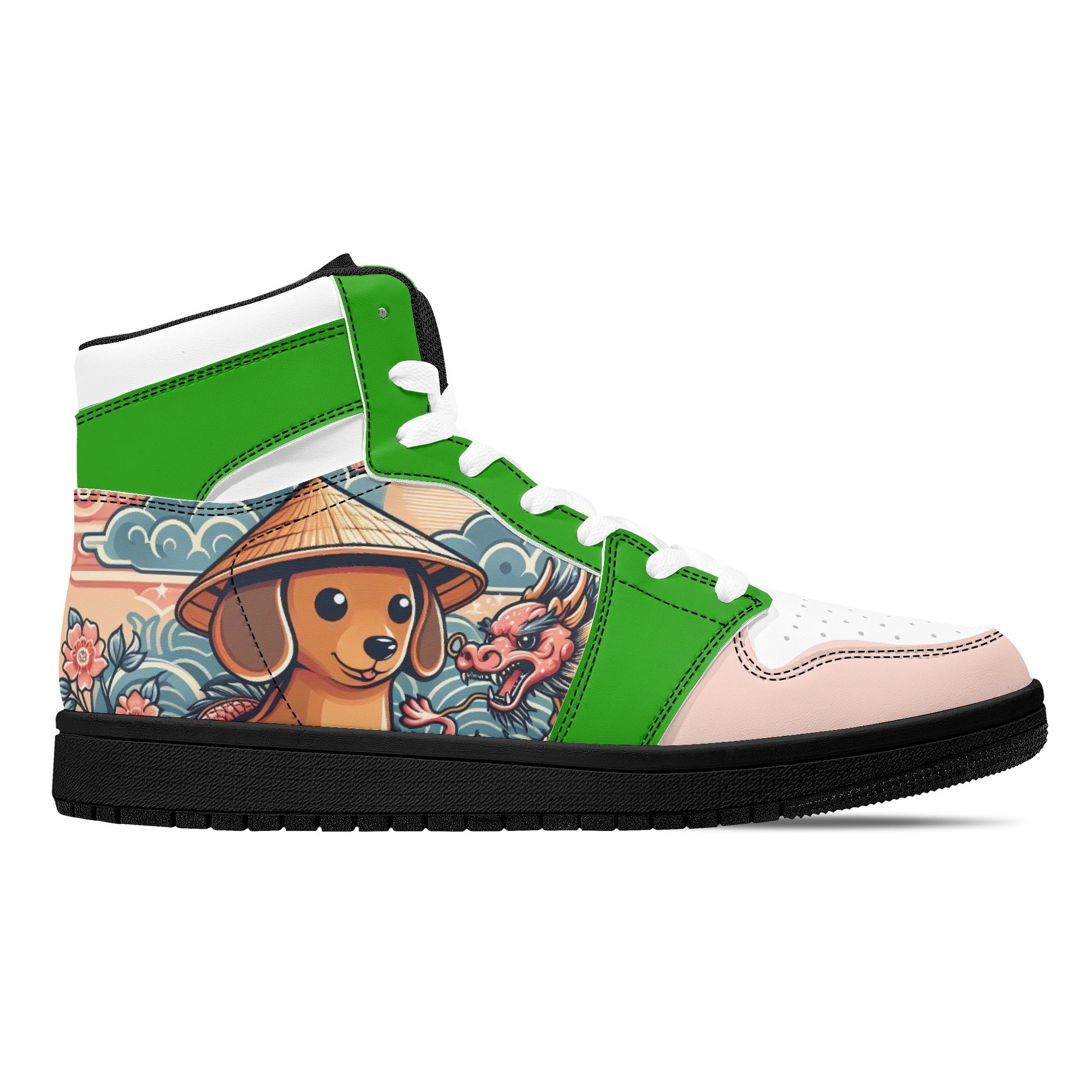 Si es así, te encantarán estos zapatos personalizados con estampado integral que presentan lindas cabezas de perro salchicha en varios colores y patrones.