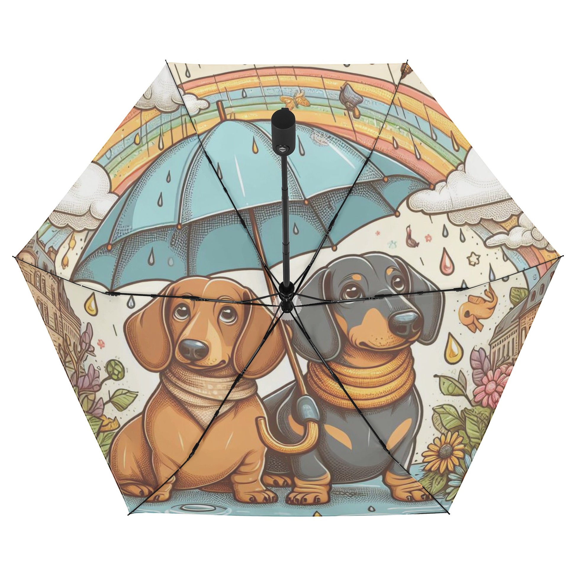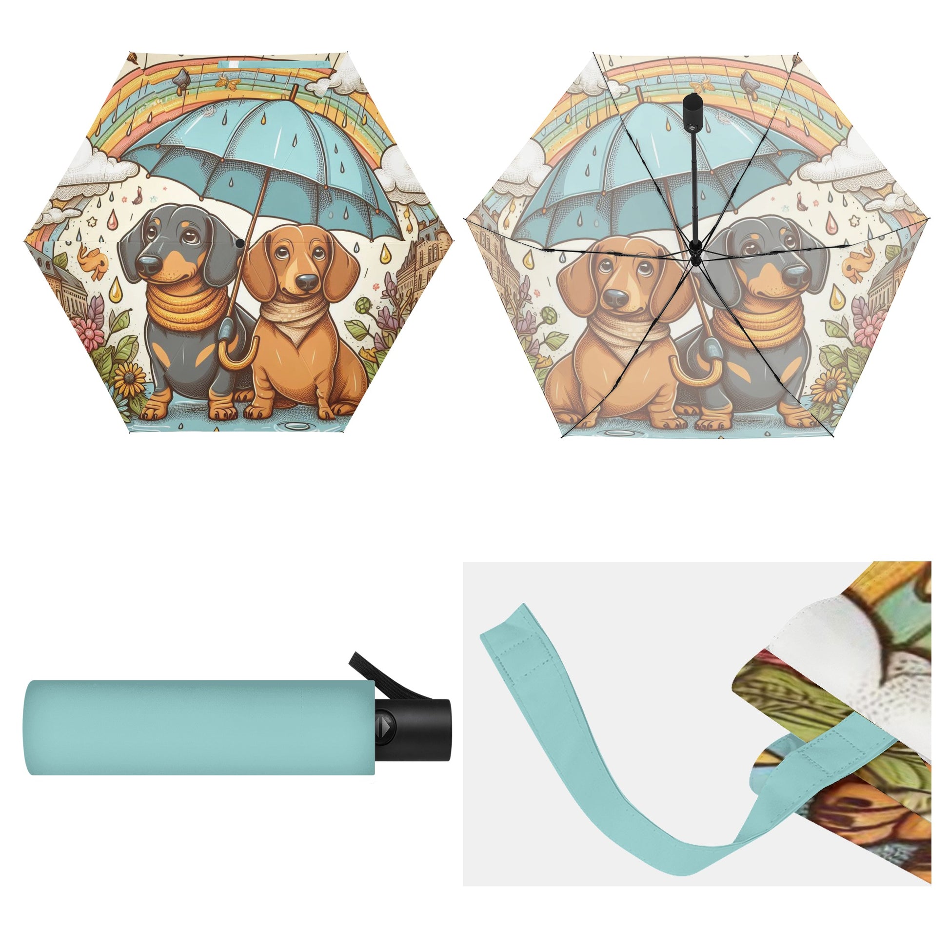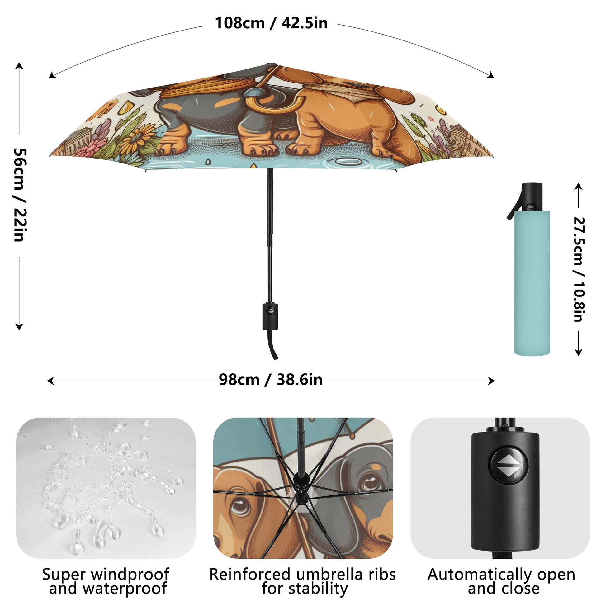 El paraguas se compone de 6 piezas, cada una con un bonito estampado de perro salchicha. También puedes personalizar el cinturón y la funda para que coincidan con tu estilo y preferencia. El paraguas tiene un mecanismo de apertura y cierre automático y un mango de agarre cómodo. Puedes abrirlo y cerrarlo con una mano y disfrutar de una experiencia cómoda y fluida.