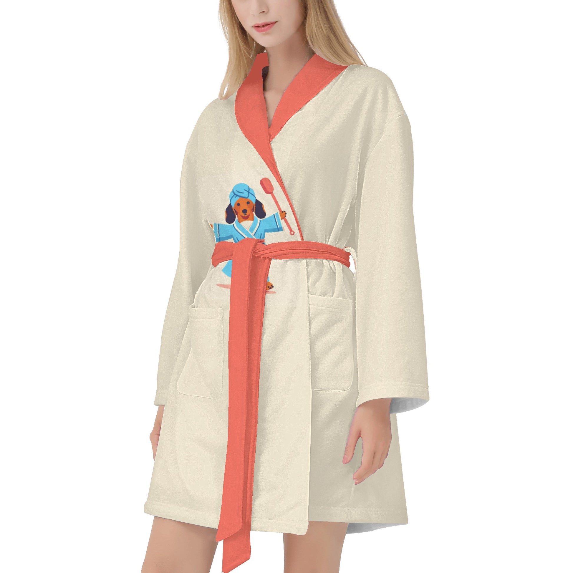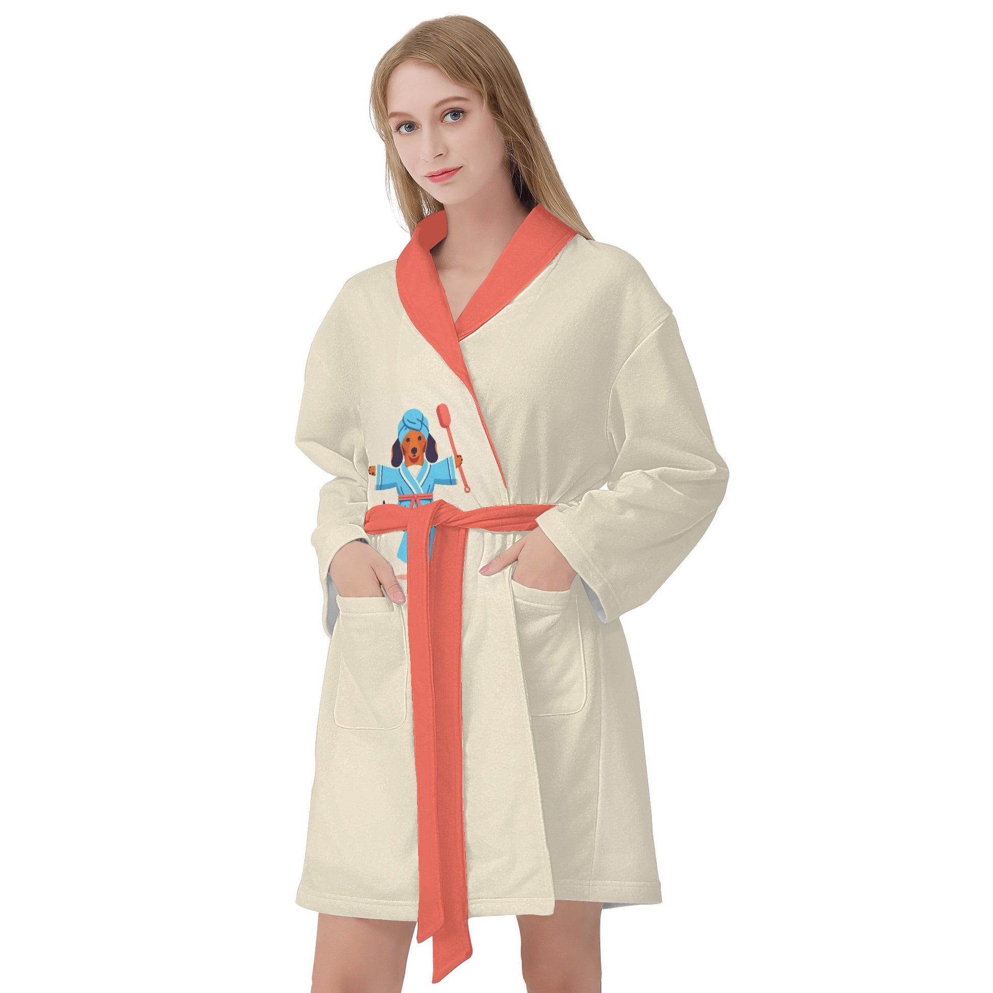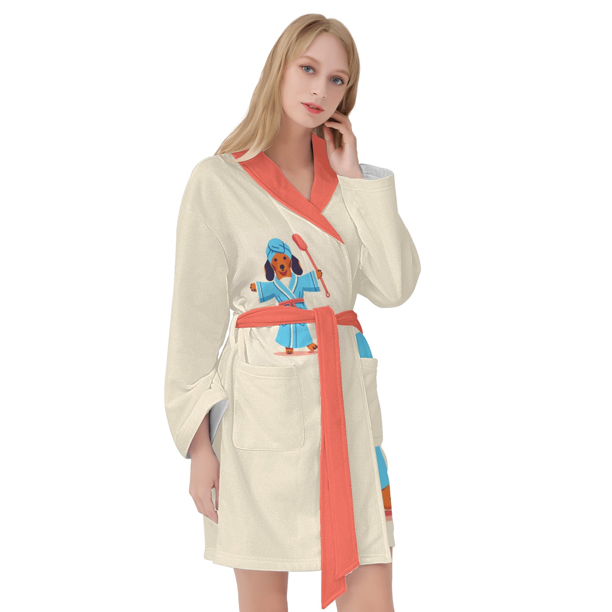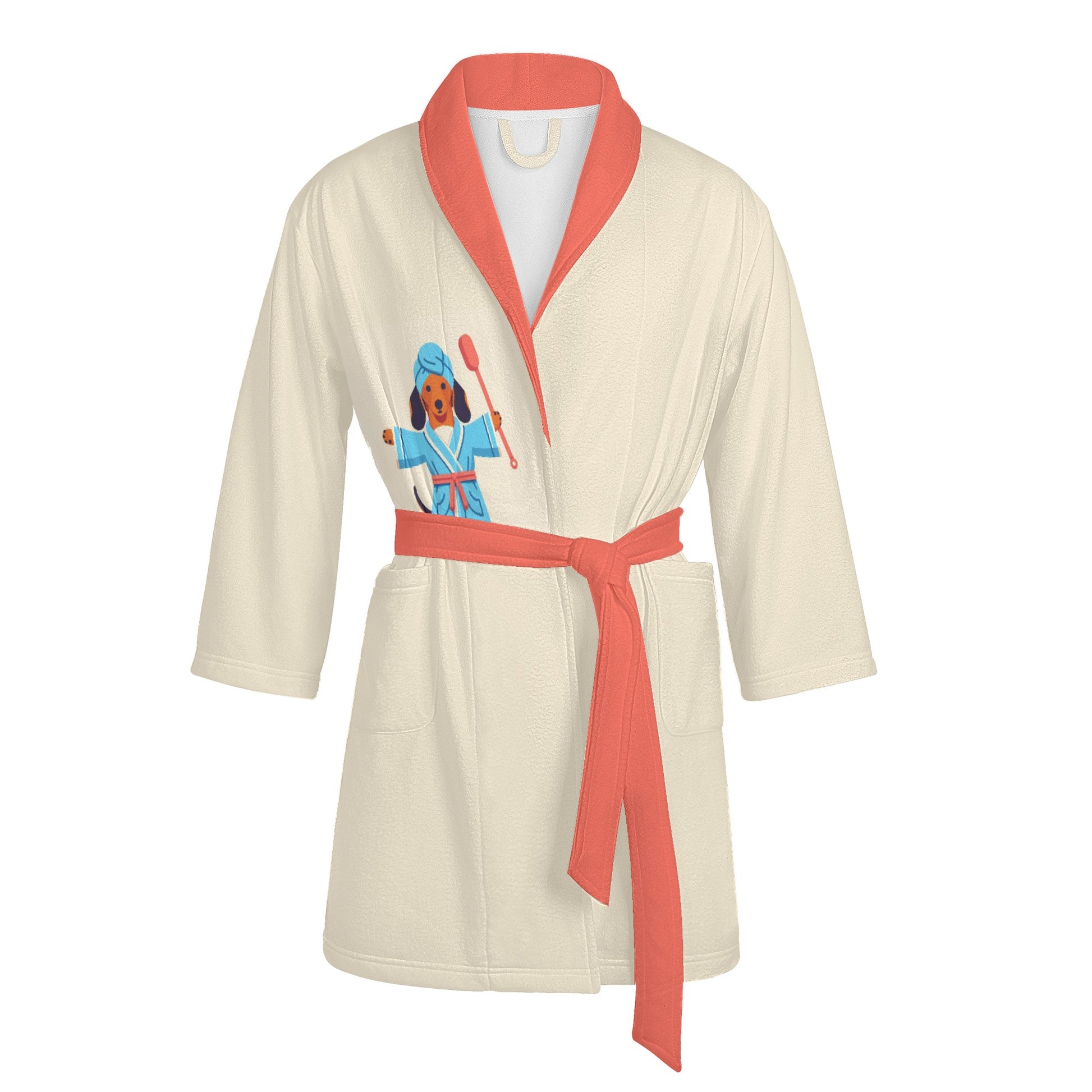 Envuélvete en una comodidad acogedora con esta adorable bata de baño para los amantes de los perros salchicha. Esta bata de baño presenta un lindo patrón de perros salchicha en varios colores y poses, perfecta para cualquier amante de los perros.