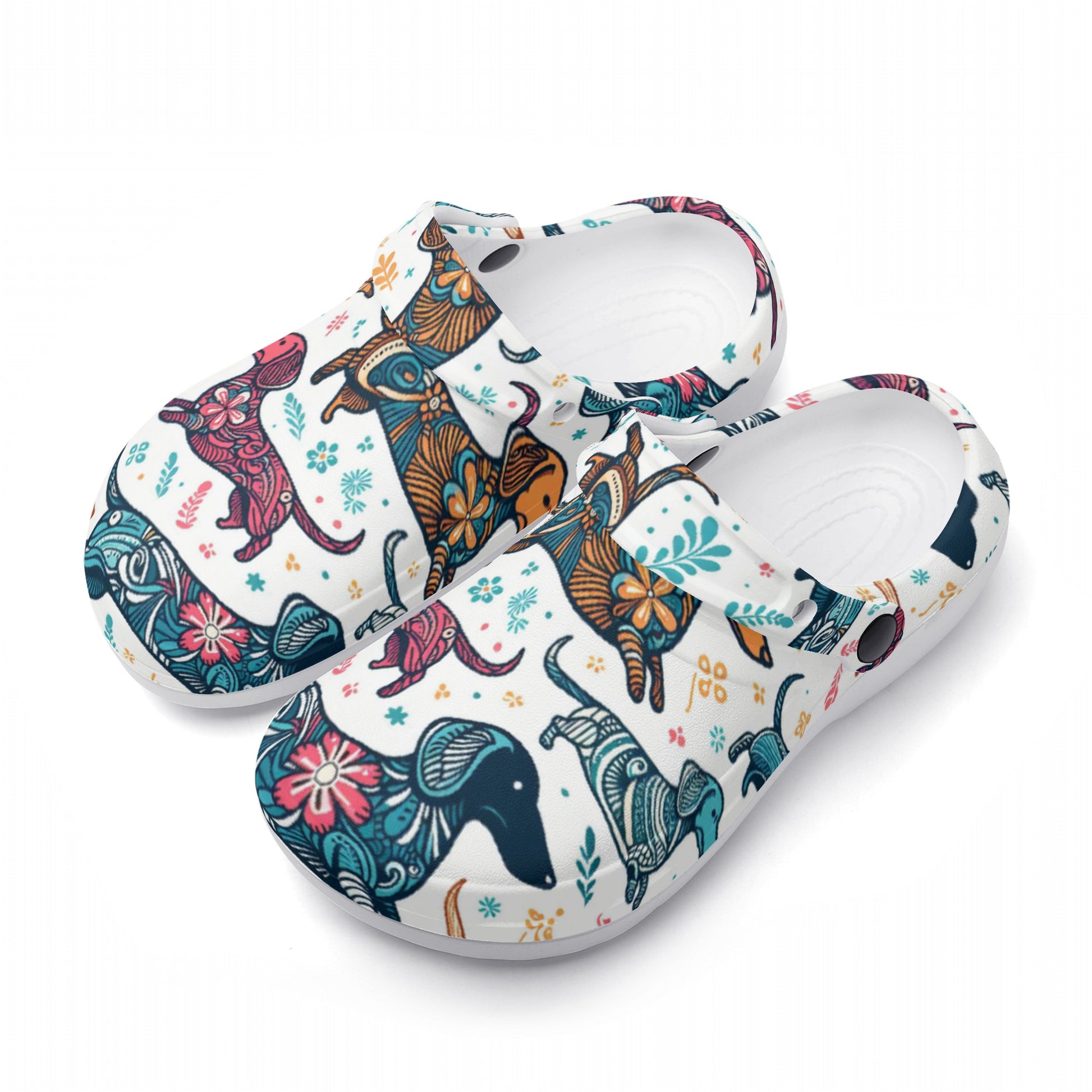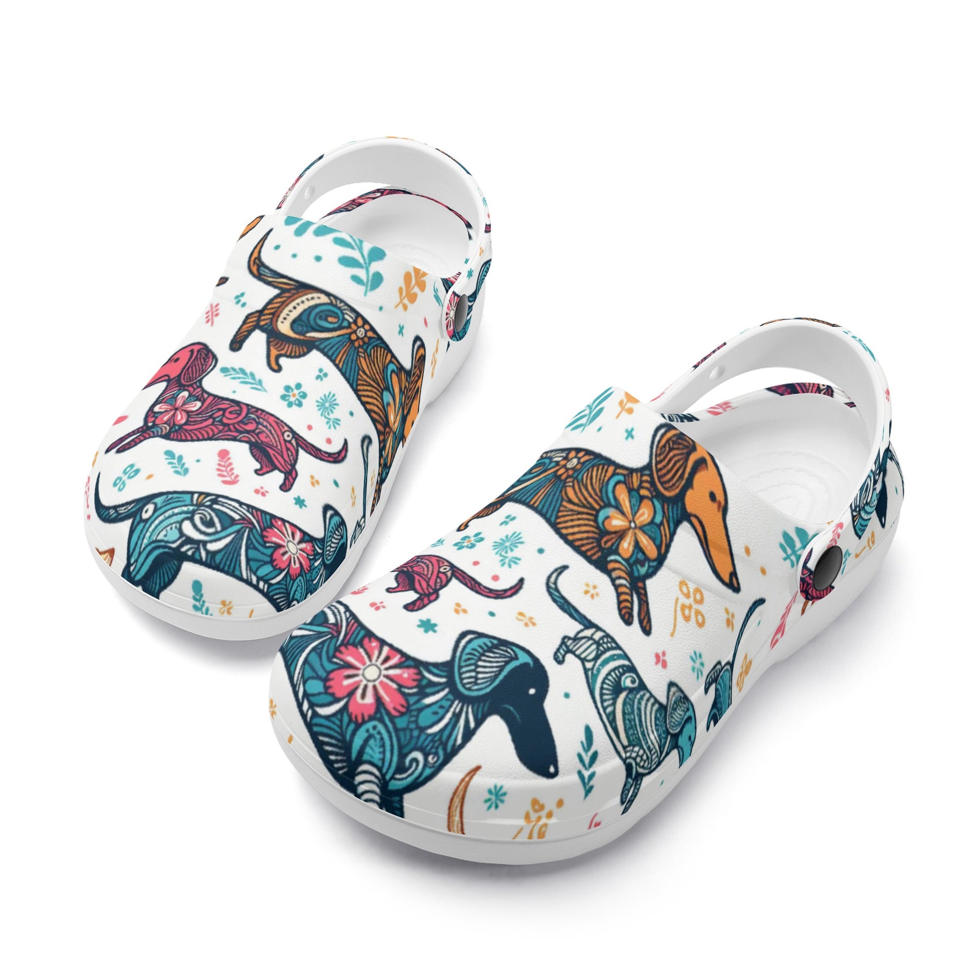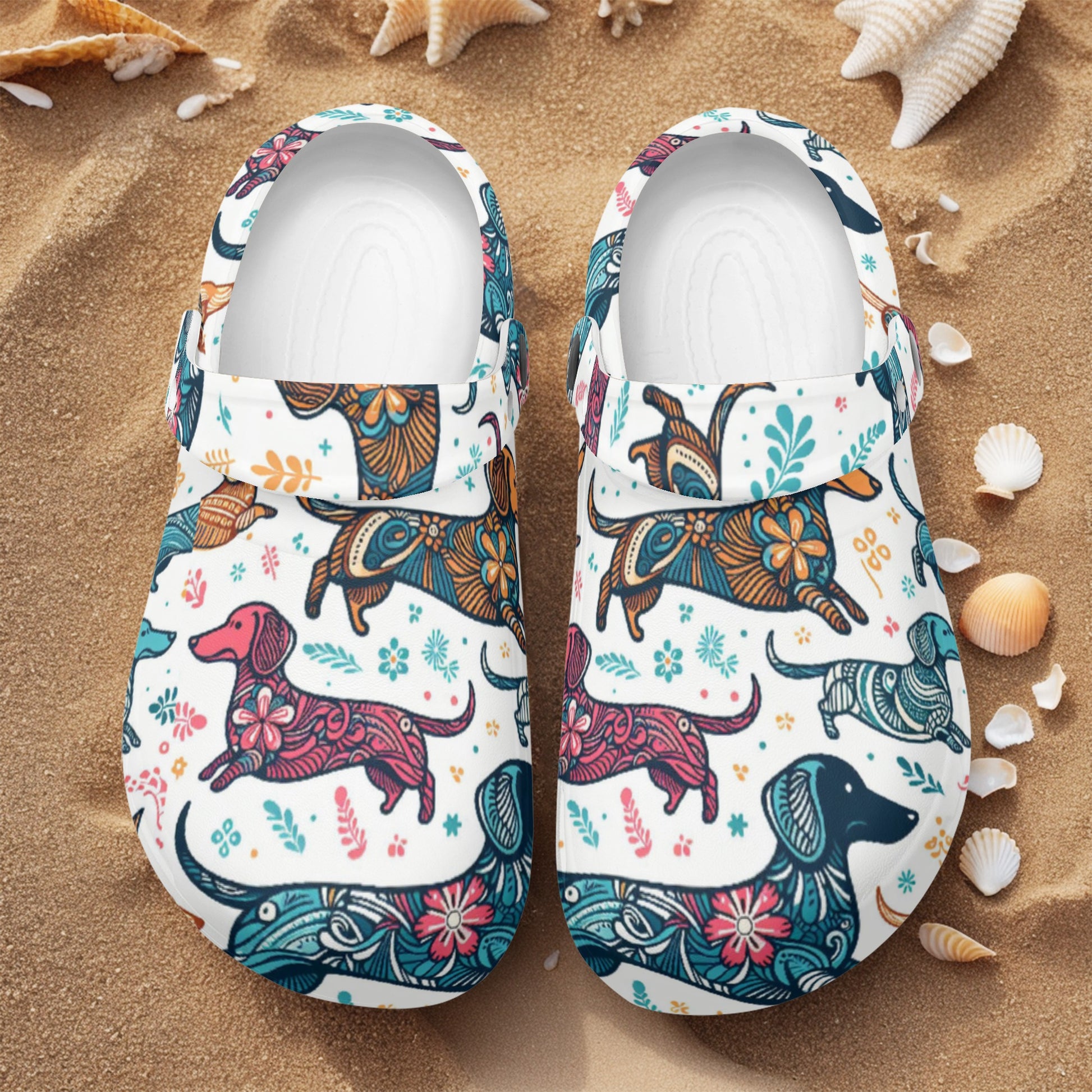 Si estás buscando un par de zuecos cómodos y elegantes que muestren tu amor por los perros salchicha, ¡te encantarán estos zuecos impresos personalizados con varias imágenes de perros salchicha!
