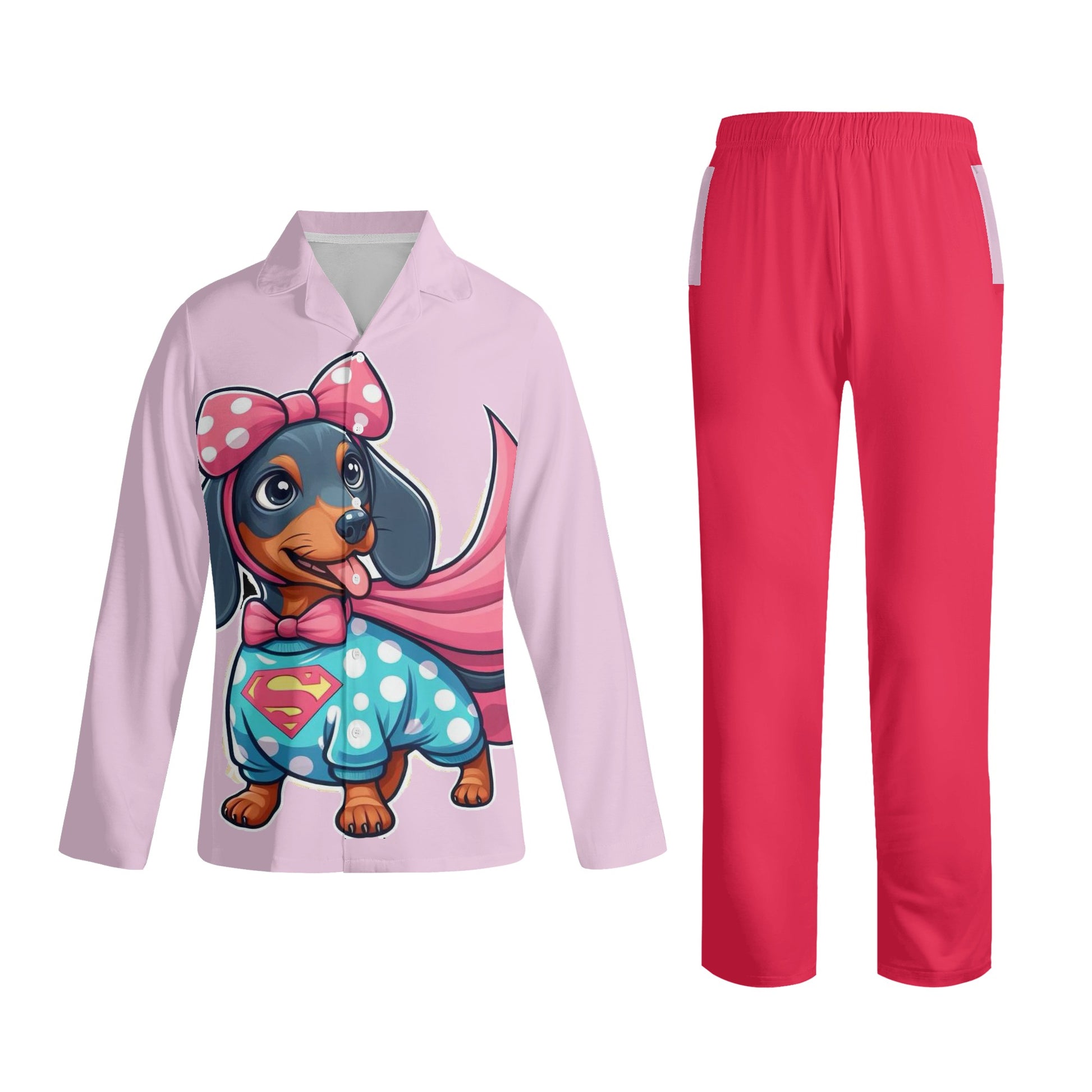 - ¿Amas a los perros salchicha tanto como a nosotros? Si es así, te encantará este conjunto de pijama acogedor y elegante que presenta un lindo y colorido patrón de perro salchicha. Ya sea que estés acurrucándote con tu amigo peludo o relajándote solo, este conjunto de pijama te mantendrá abrigado y cómodo durante toda la noche.