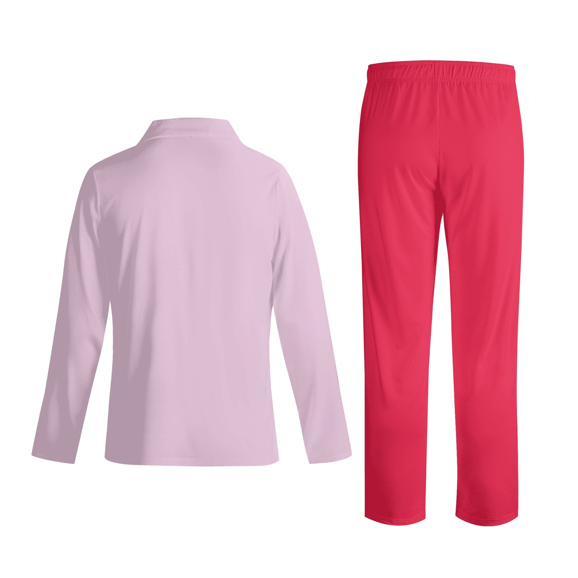 - Este conjunto de pijama está hecho de tela de poliéster premium de alta calidad, que es suave, transpirable y duradera. La parte superior está diseñada para un ajuste relajado y cómodo, permitiendo un fácil movimiento por todo el cuerpo. La parte inferior está confeccionada para brindar un ajuste suave y cómodo en el área de la cadera y el muslo. La camisa de manga larga y los pantalones largos ofrecen una cobertura y calidez óptimas, lo que hace que este conjunto de pijama sea ideal para las noches frías.