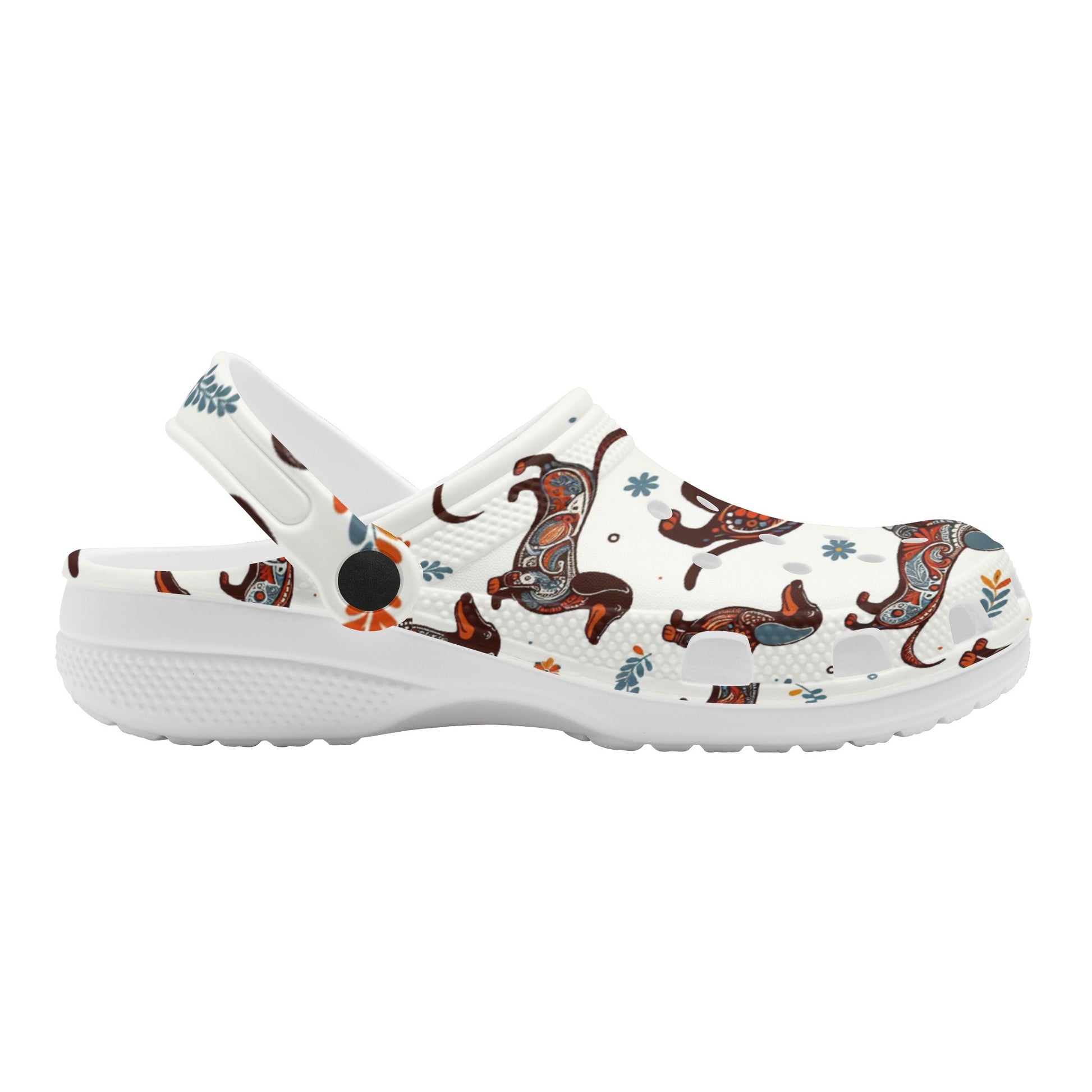 Si eres un amante de los perros salchicha, adorarás estos zuecos personalizados con estampados integrales que presentan encantadoras imágenes de perros salchicha. Estos zuecos no sólo están de moda, sino también cómodos y funcionales. Están hechos de material EVA de alta calidad que es flexible y duradero, y tienen un estilo redondeado y orificios de ventilación para mayor diversión y transpirabilidad. La correa del talón pivotante le permite ponérselos y quitárselos fácilmente y también proporciona un ajuste más seguro. La técnica de impresión por sublimación garantiza colores vibrantes e ideas creativas que harán que tus zuecos destaquen. Ya sea que los uses en casa, en el jardín o en el trabajo, estos zuecos mantendrán tus pies cómodos y tu amor por el perro salchicha fuerte. Para mantenerlos en buenas condiciones, simplemente lávelos a mano en agua fría y séquelos al aire. ¡Pide el tuyo hoy y disfruta de los elogios de otros fanáticos de los perros salchicha!