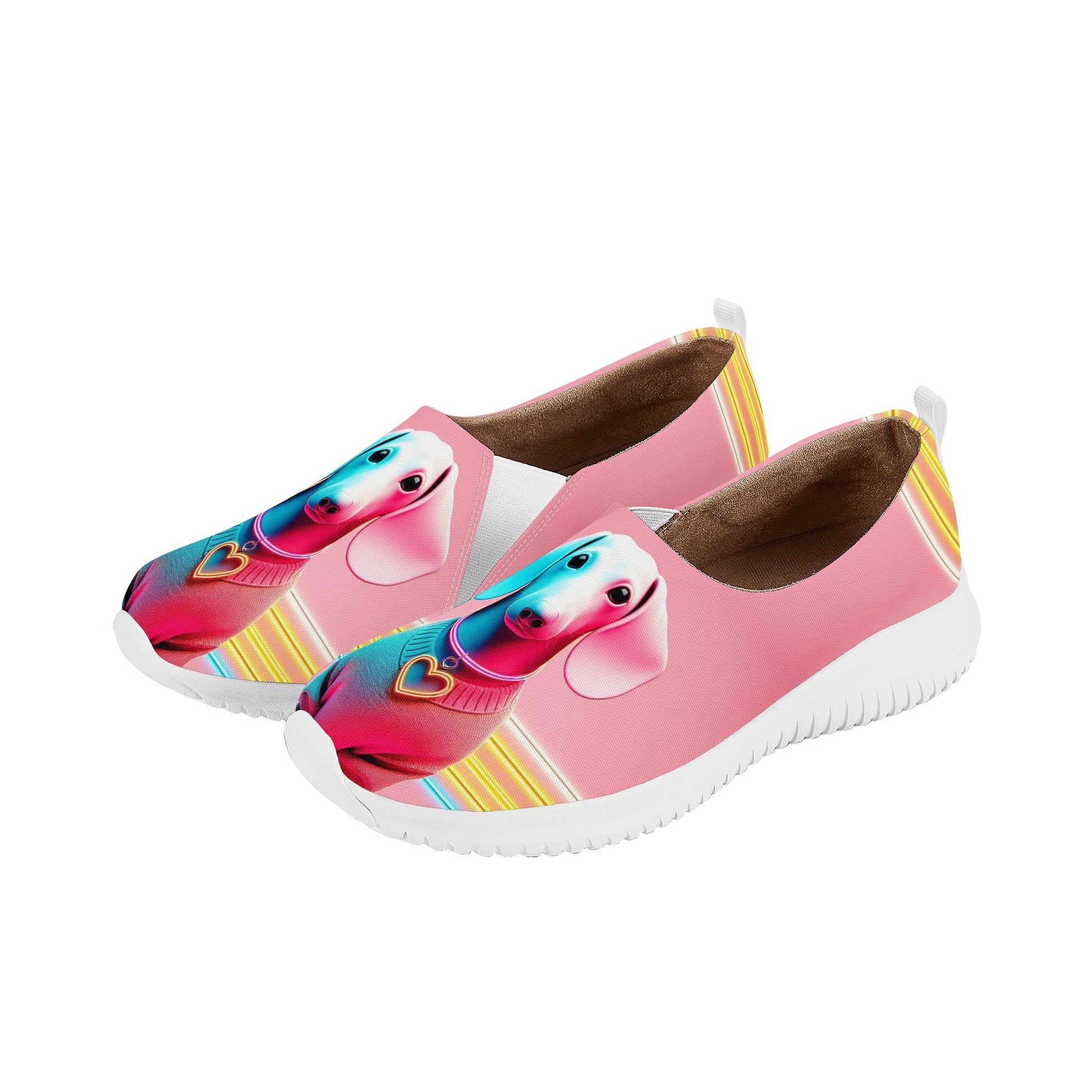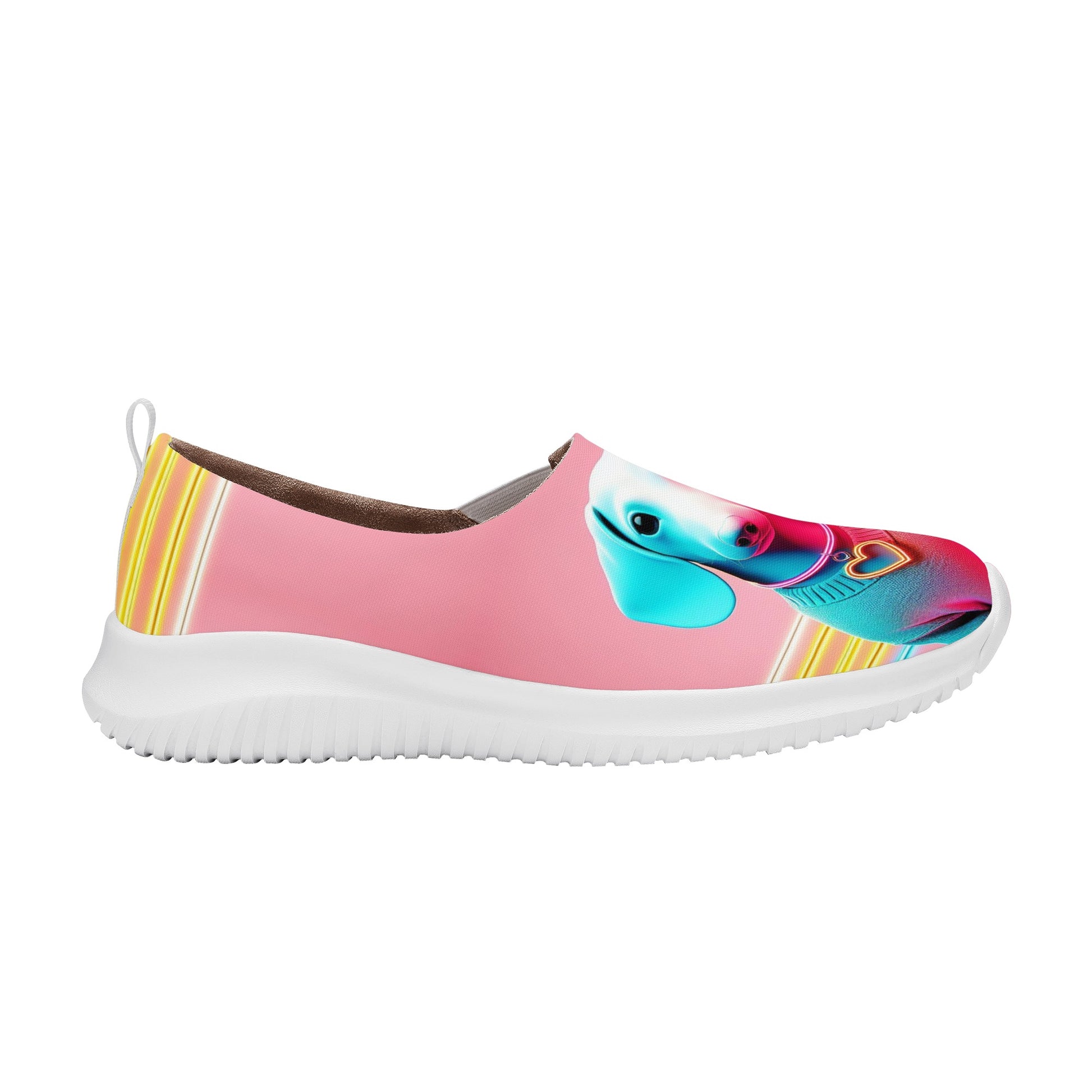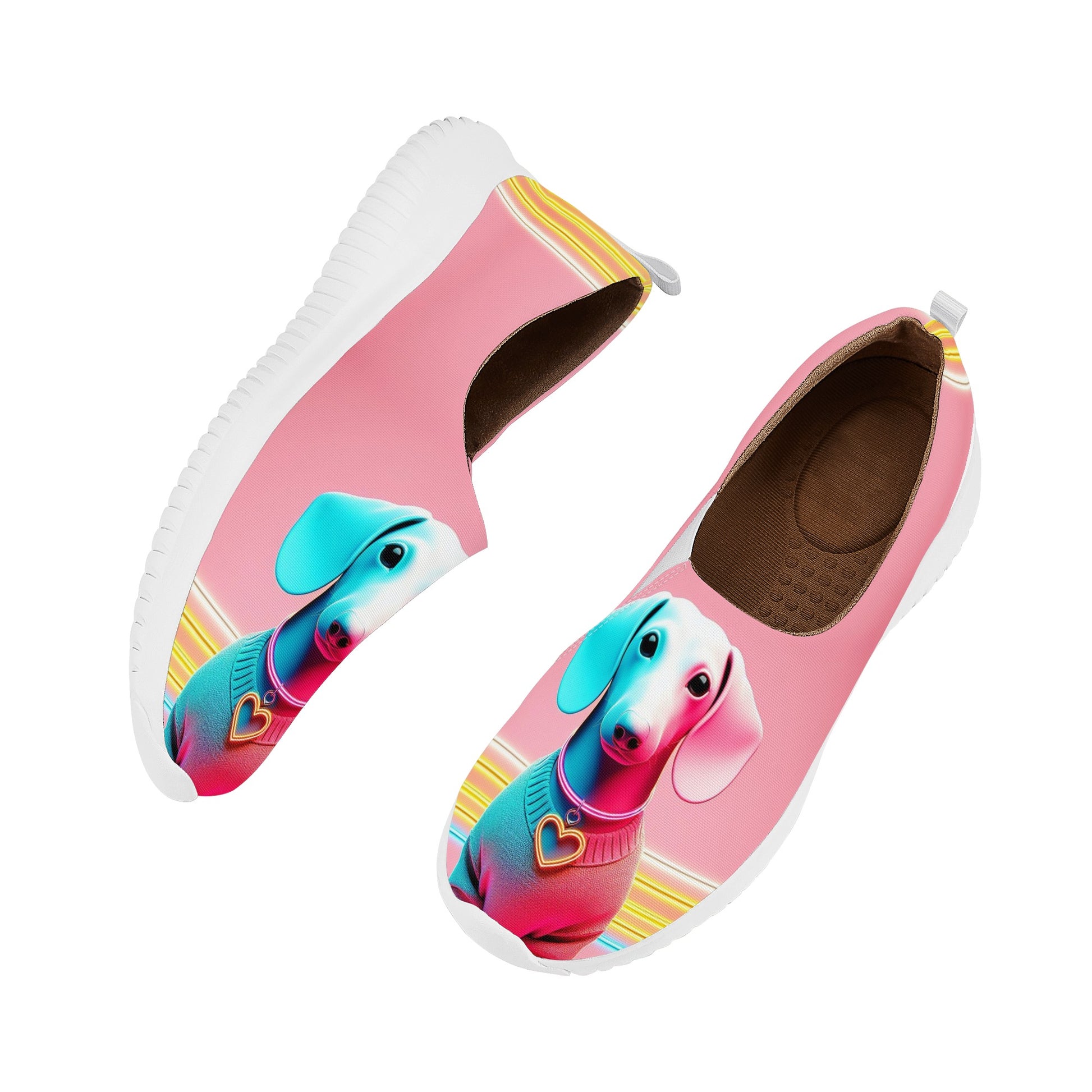 Estos zapatos presentan un estampado personalizado de perros salchicha en varias poses y colores, con un fondo blanco y sin sombras. Están diseñados para ser lindos, extravagantes y divertidos, como tus amigos de cuatro patas.