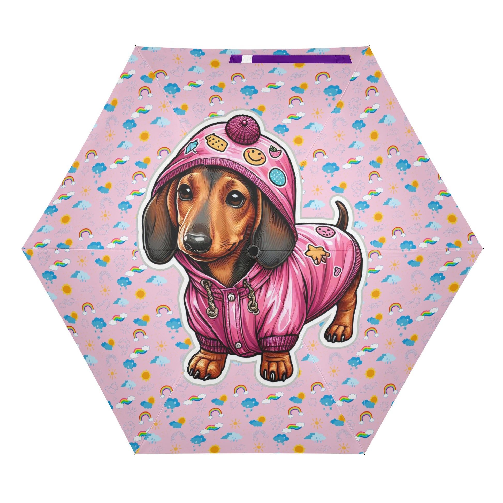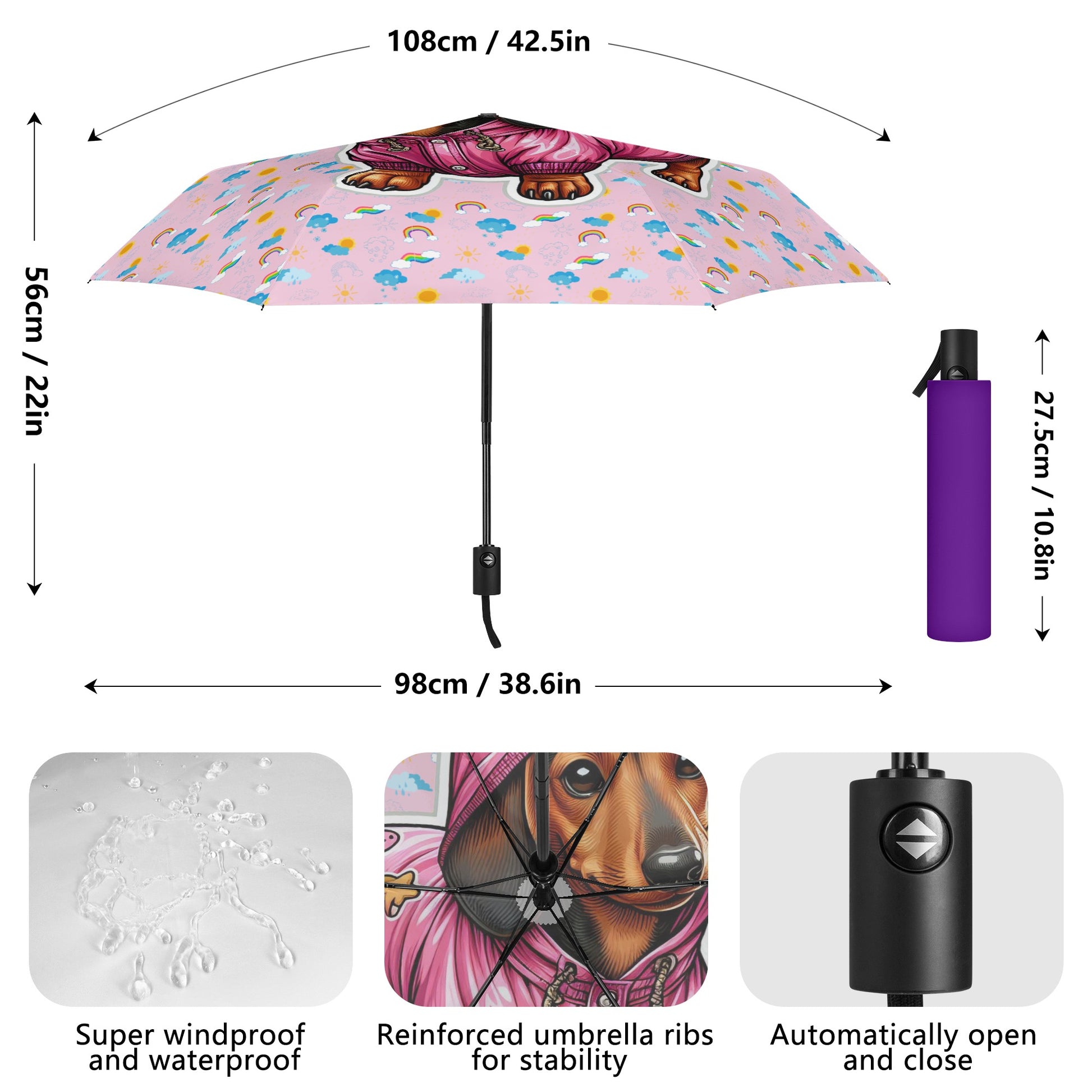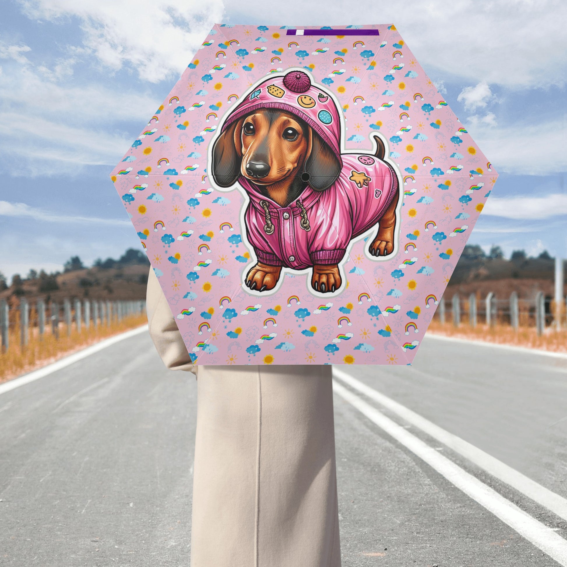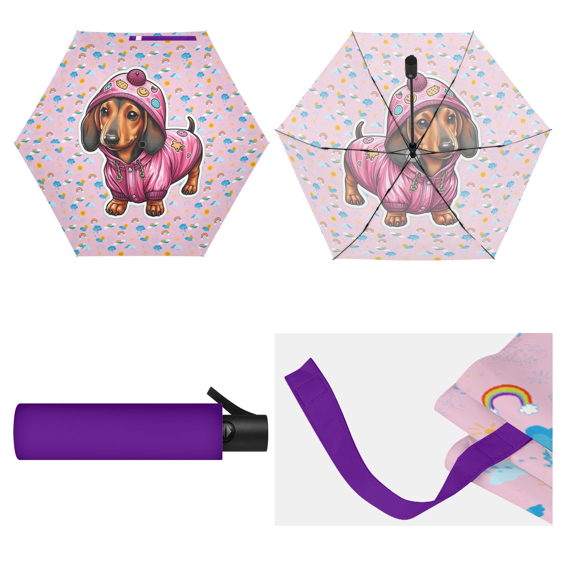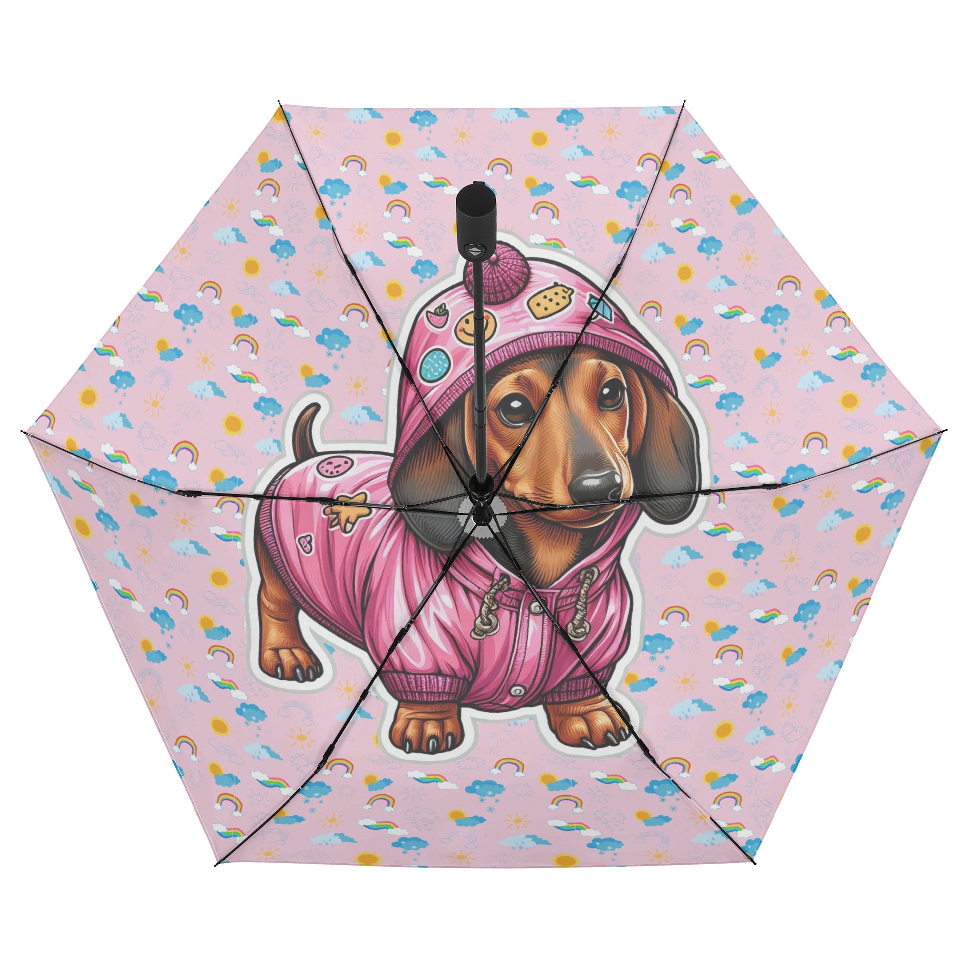 El paraguas se compone de 6 piezas, cada una con un bonito estampado de perro salchicha. También puedes personalizar el cinturón y la funda para que coincidan con tu estilo y preferencia. El paraguas tiene un mecanismo de apertura y cierre automático y un mango de agarre cómodo. Puedes abrirlo y cerrarlo con una mano y disfrutar de una experiencia cómoda y fluida.