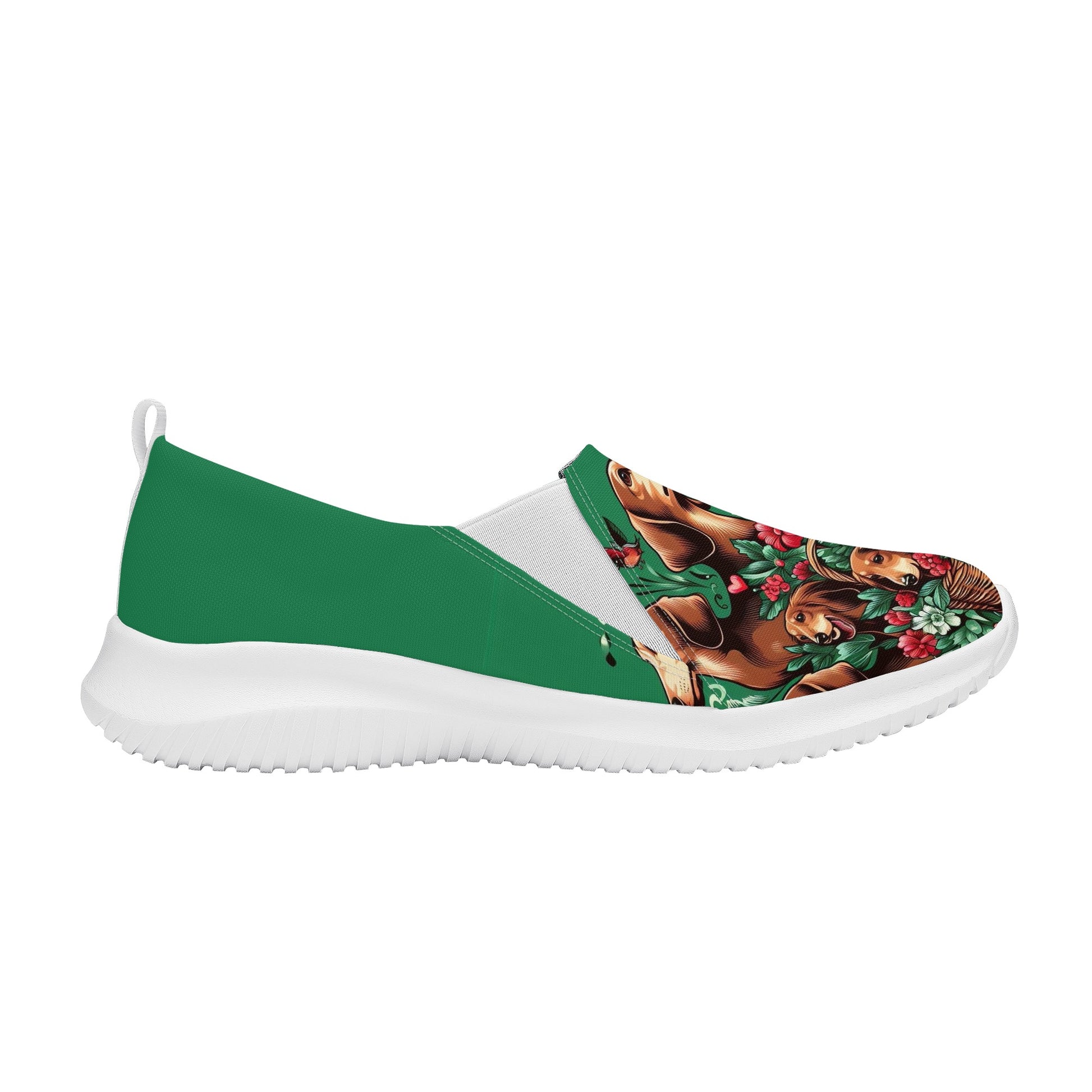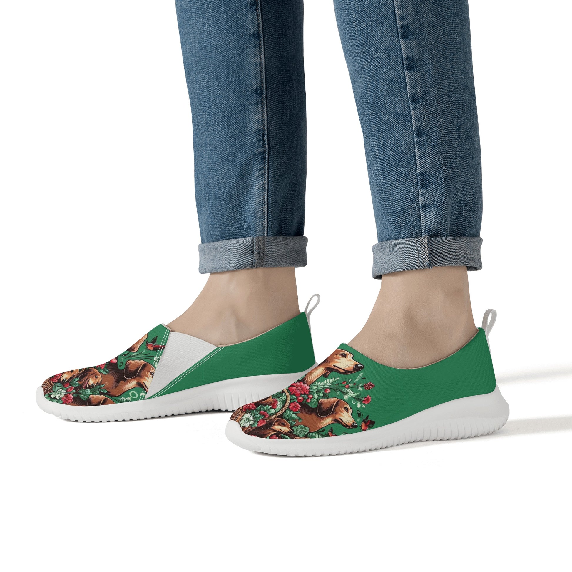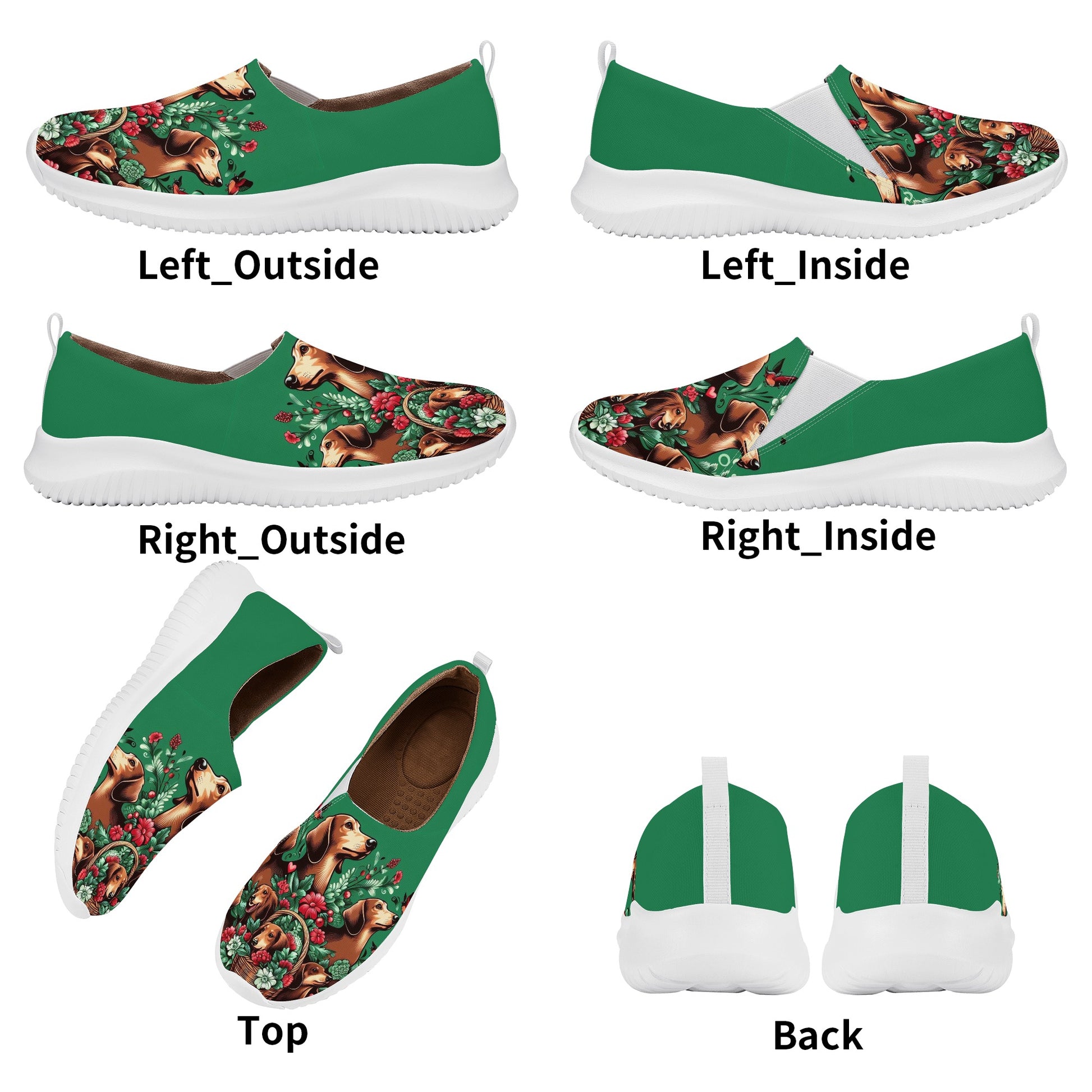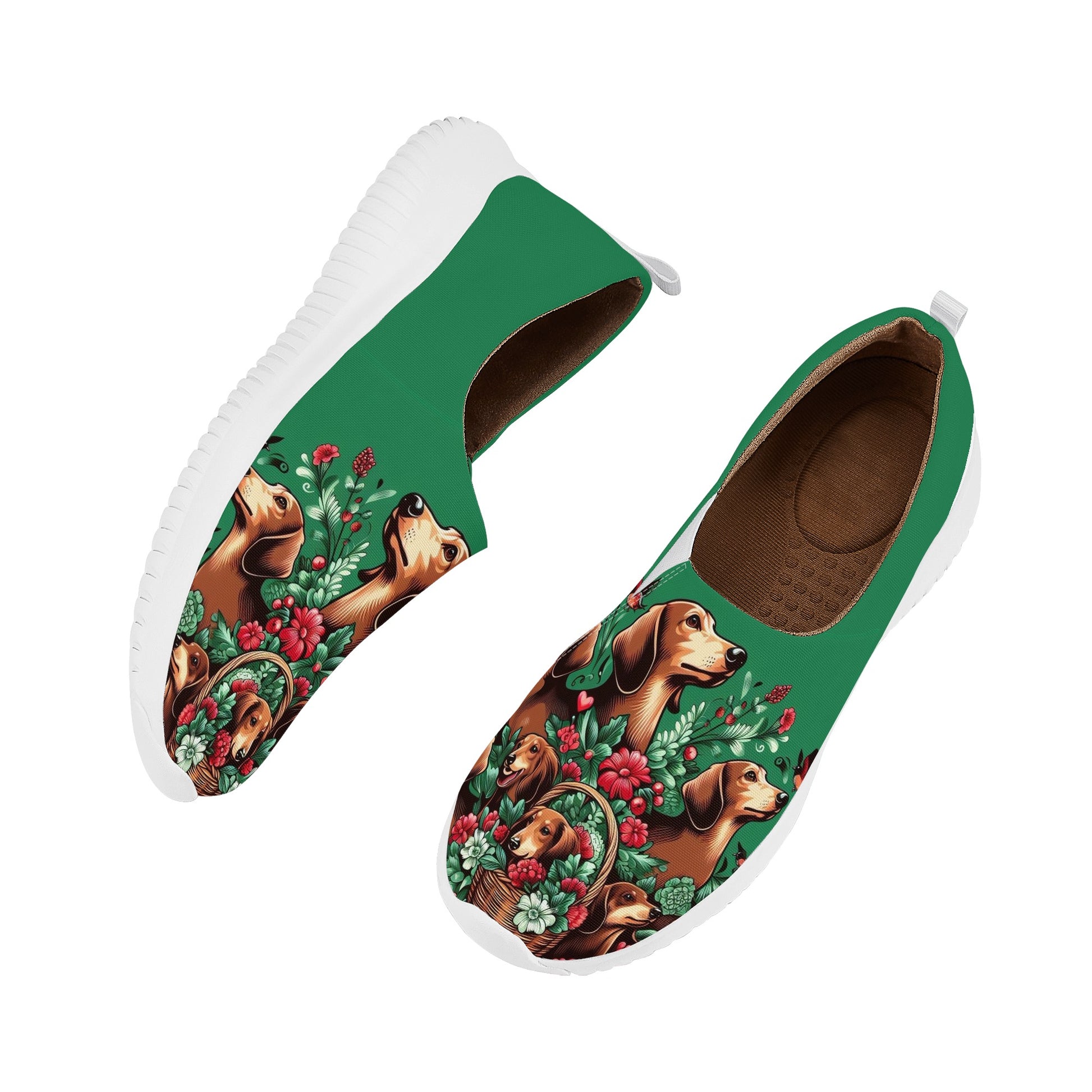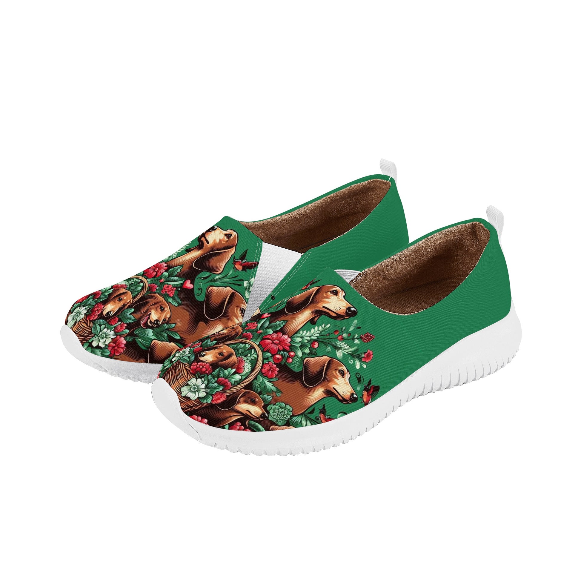 Estos zapatos presentan un estampado personalizado de perros salchicha en varias poses y colores, con un fondo blanco y sin sombras. Están diseñados para ser lindos, extravagantes y divertidos, como tus amigos de cuatro patas.