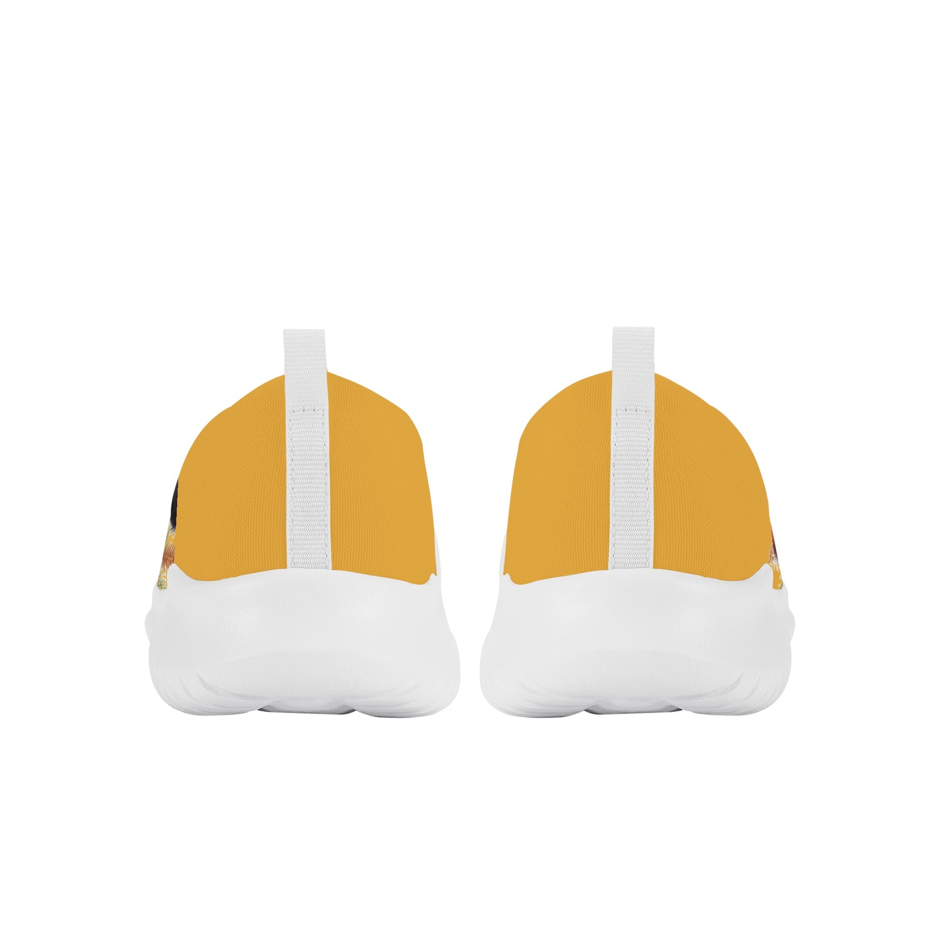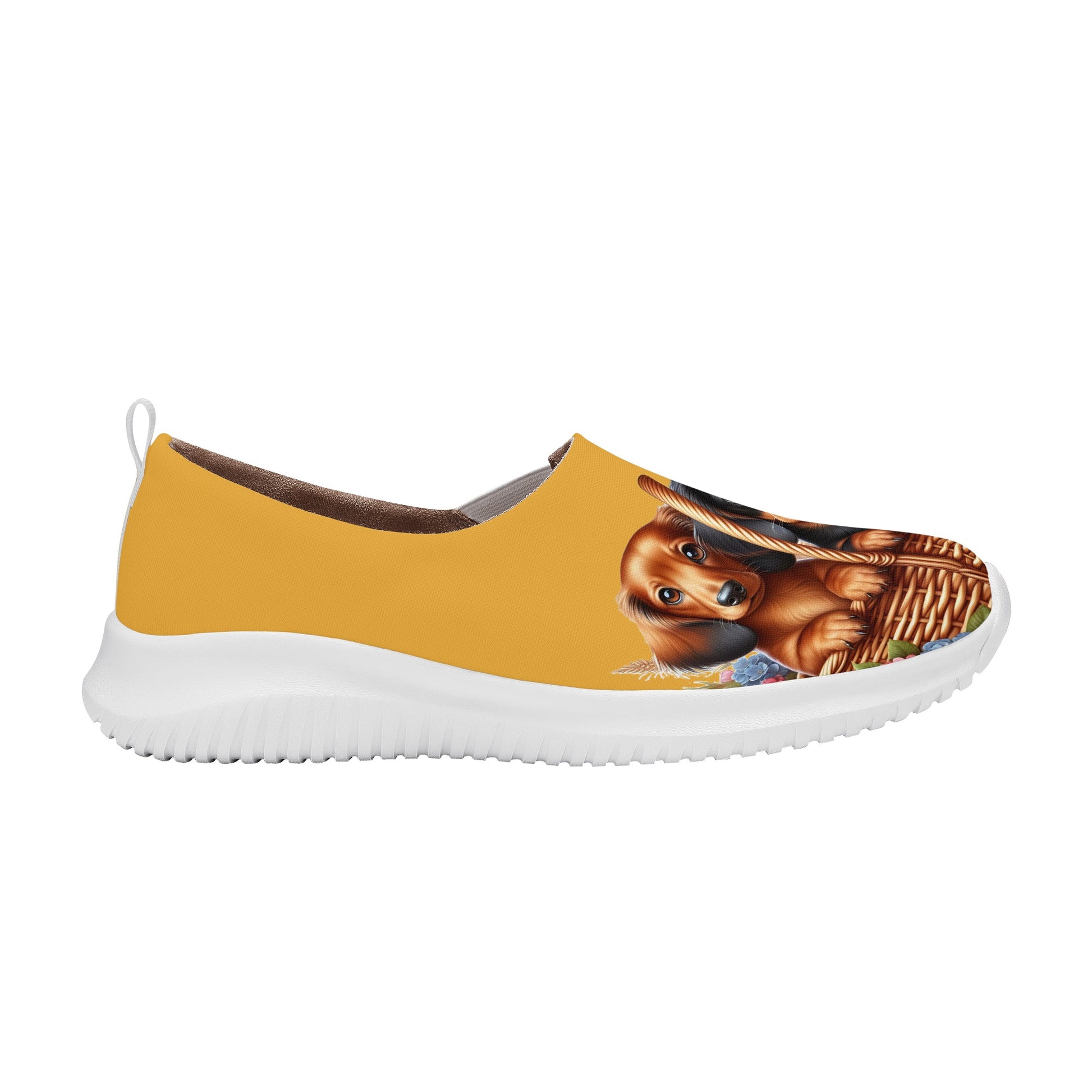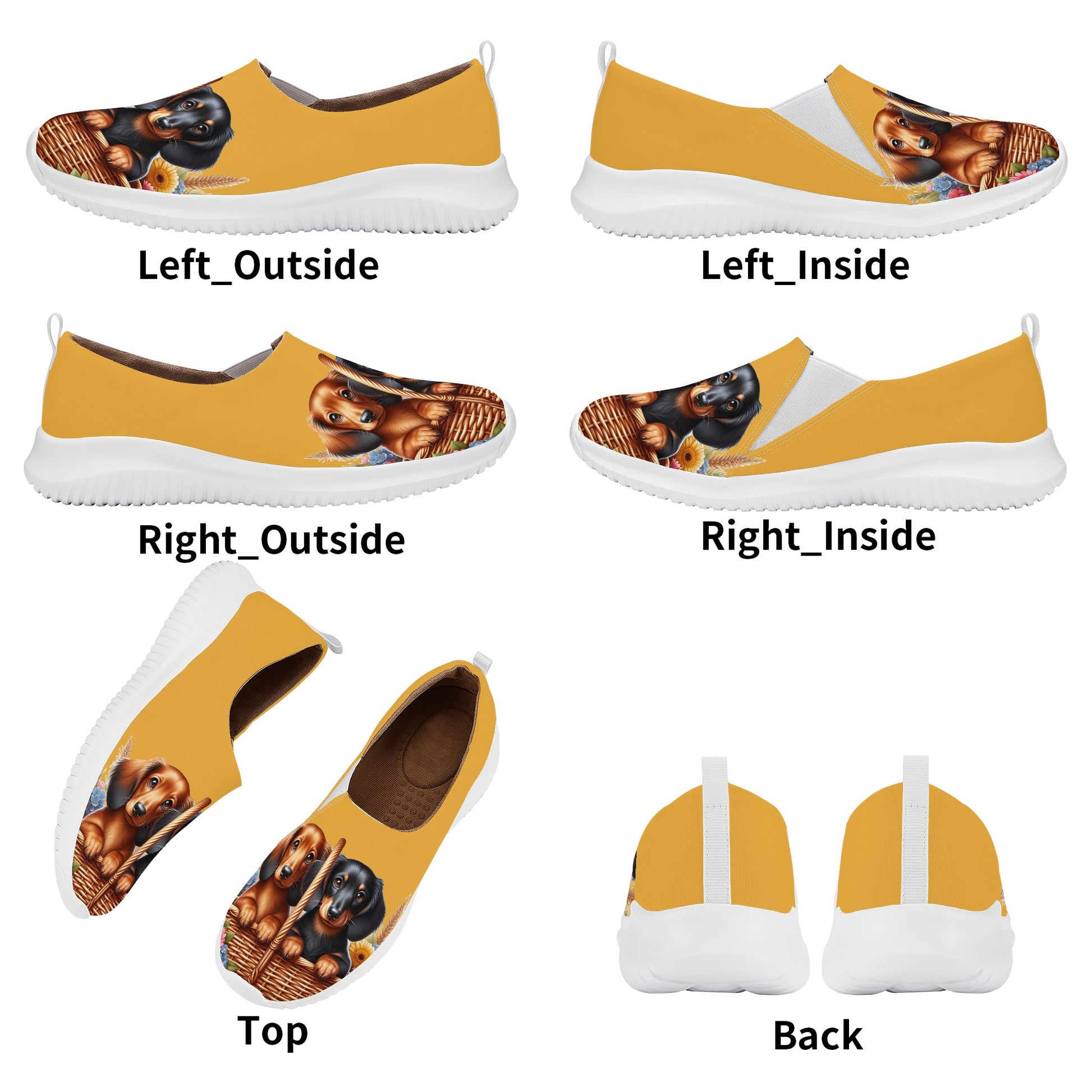 Estos zapatos presentan un estampado personalizado de perros salchicha en varias poses y colores, con un fondo blanco y sin sombras. Están diseñados para ser lindos, extravagantes y divertidos, como tus amigos de cuatro patas.