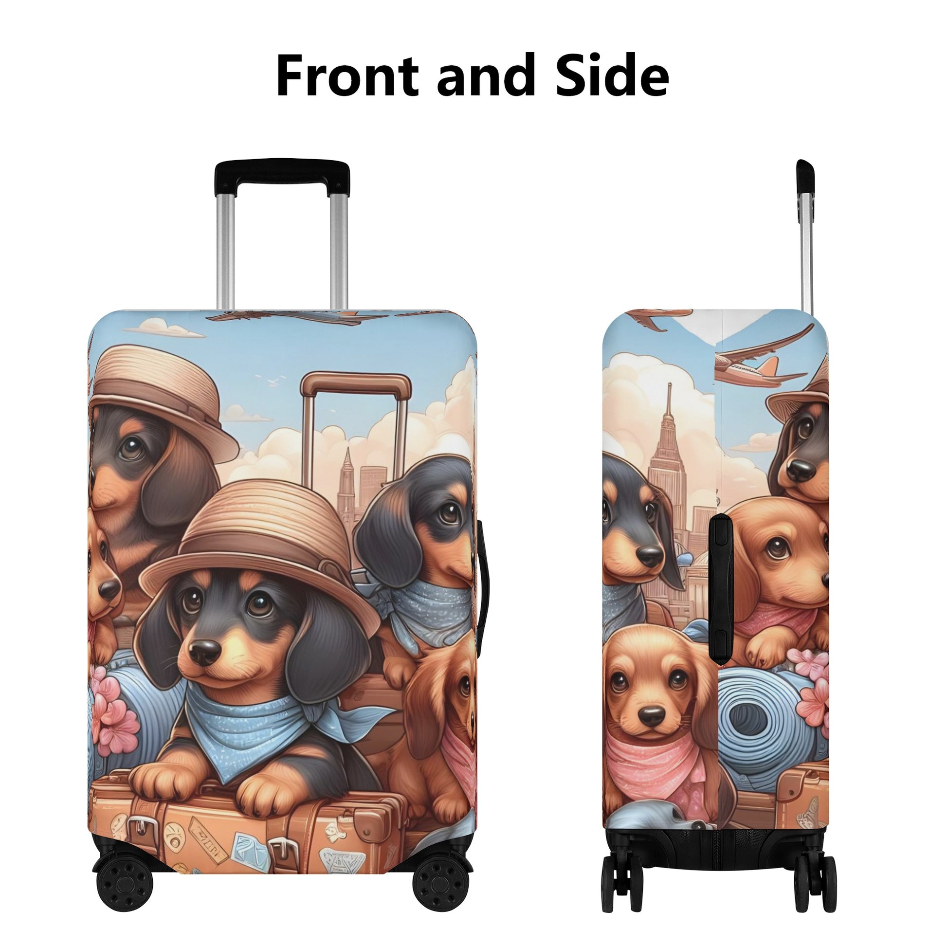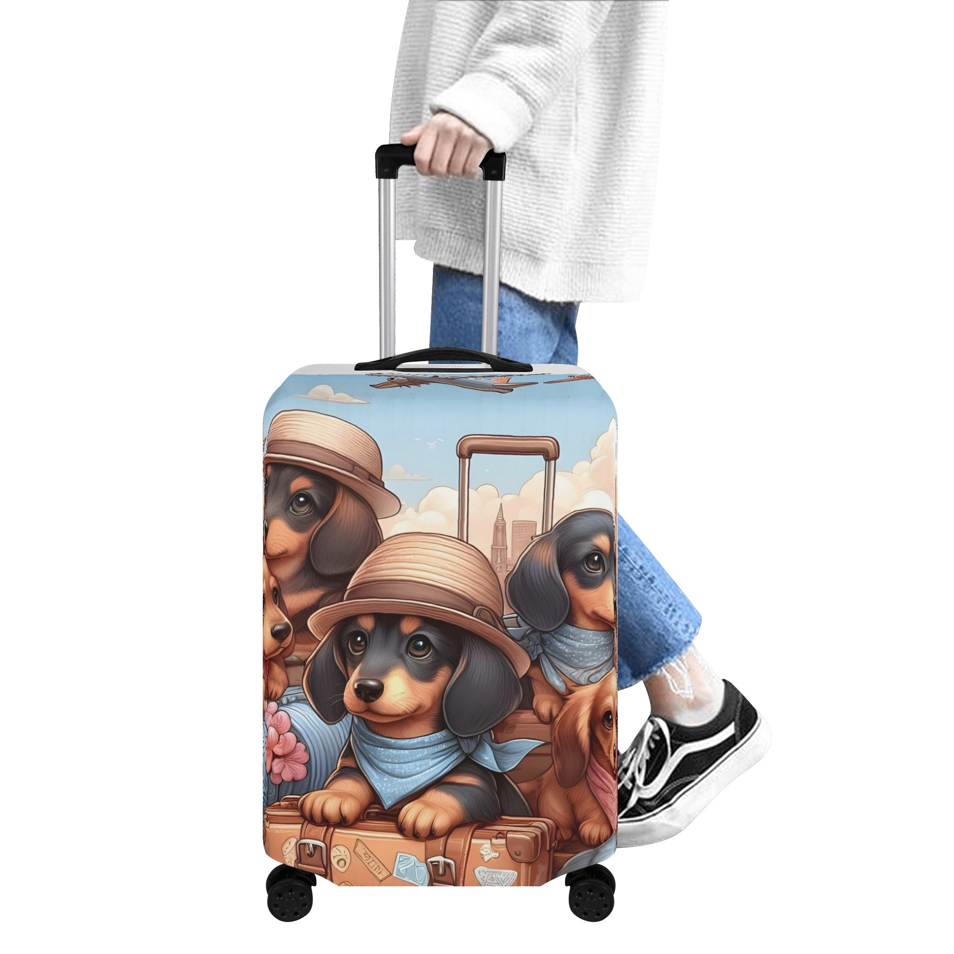 Abrace los viajes con nuestra funda para equipaje con temática de Dachshund . Fabricada con una mezcla duradera de poliéster y lona, protege contra el desgaste de los viajes y las inclemencias del tiempo. Disponible en tallas S a XL, se adapta a cada viaje.