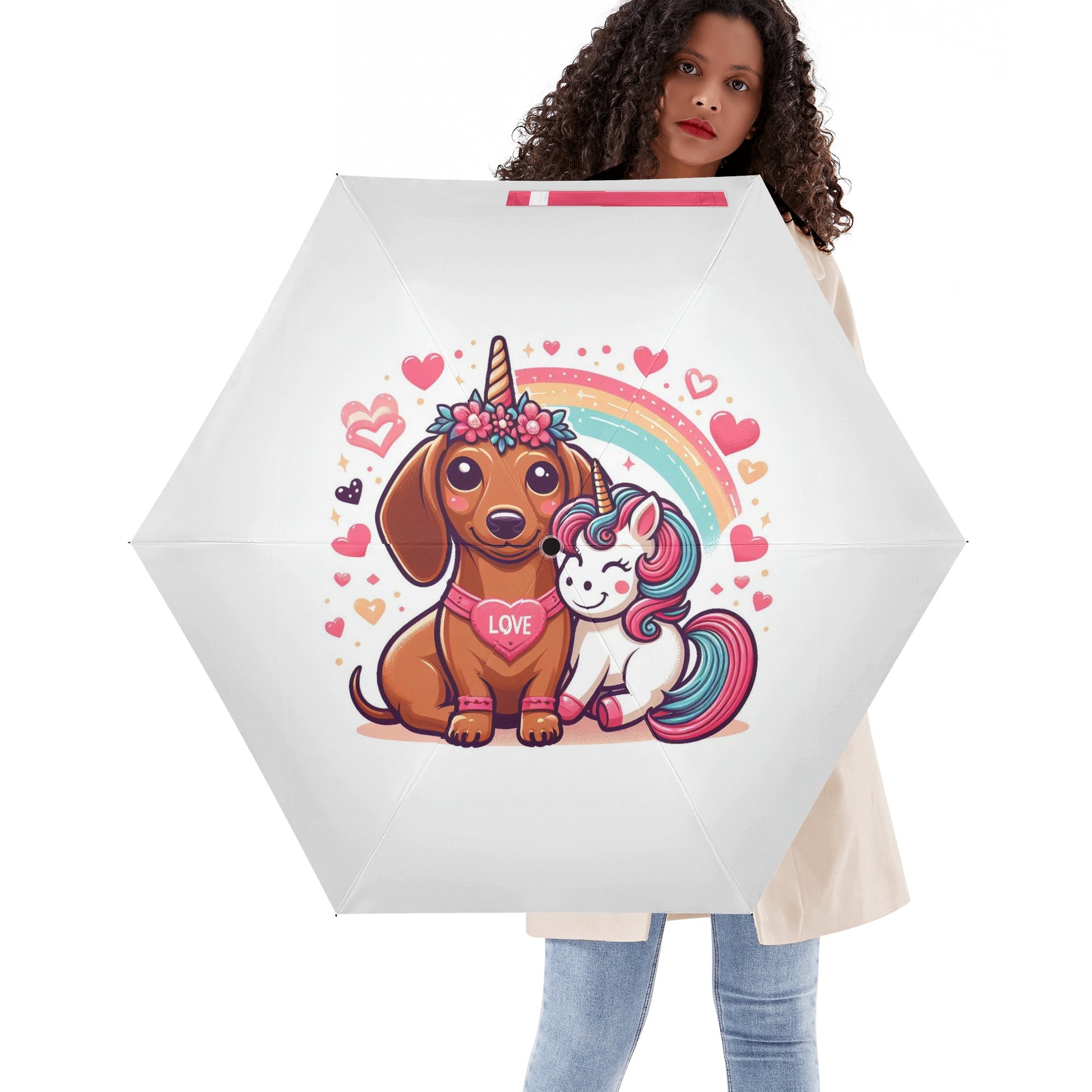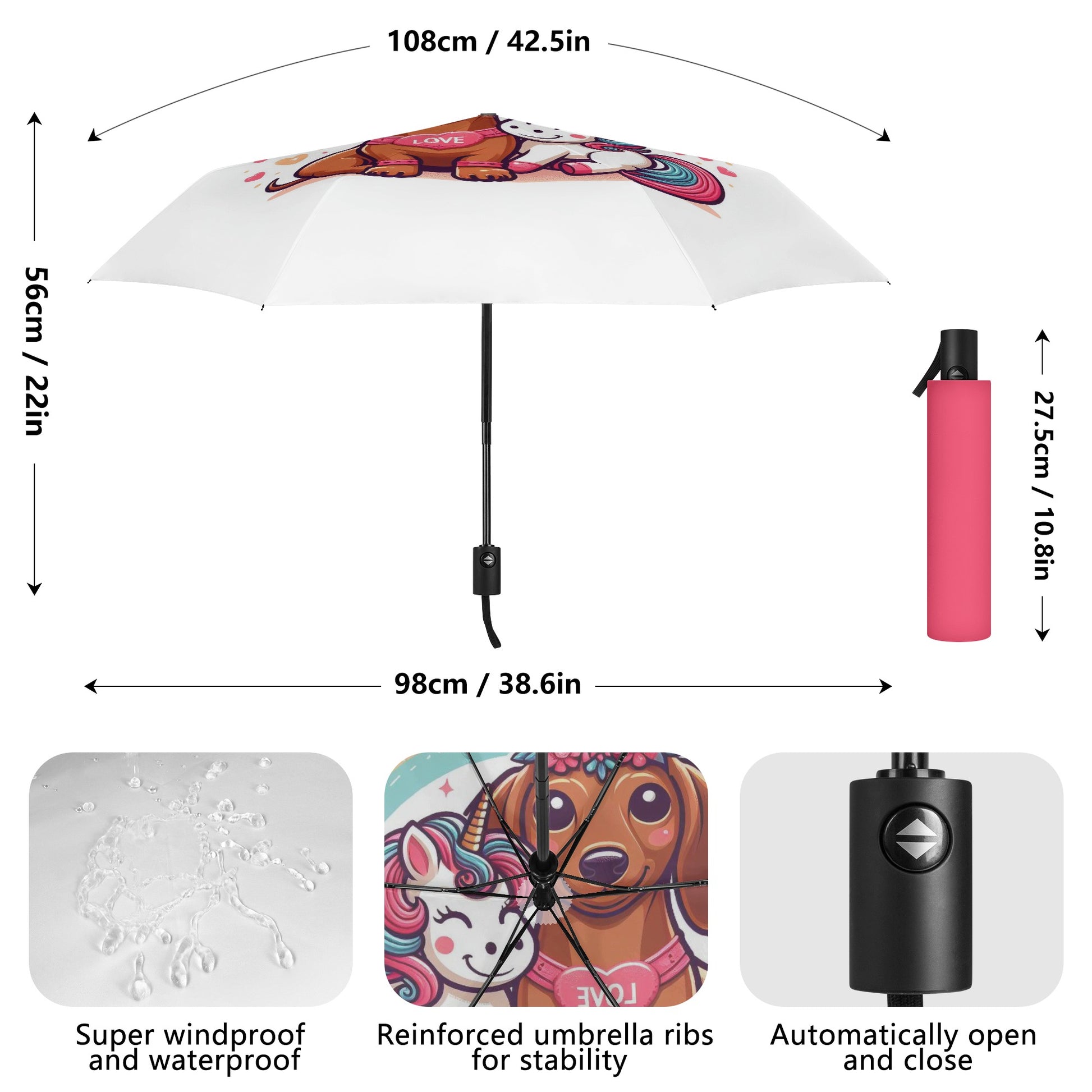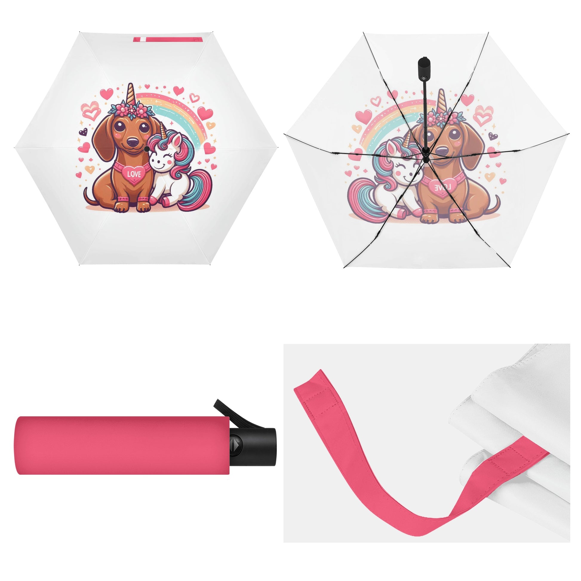 El paraguas se compone de 6 piezas, cada una con un bonito estampado de perro salchicha. También puedes personalizar el cinturón y la funda para que coincidan con tu estilo y preferencia. El paraguas tiene un mecanismo de apertura y cierre automático y un mango de agarre cómodo. Puedes abrirlo y cerrarlo con una mano y disfrutar de una experiencia cómoda y fluida.
