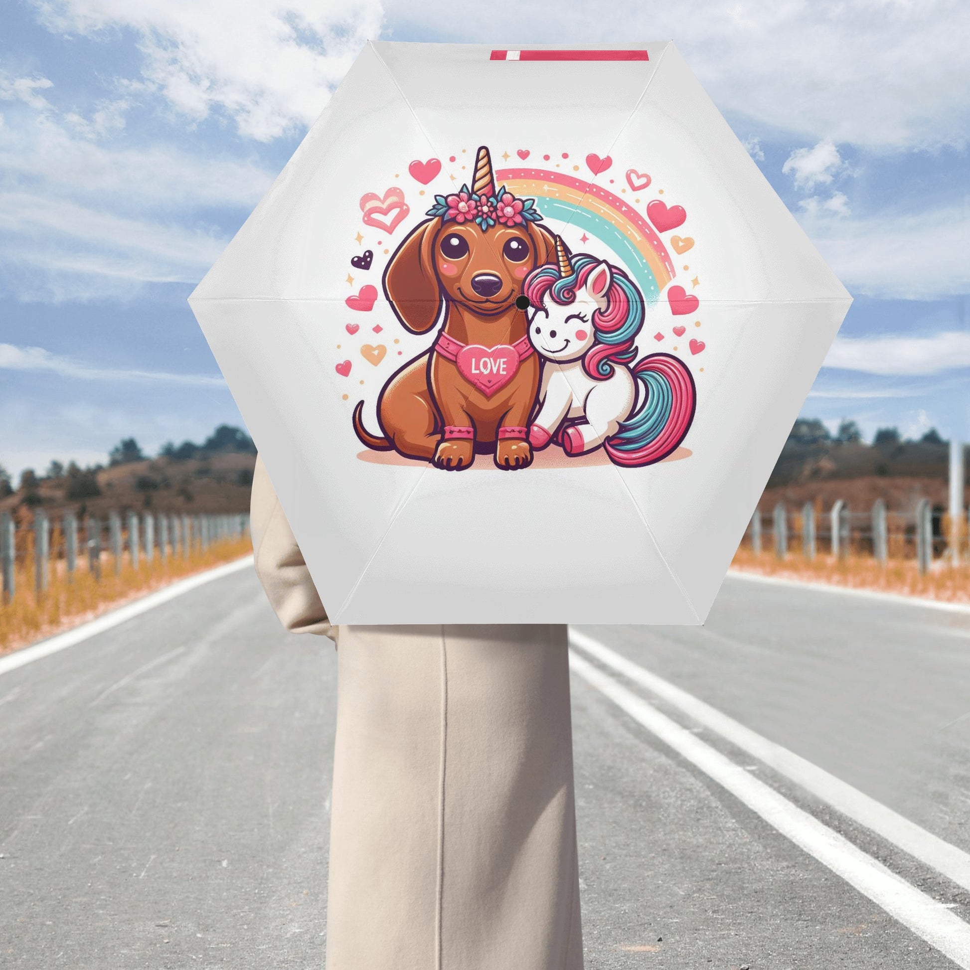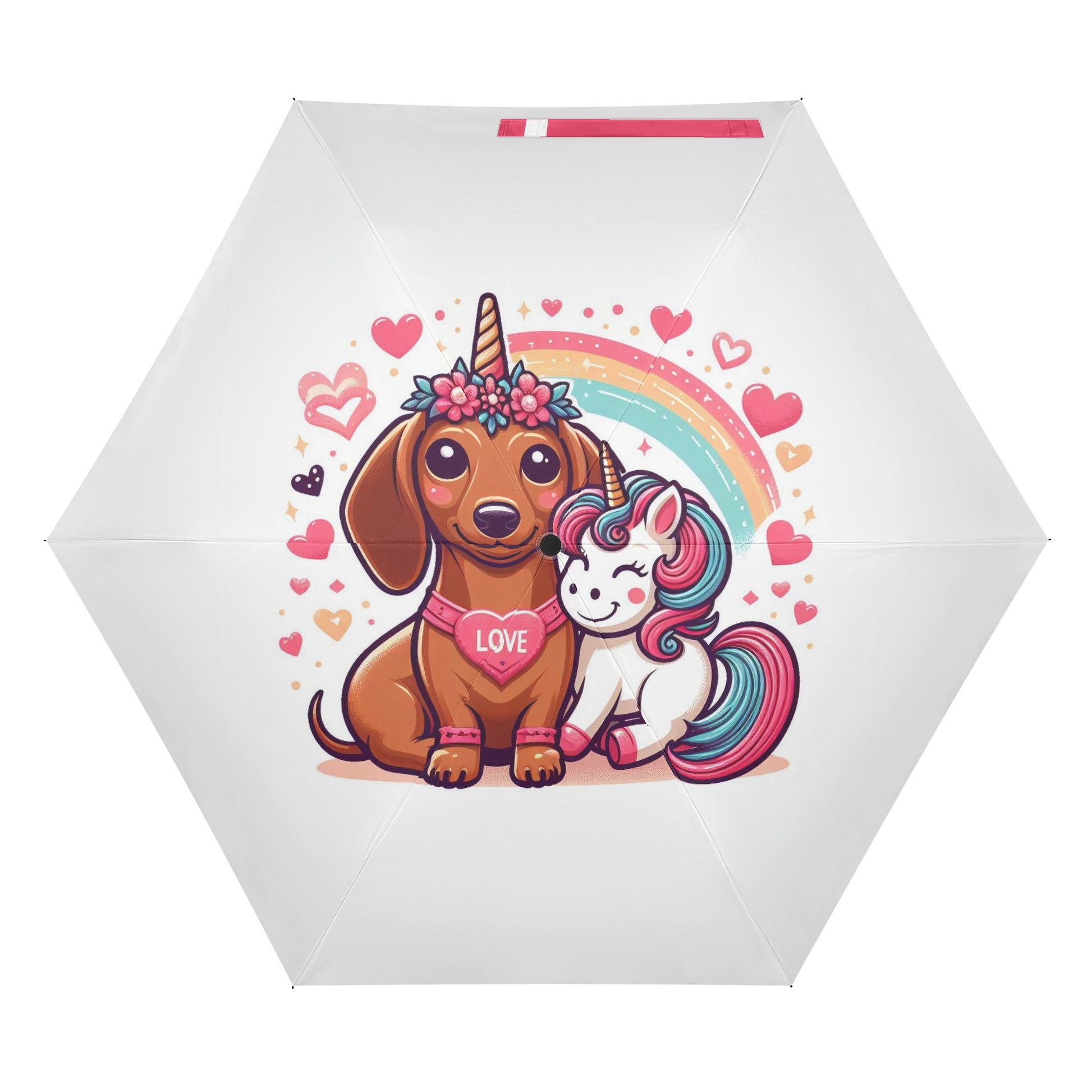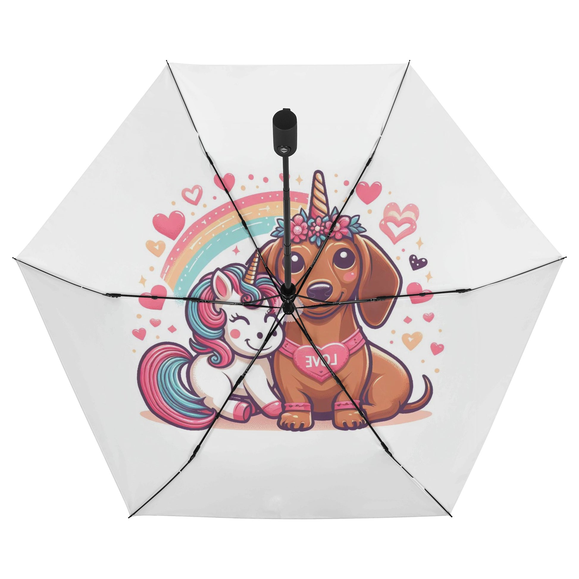 El paraguas se compone de 6 piezas, cada una con un bonito estampado de perro salchicha. También puedes personalizar el cinturón y la funda para que coincidan con tu estilo y preferencia. El paraguas tiene un mecanismo de apertura y cierre automático y un mango de agarre cómodo. Puedes abrirlo y cerrarlo con una mano y disfrutar de una experiencia cómoda y fluida.