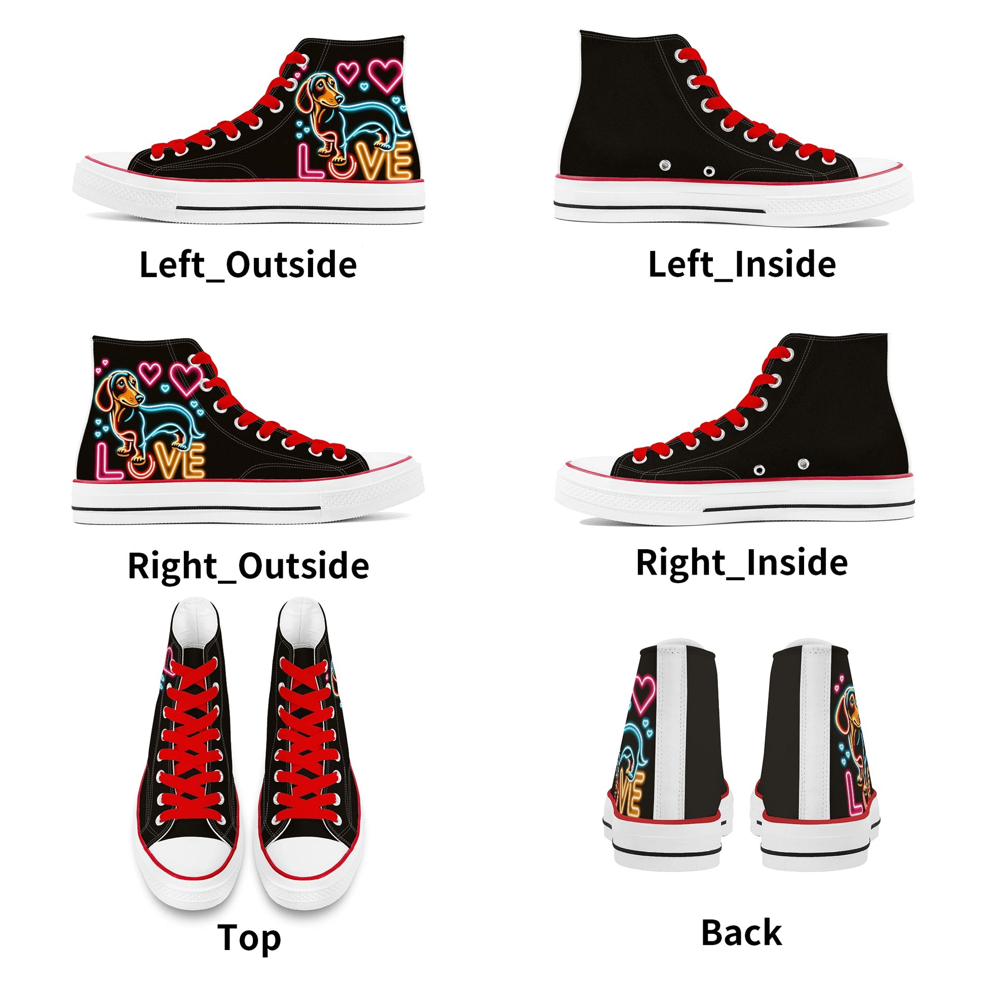 Si te encantan los perros salchicha, los perros encantadores y leales con cuerpos largos y patas cortas, te encantarán estos zapatos personalizados con estampado integral que presentan un divertido diseño de perro salchicha.