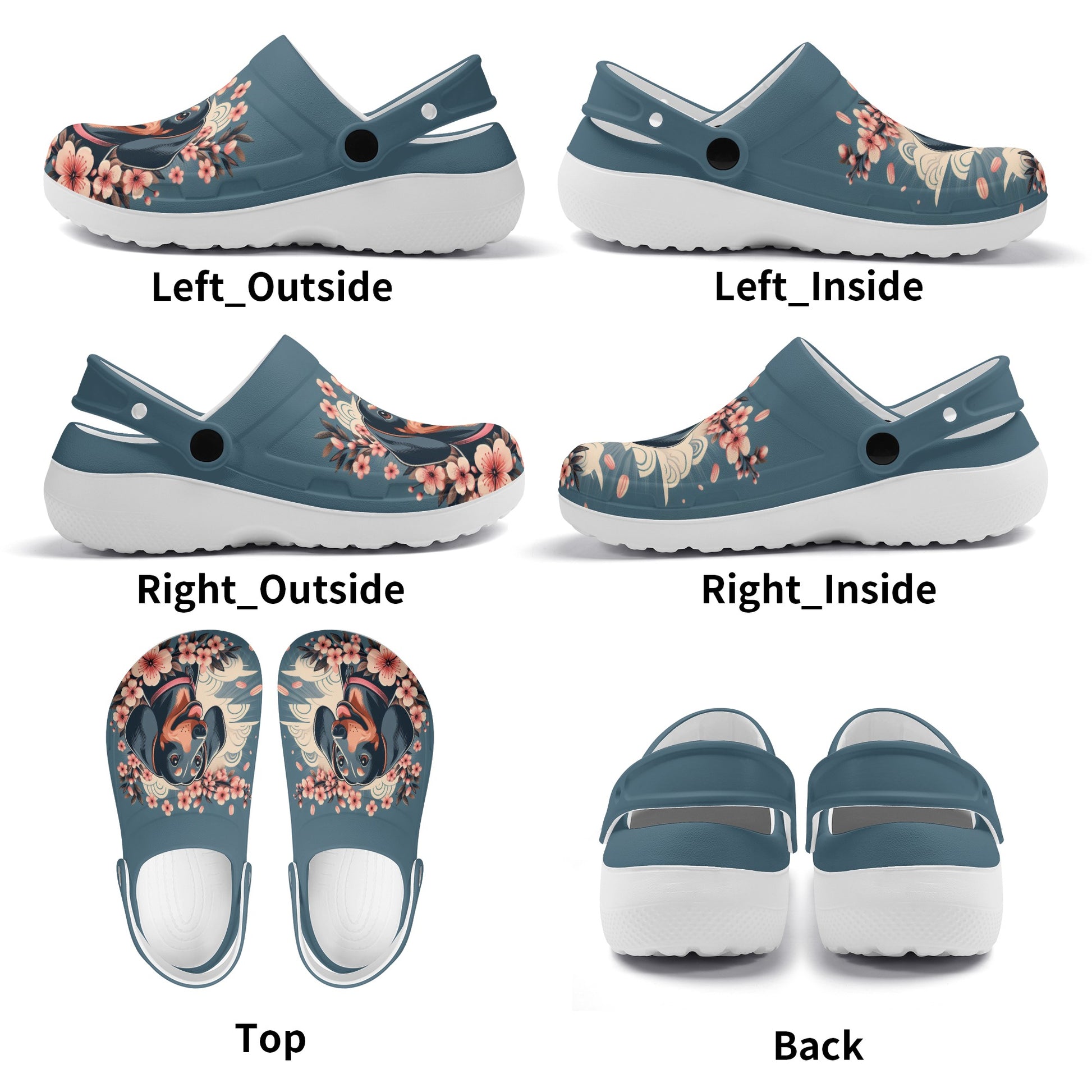 Si estás buscando un par de zuecos cómodos y elegantes que muestren tu amor por los perros salchicha, ¡te encantarán estos zuecos impresos personalizados con varias imágenes de perros salchicha!