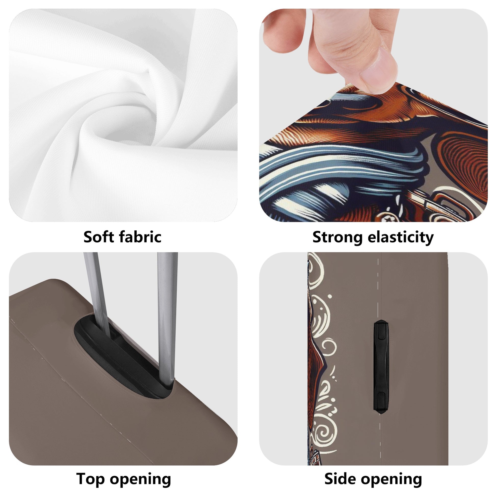 - Esta funda está hecha de poliéster y fibra de lona que es resistente, lavable y elástica. Se adapta perfectamente a tu maleta y la protege de la suciedad y los arañazos.