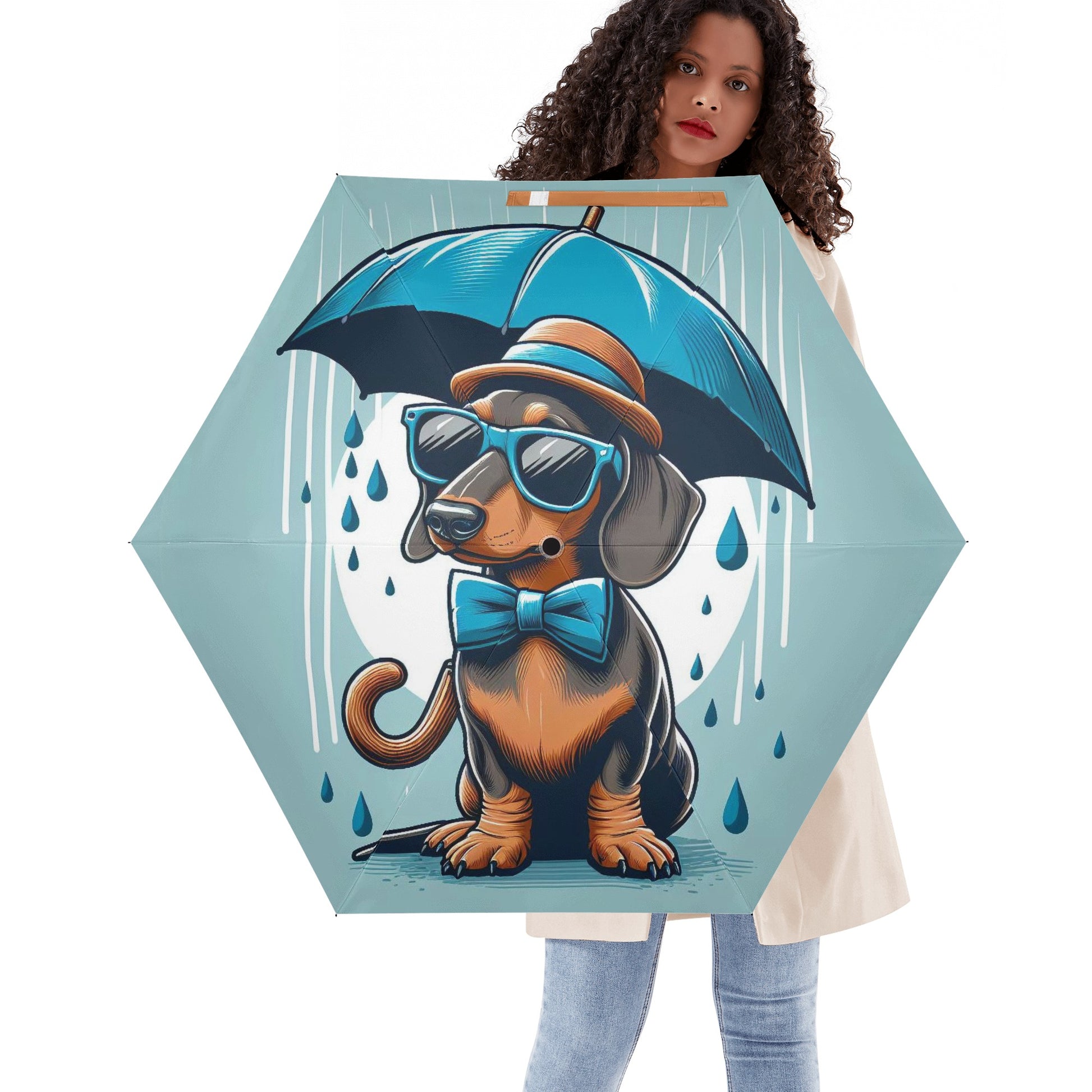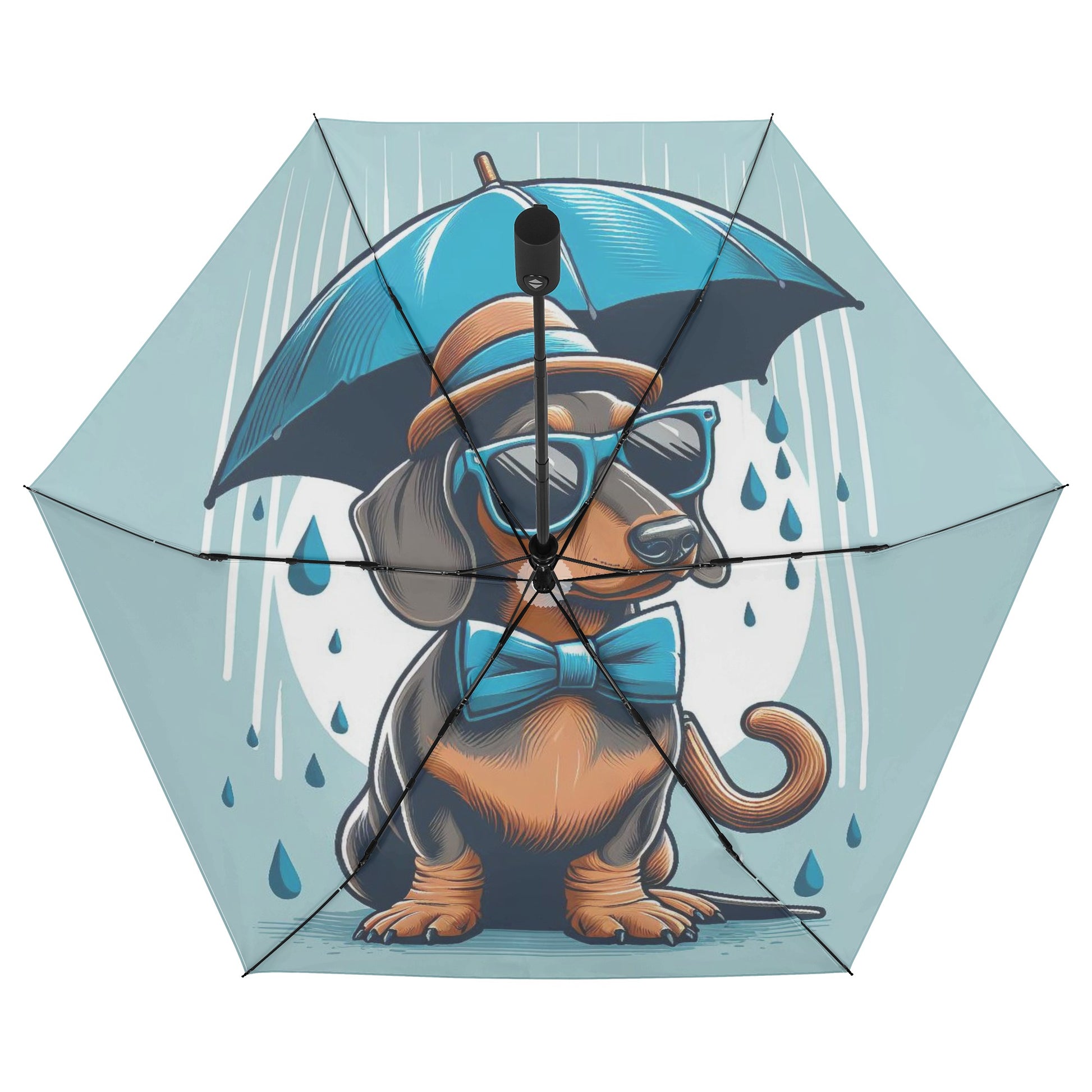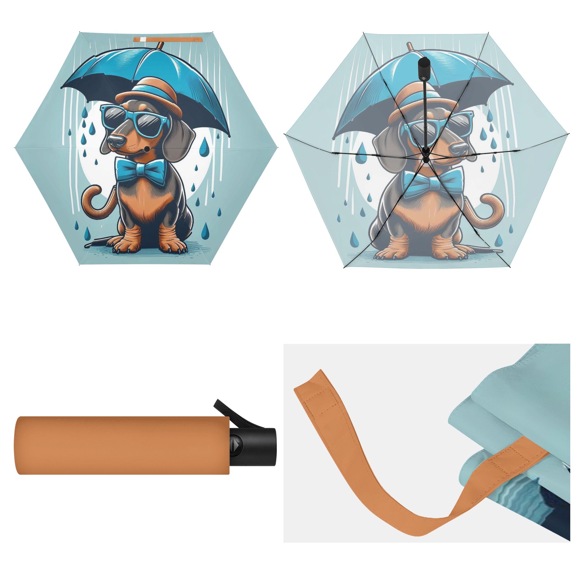 El paraguas se compone de 6 piezas, cada una con un bonito estampado de perro salchicha. También puedes personalizar el cinturón y la funda para que coincidan con tu estilo y preferencia. El paraguas tiene un mecanismo de apertura y cierre automático y un mango de agarre cómodo. Puedes abrirlo y cerrarlo con una mano y disfrutar de una experiencia cómoda y fluida.