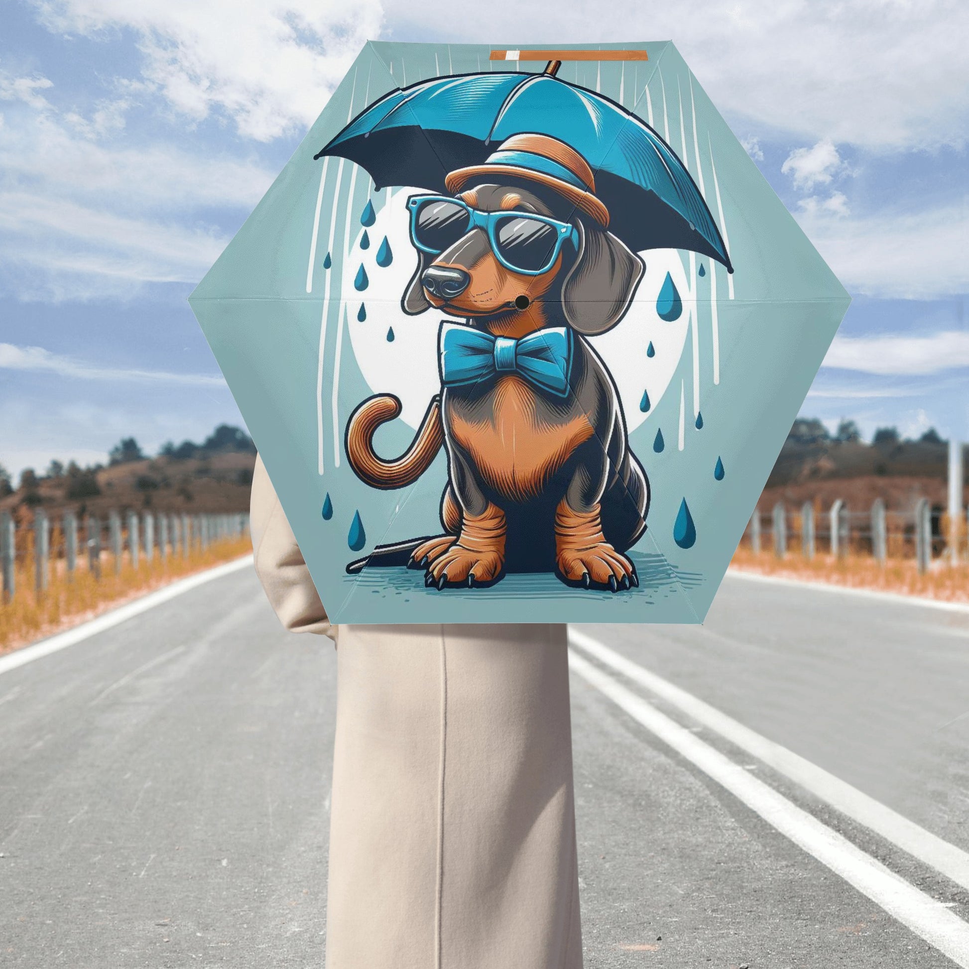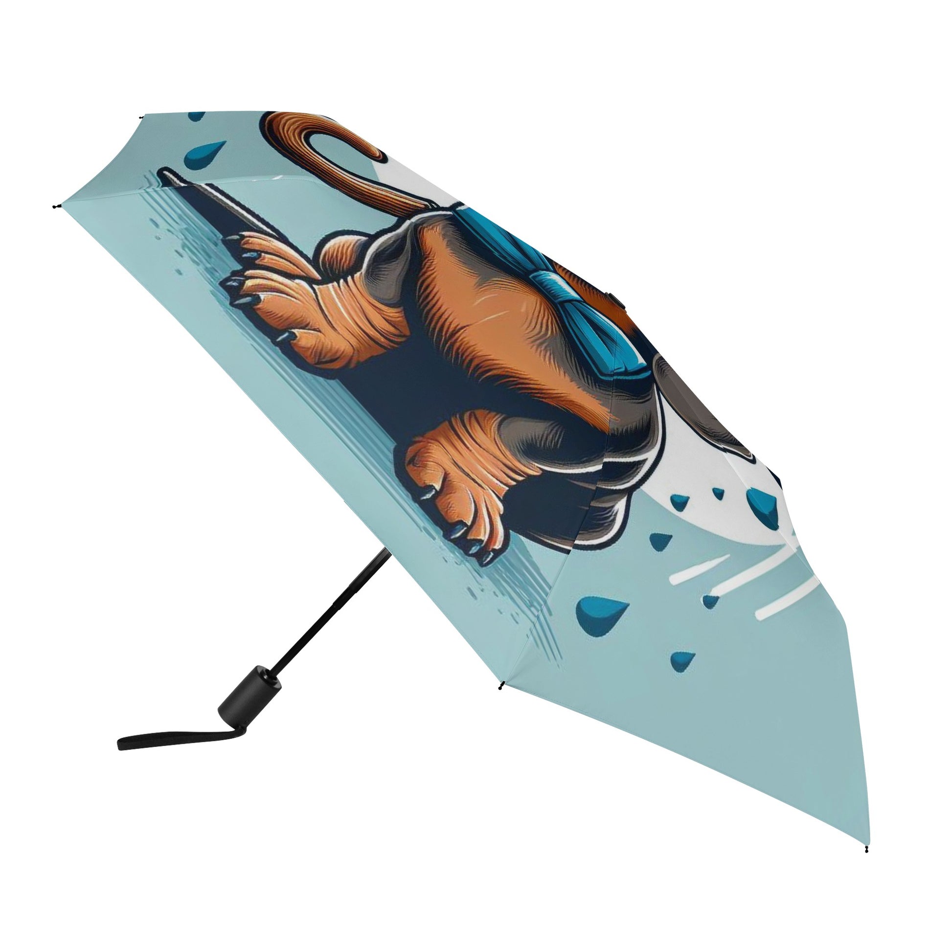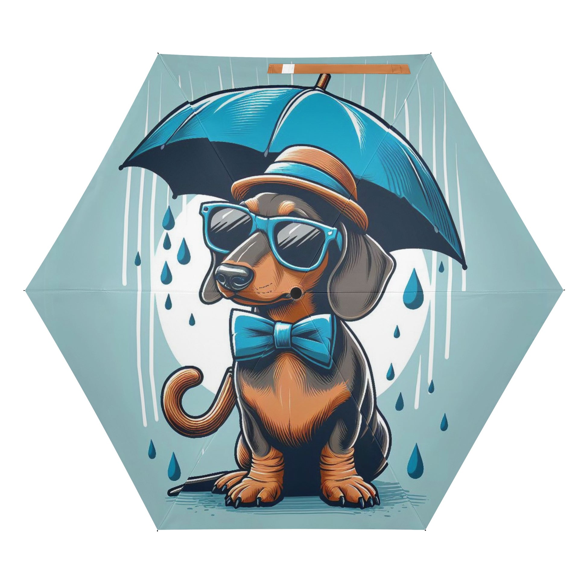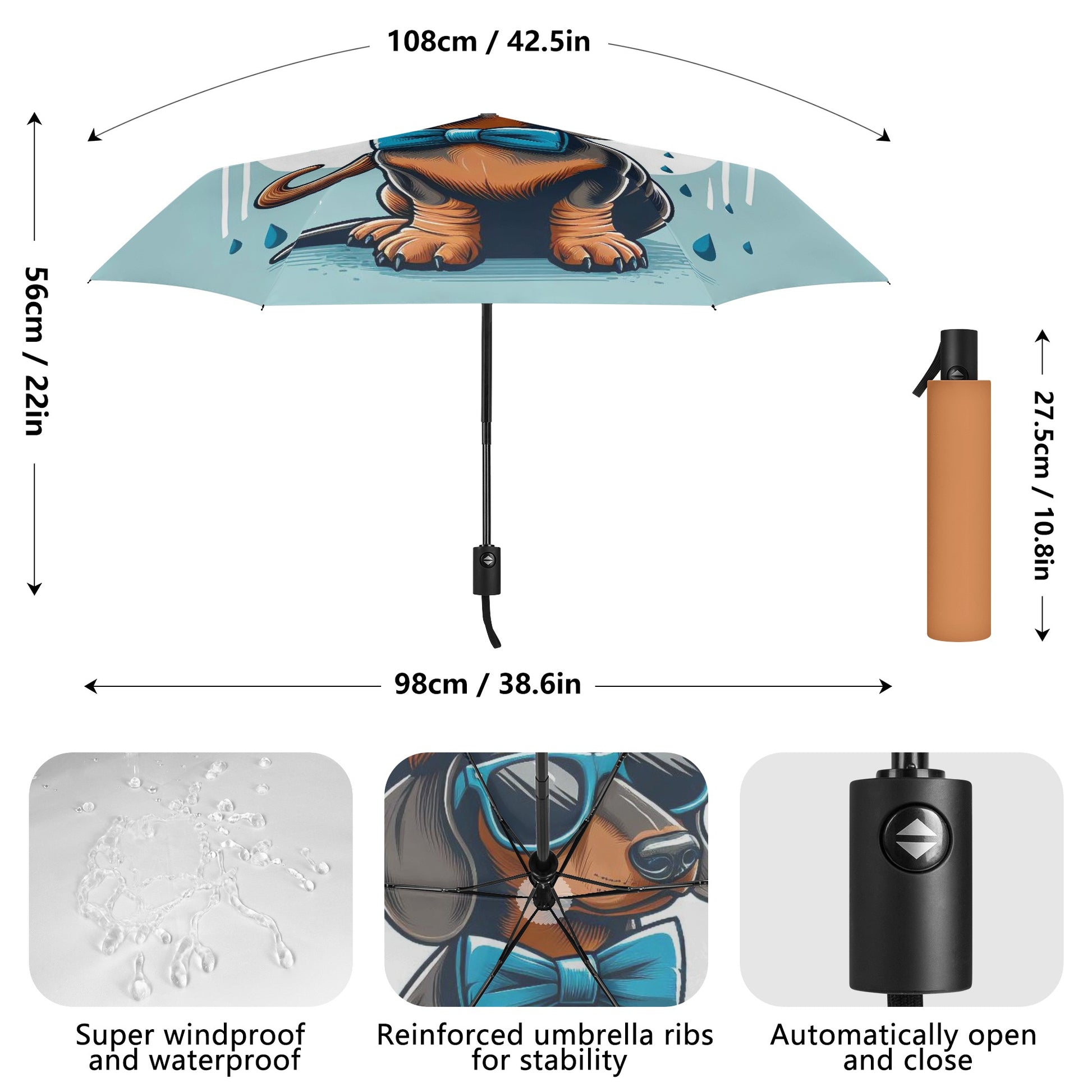 El paraguas se compone de 6 piezas, cada una con un bonito estampado de perro salchicha. También puedes personalizar el cinturón y la funda para que coincidan con tu estilo y preferencia. El paraguas tiene un mecanismo de apertura y cierre automático y un mango de agarre cómodo. Puedes abrirlo y cerrarlo con una mano y disfrutar de una experiencia cómoda y fluida.