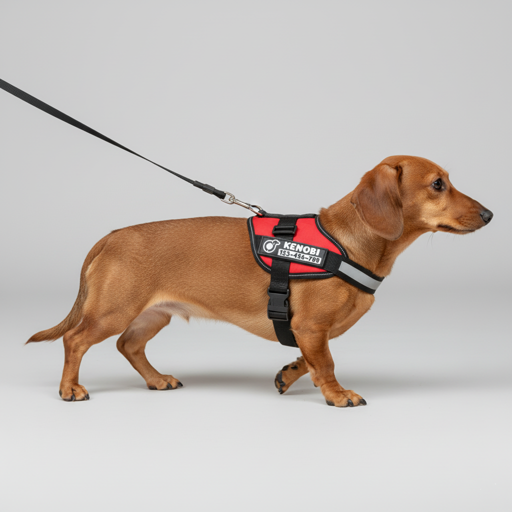 Give your Dachshund the perfect fit and peace of mind! This breathable, wear-resistant Doxie harness provides superior comfort and features a customizable leather patch where you can engrave your Doxie’s name and phone number — a smart safety measure against lost pets.