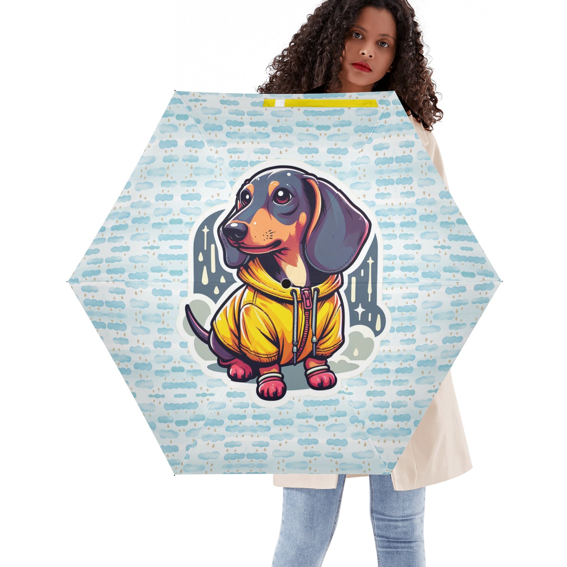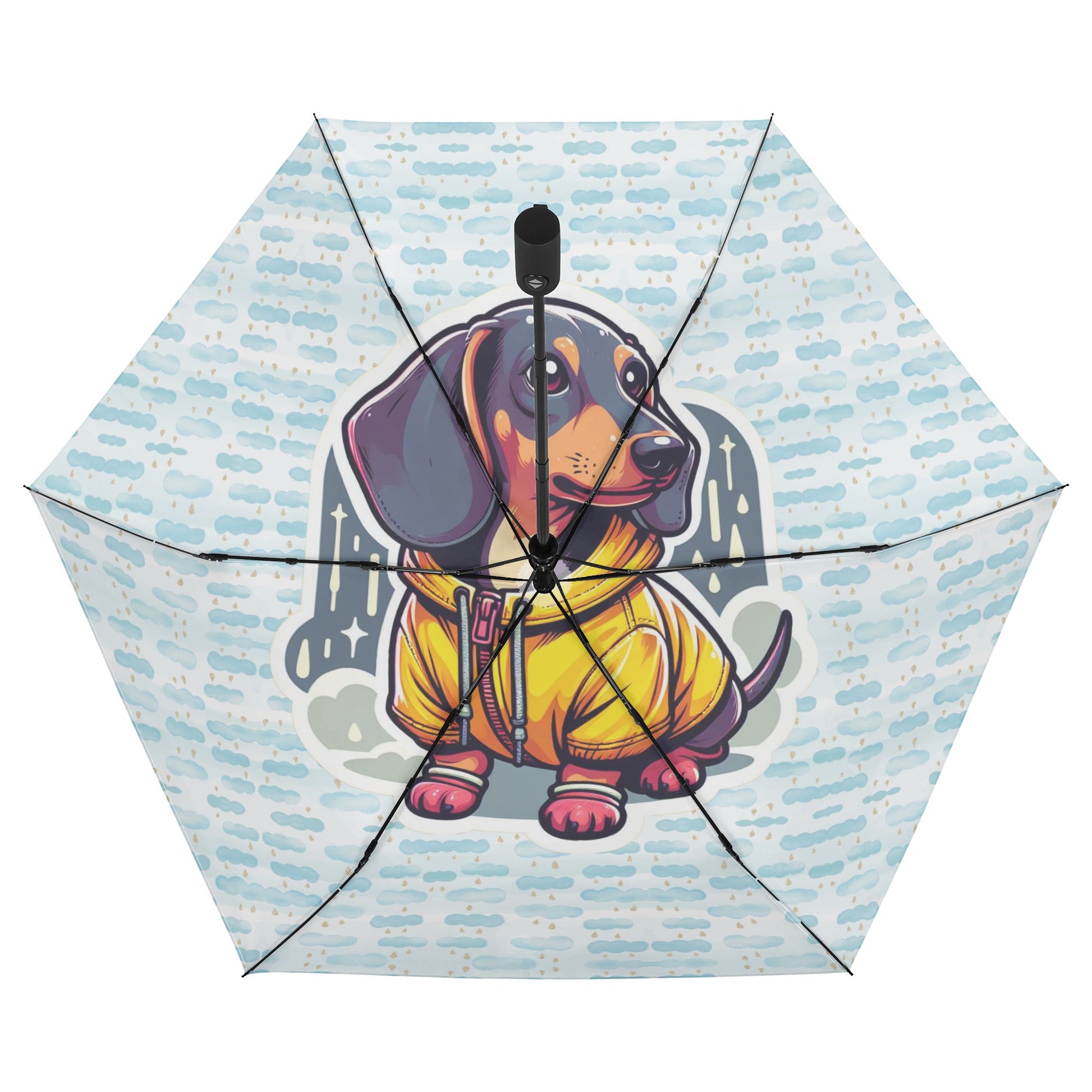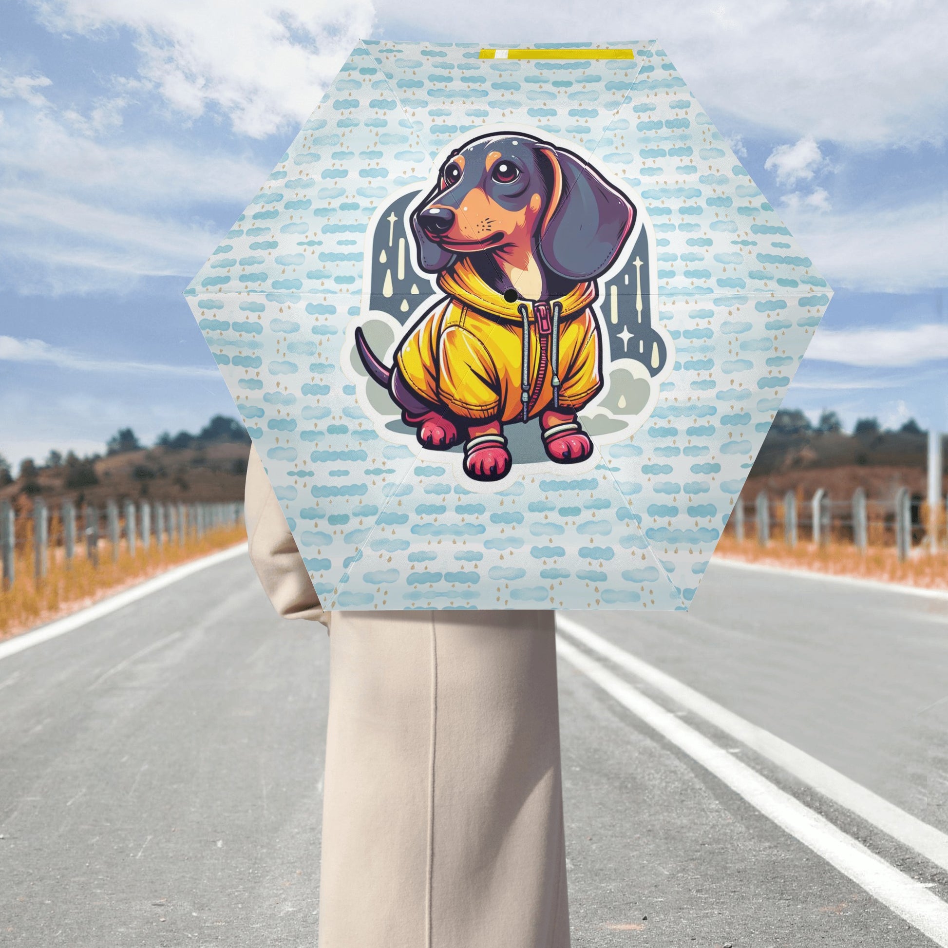 El paraguas se compone de 6 piezas, cada una con un bonito estampado de perro salchicha. También puedes personalizar el cinturón y la funda para que coincidan con tu estilo y preferencia. El paraguas tiene un mecanismo de apertura y cierre automático y un mango de agarre cómodo. Puedes abrirlo y cerrarlo con una mano y disfrutar de una experiencia cómoda y fluida.