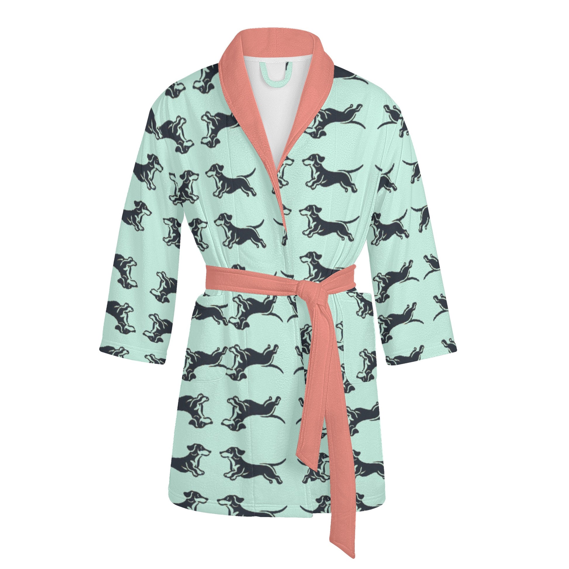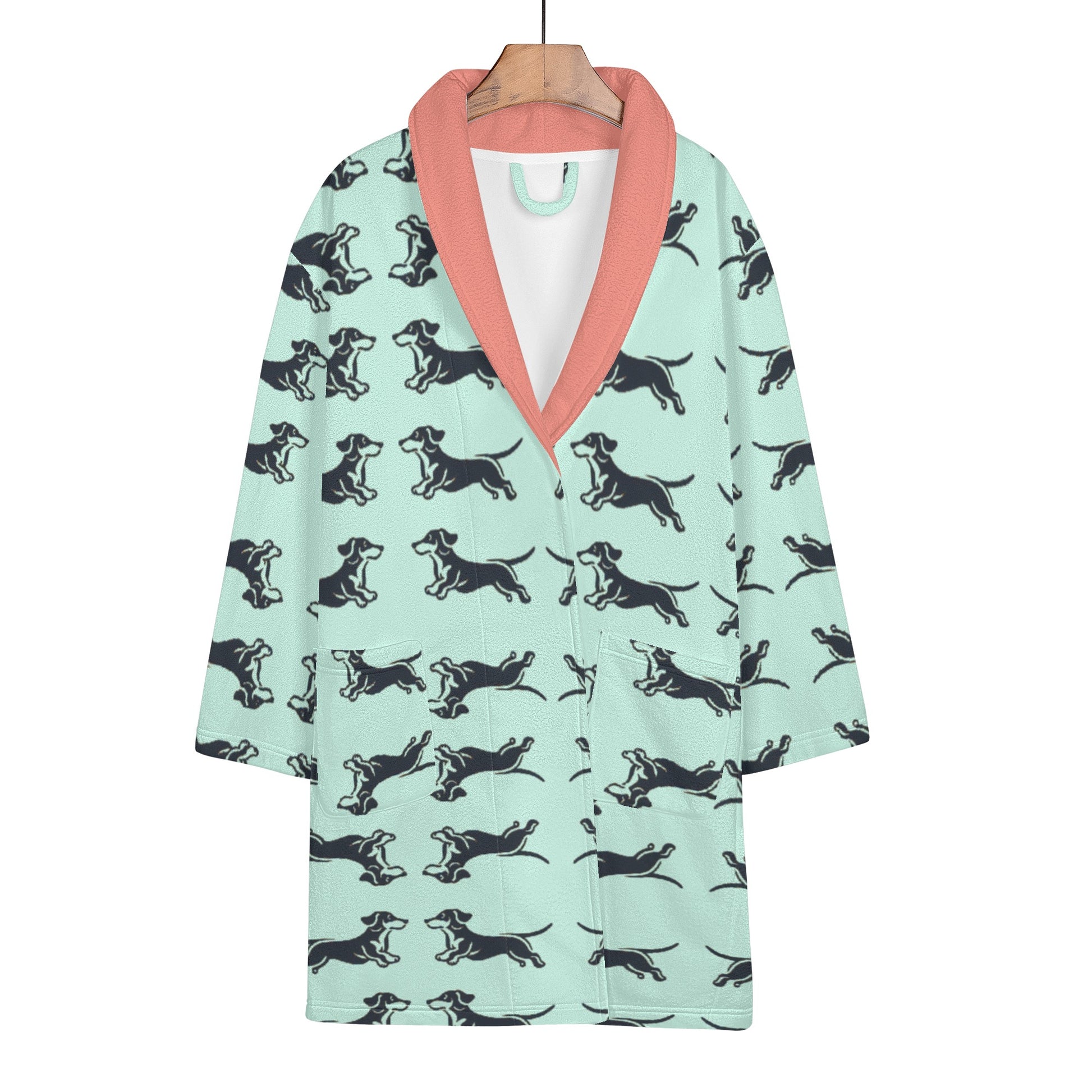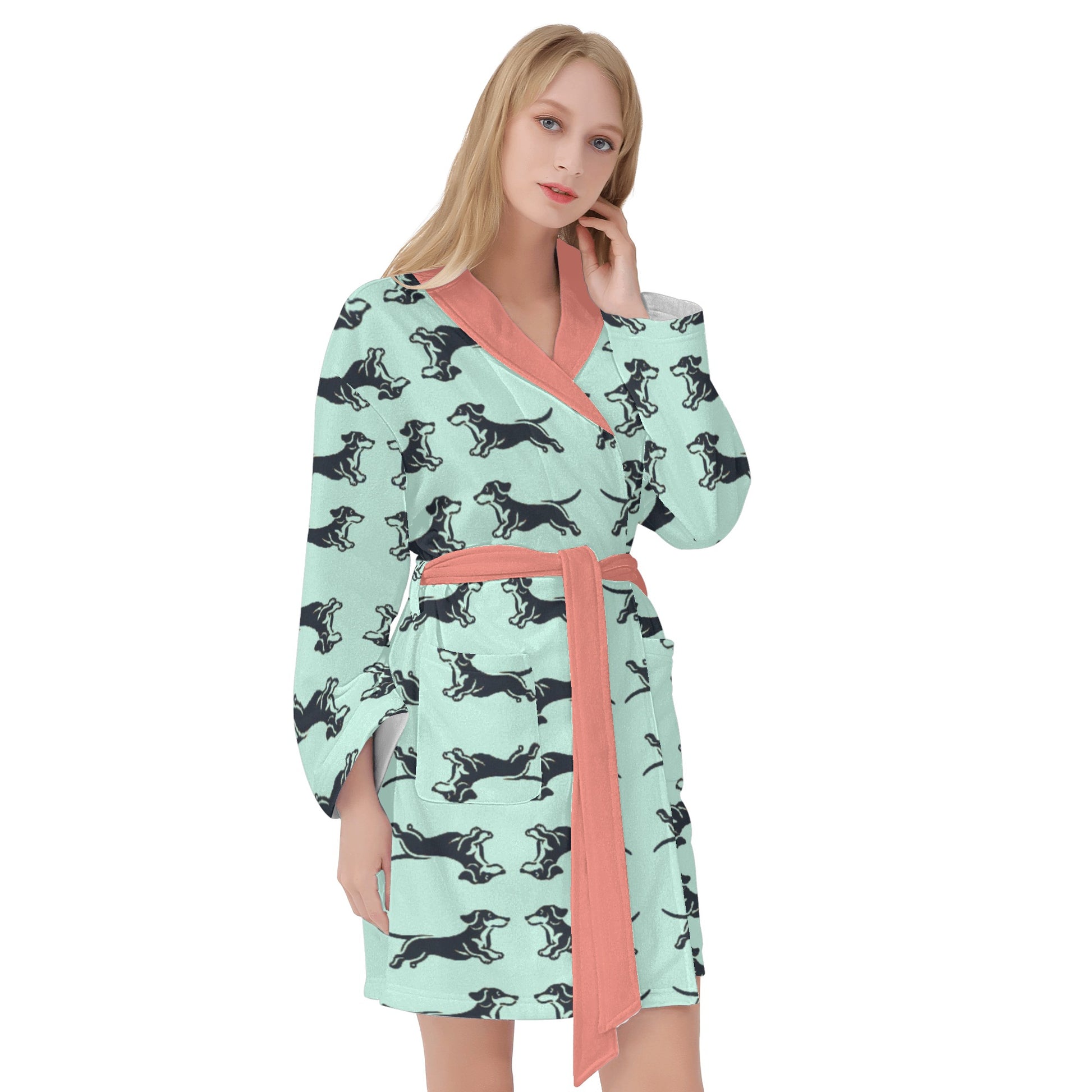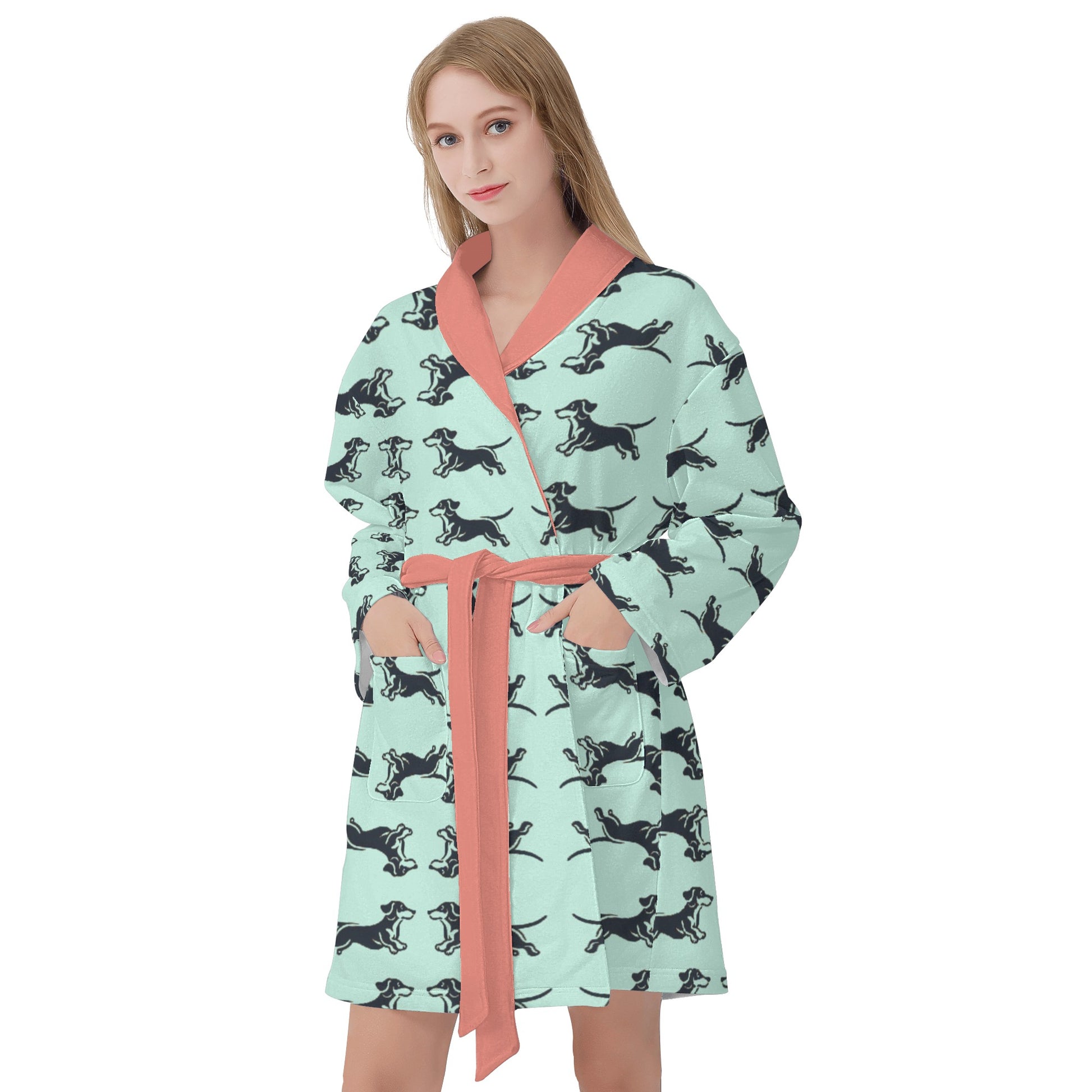 Envuélvete en una comodidad acogedora con esta adorable bata de baño para los amantes de los perros salchicha. Esta bata de baño presenta un lindo patrón de perros salchicha en varios colores y poses, perfecta para cualquier amante de los perros.