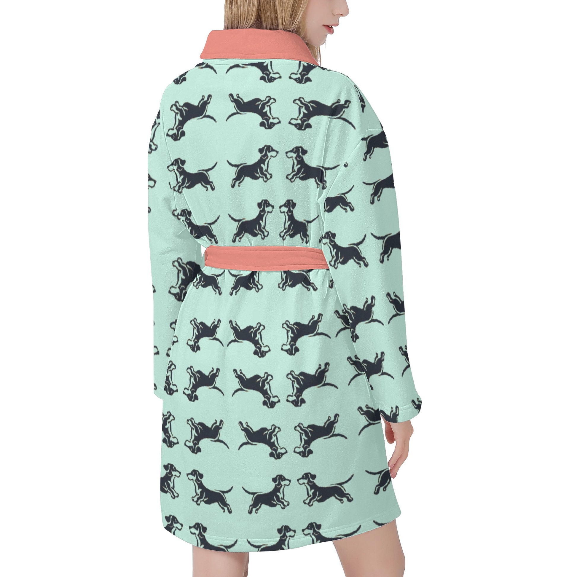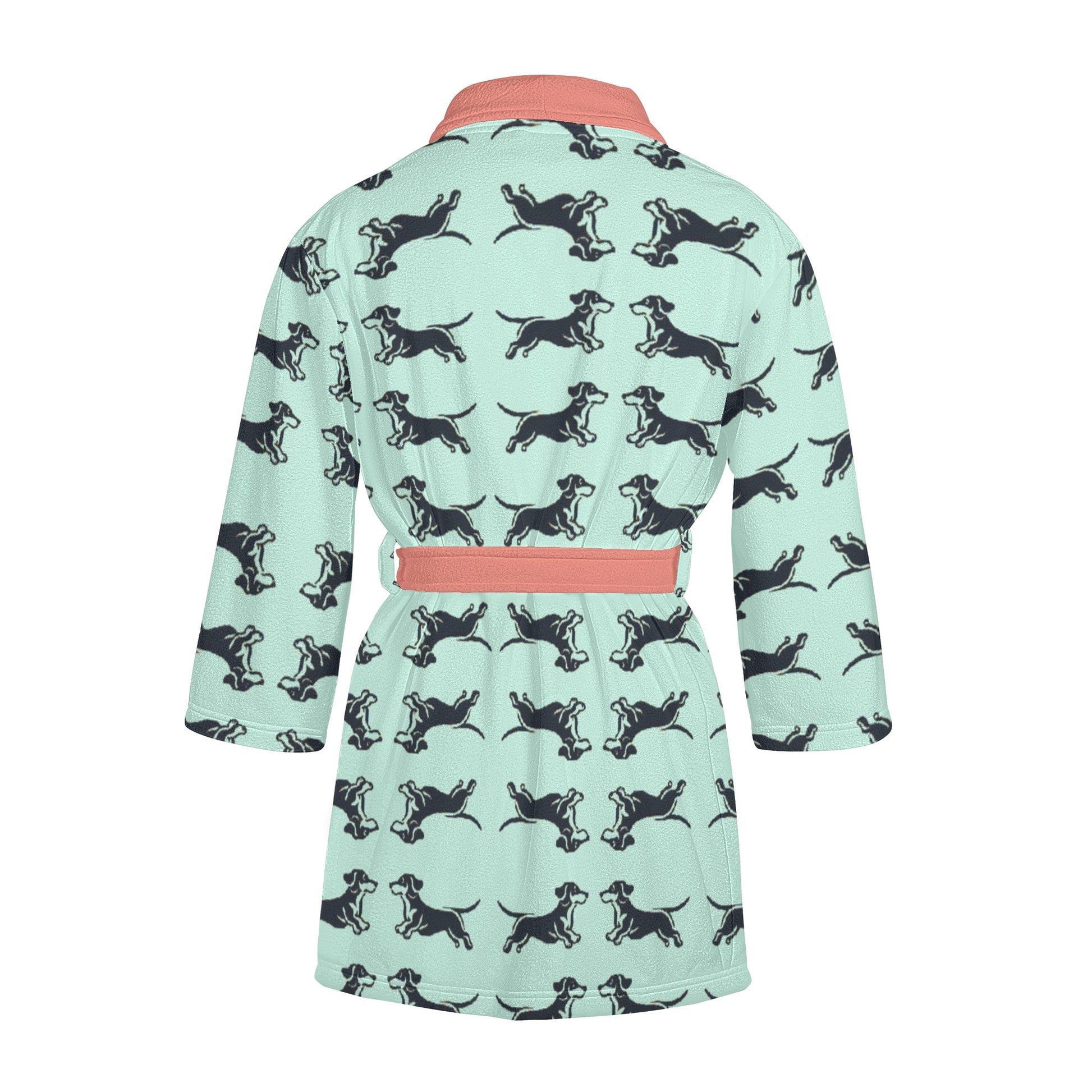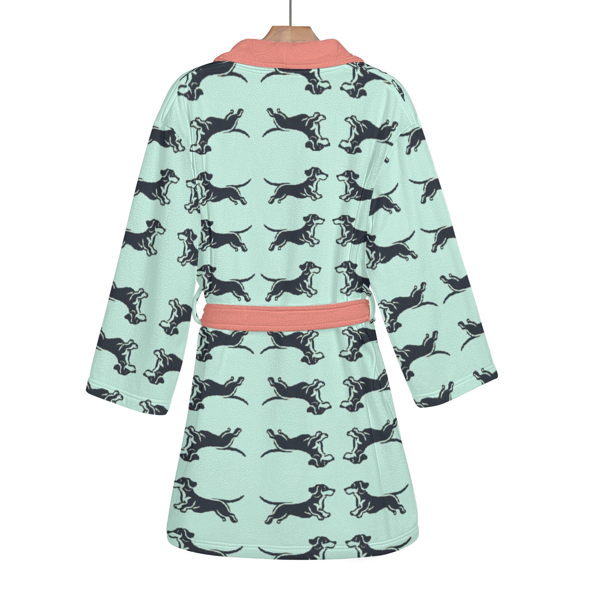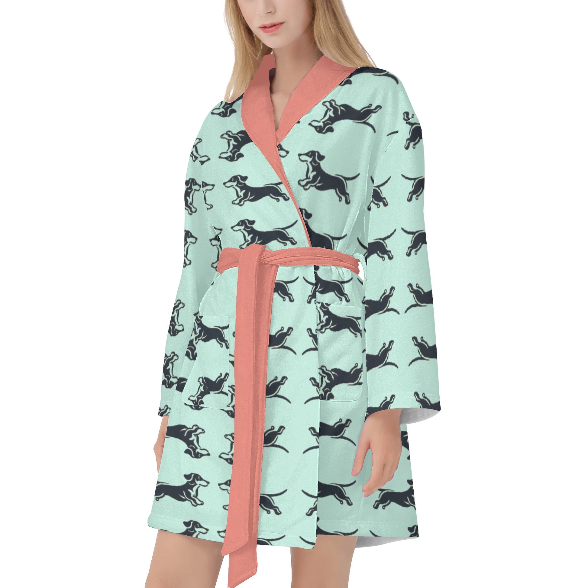 Envuélvete en una comodidad acogedora con esta adorable bata de baño para los amantes de los perros salchicha. Esta bata de baño presenta un lindo patrón de perros salchicha en varios colores y poses, perfecta para cualquier amante de los perros.