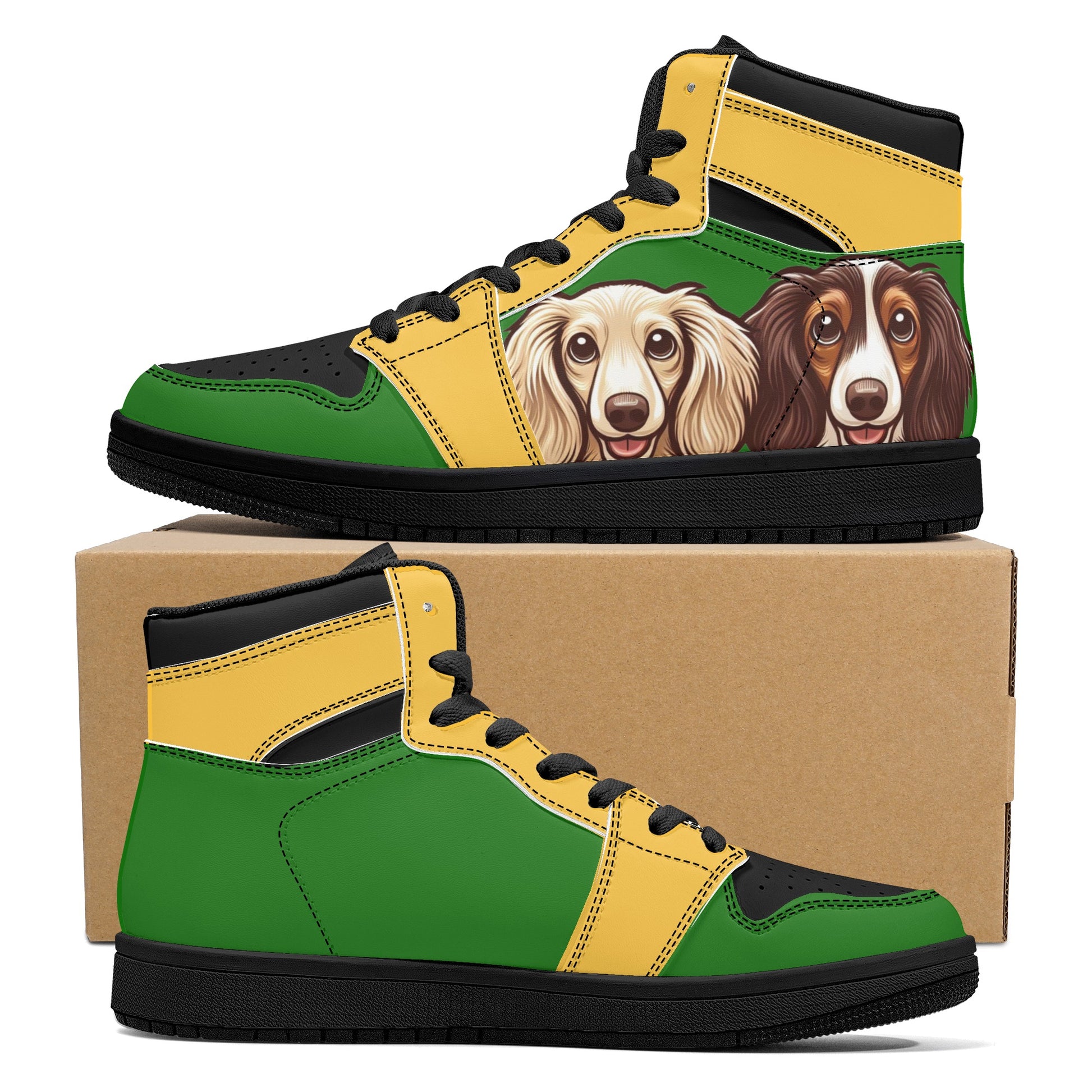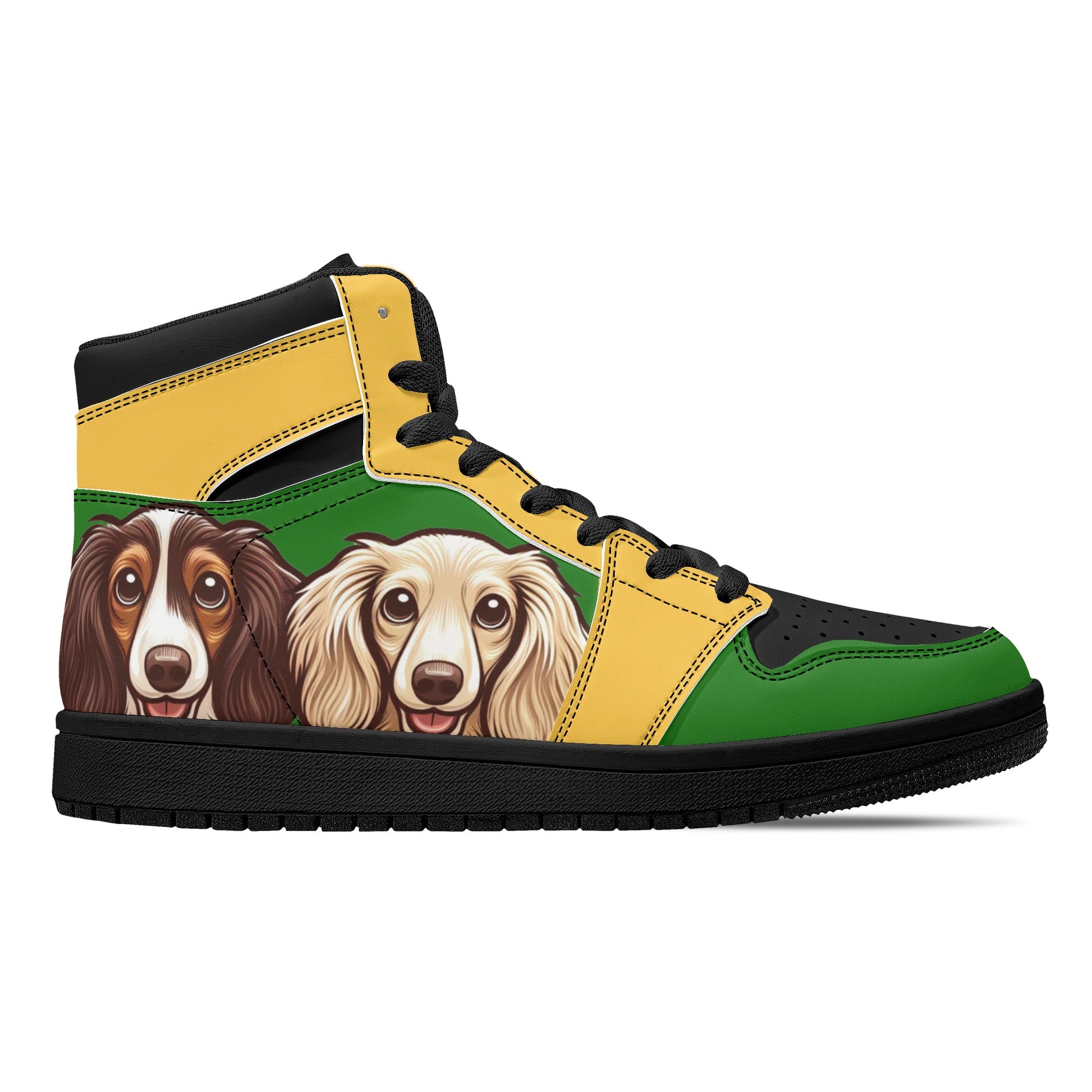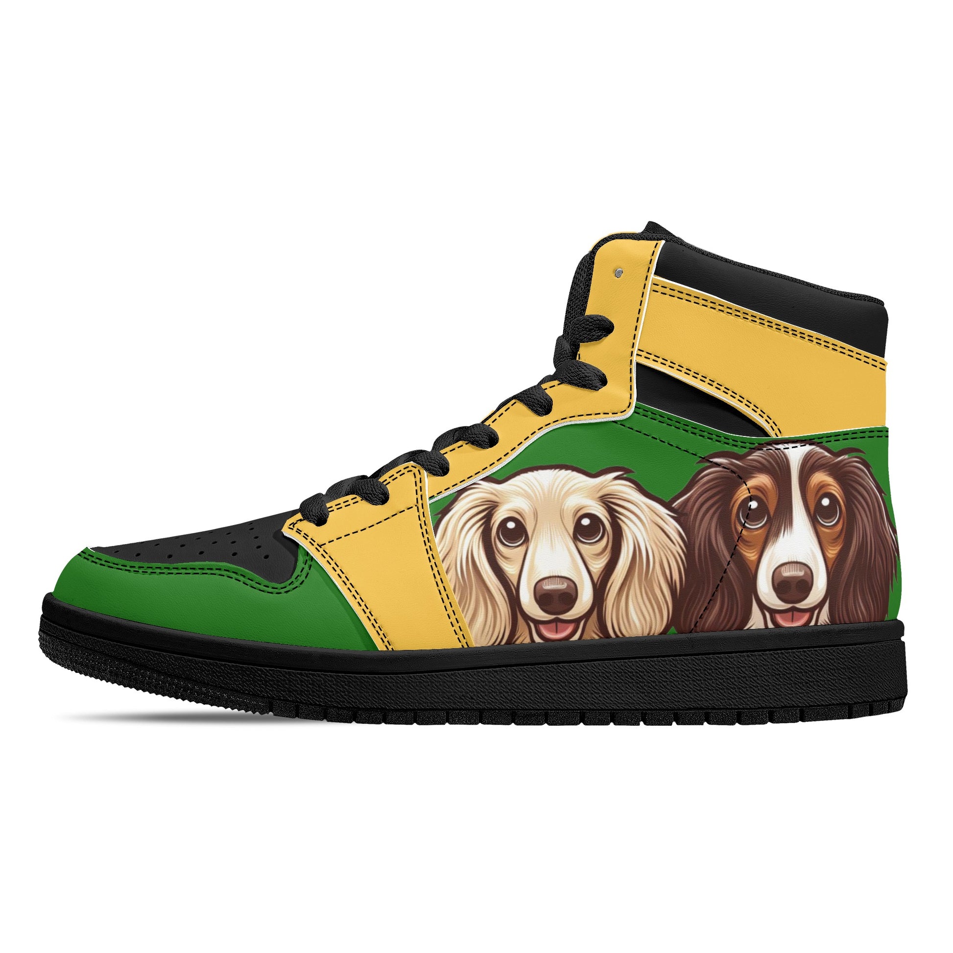 Si es así, te encantarán estos zapatos personalizados con estampado integral que presentan lindas cabezas de perro salchicha en varios colores y patrones.