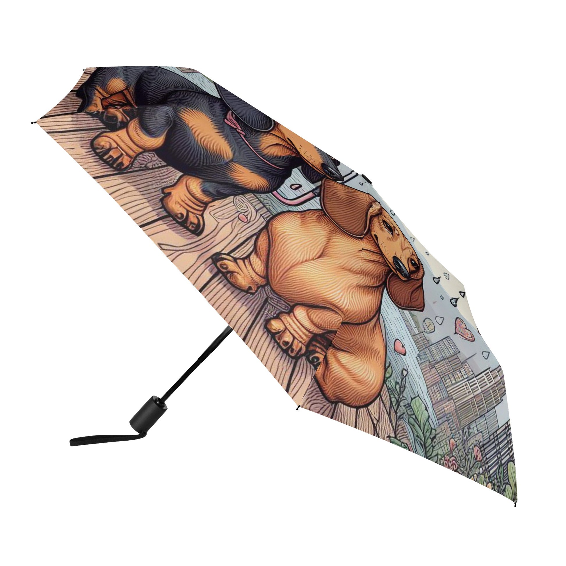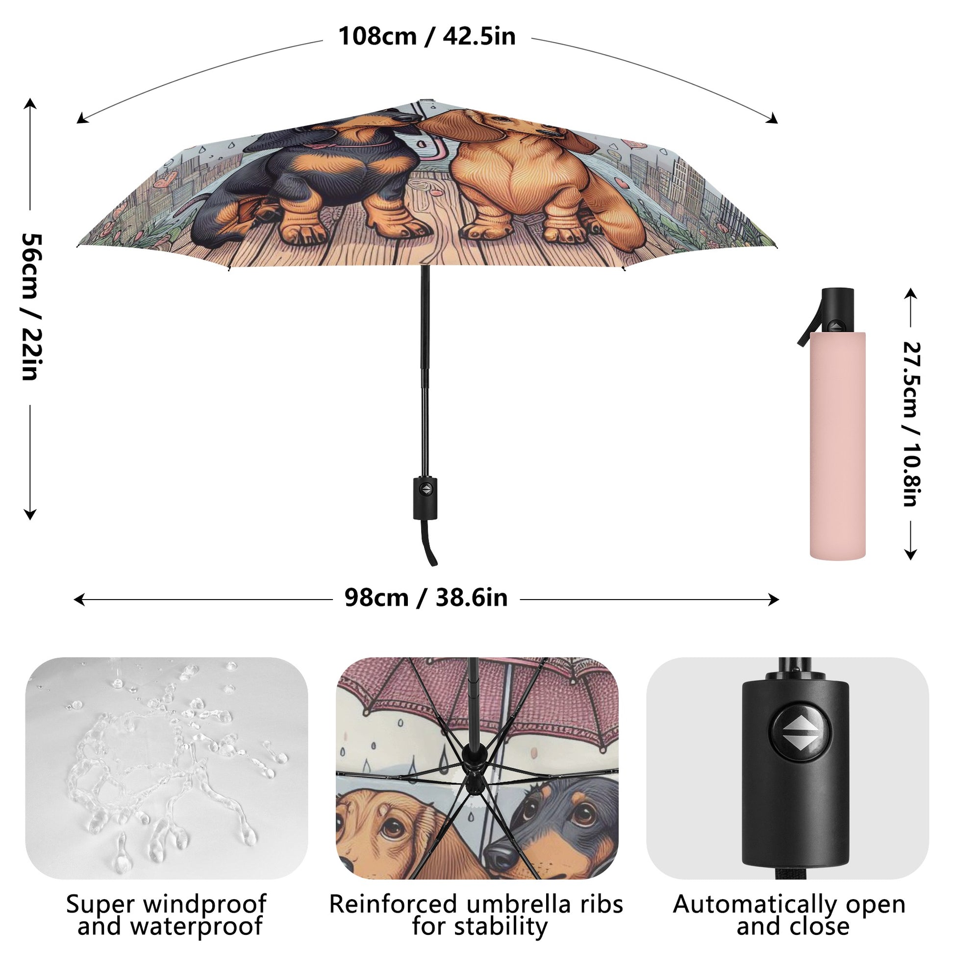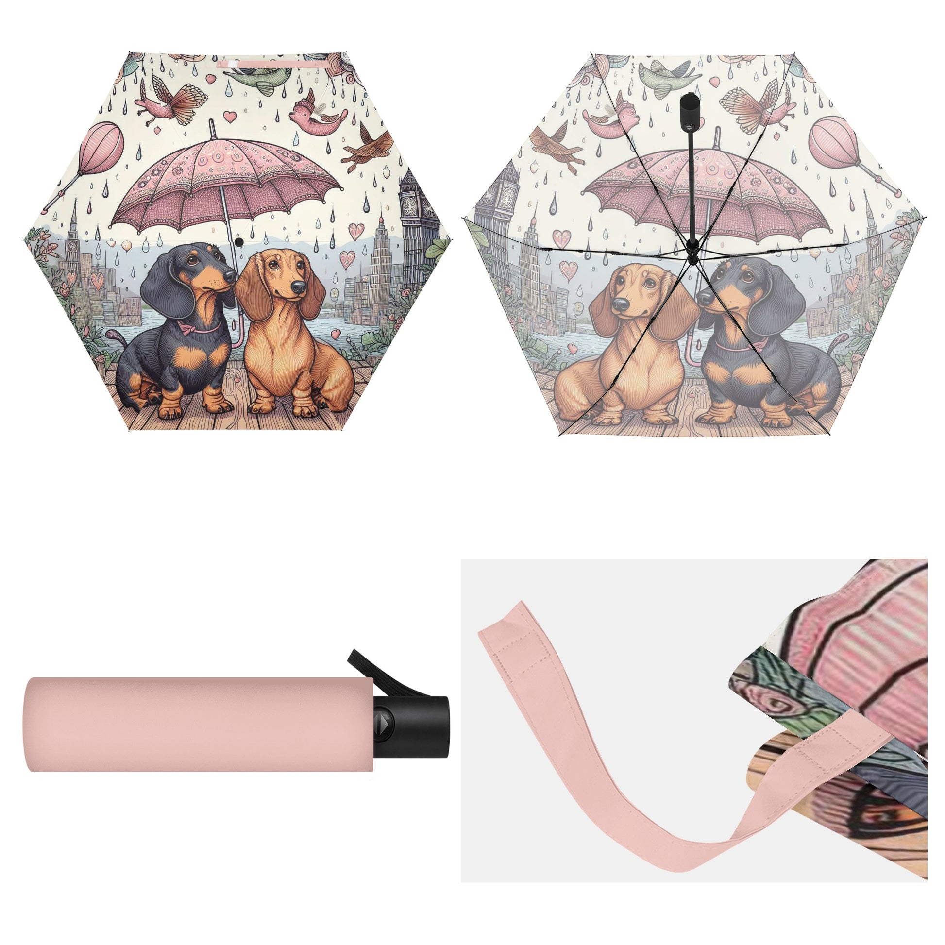 El paraguas se compone de 6 piezas, cada una con un bonito estampado de perro salchicha. También puedes personalizar el cinturón y la funda para que coincidan con tu estilo y preferencia. El paraguas tiene un mecanismo de apertura y cierre automático y un mango de agarre cómodo. Puedes abrirlo y cerrarlo con una mano y disfrutar de una experiencia cómoda y fluida.