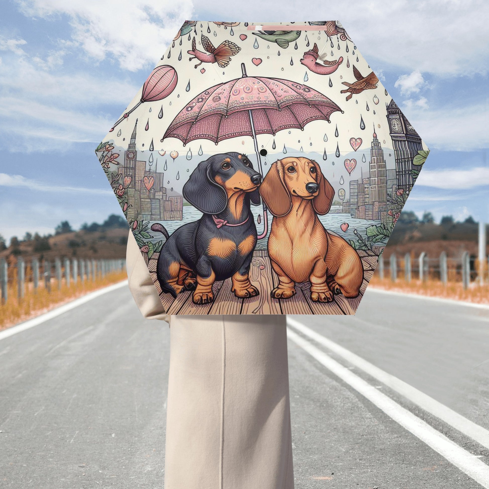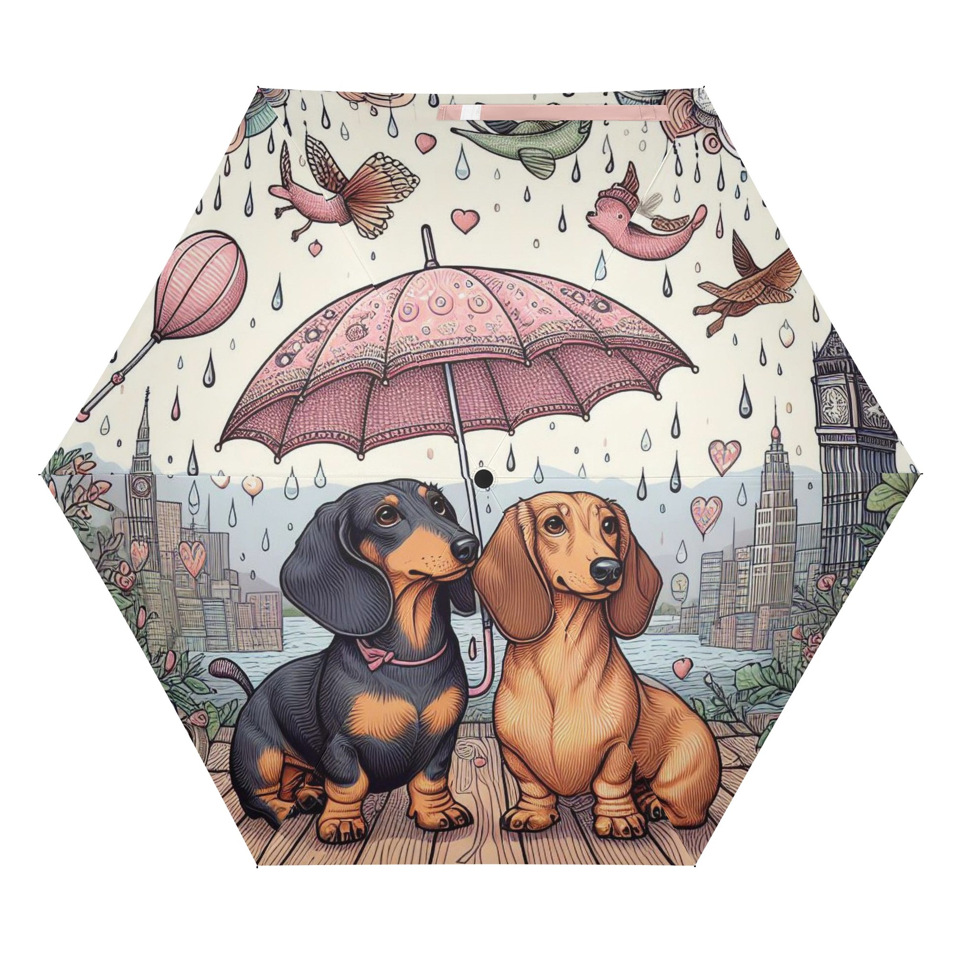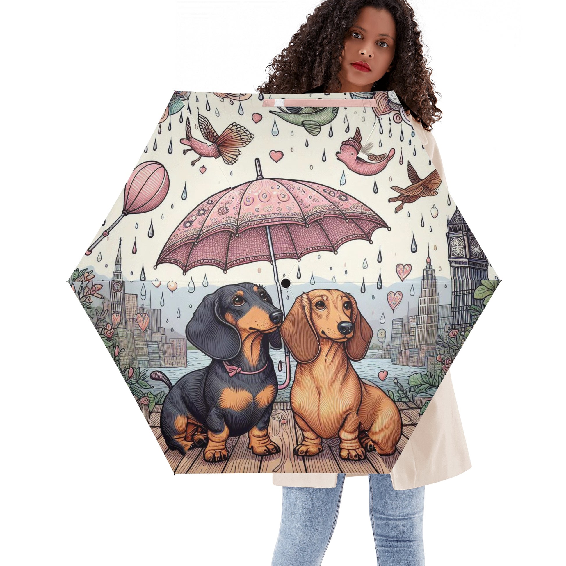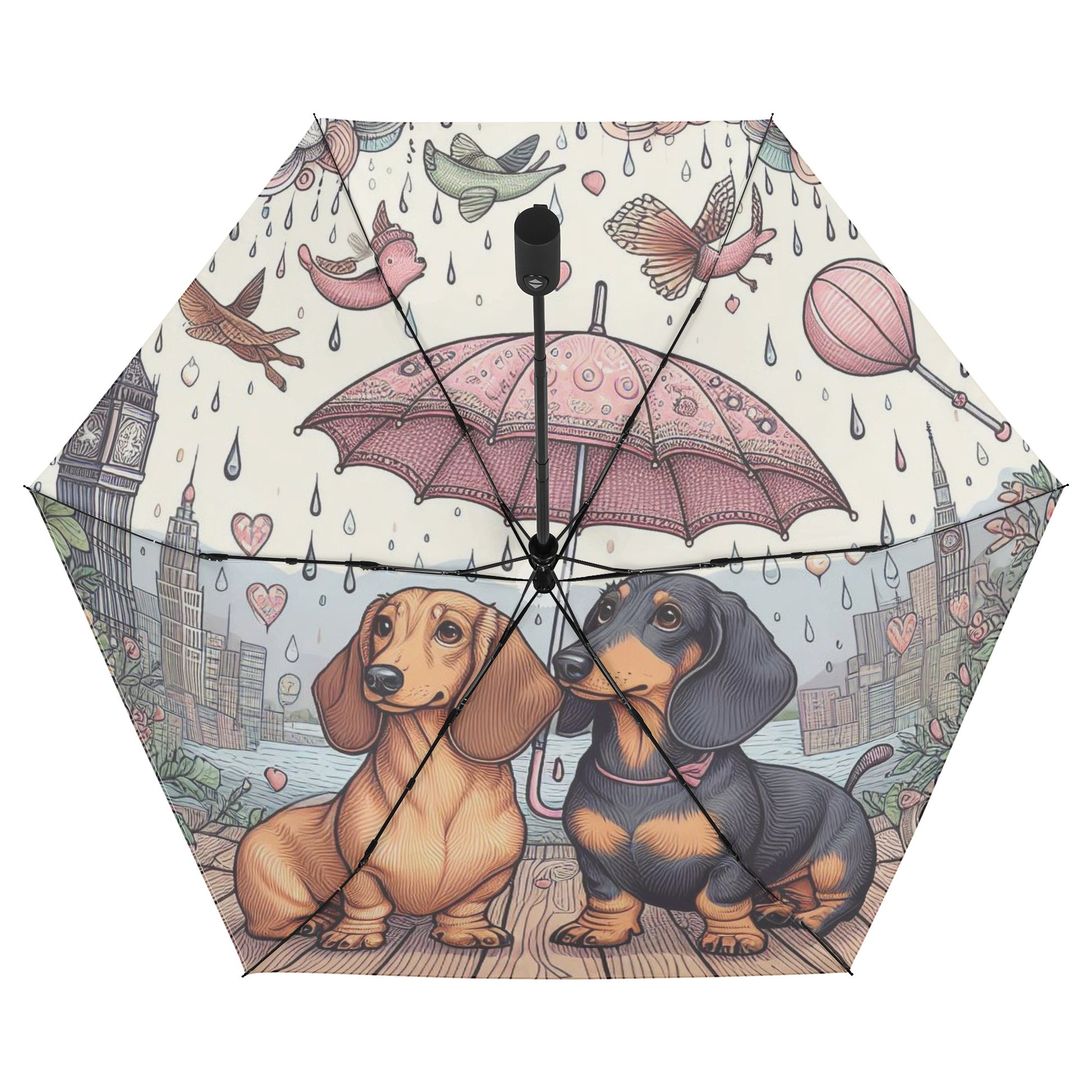 El paraguas se compone de 6 piezas, cada una con un bonito estampado de perro salchicha. También puedes personalizar el cinturón y la funda para que coincidan con tu estilo y preferencia. El paraguas tiene un mecanismo de apertura y cierre automático y un mango de agarre cómodo. Puedes abrirlo y cerrarlo con una mano y disfrutar de una experiencia cómoda y fluida.