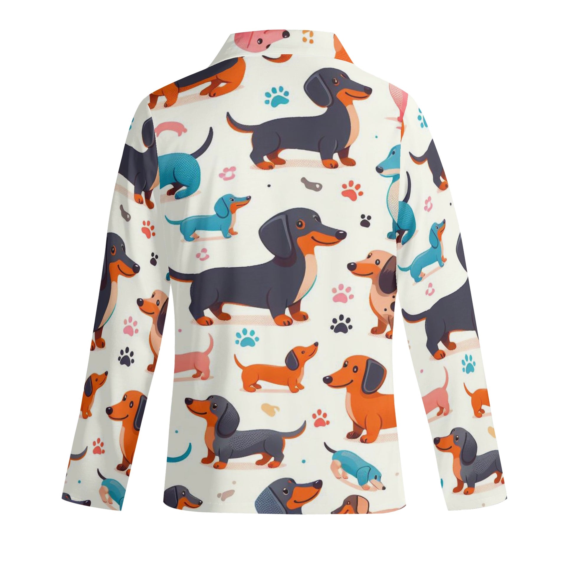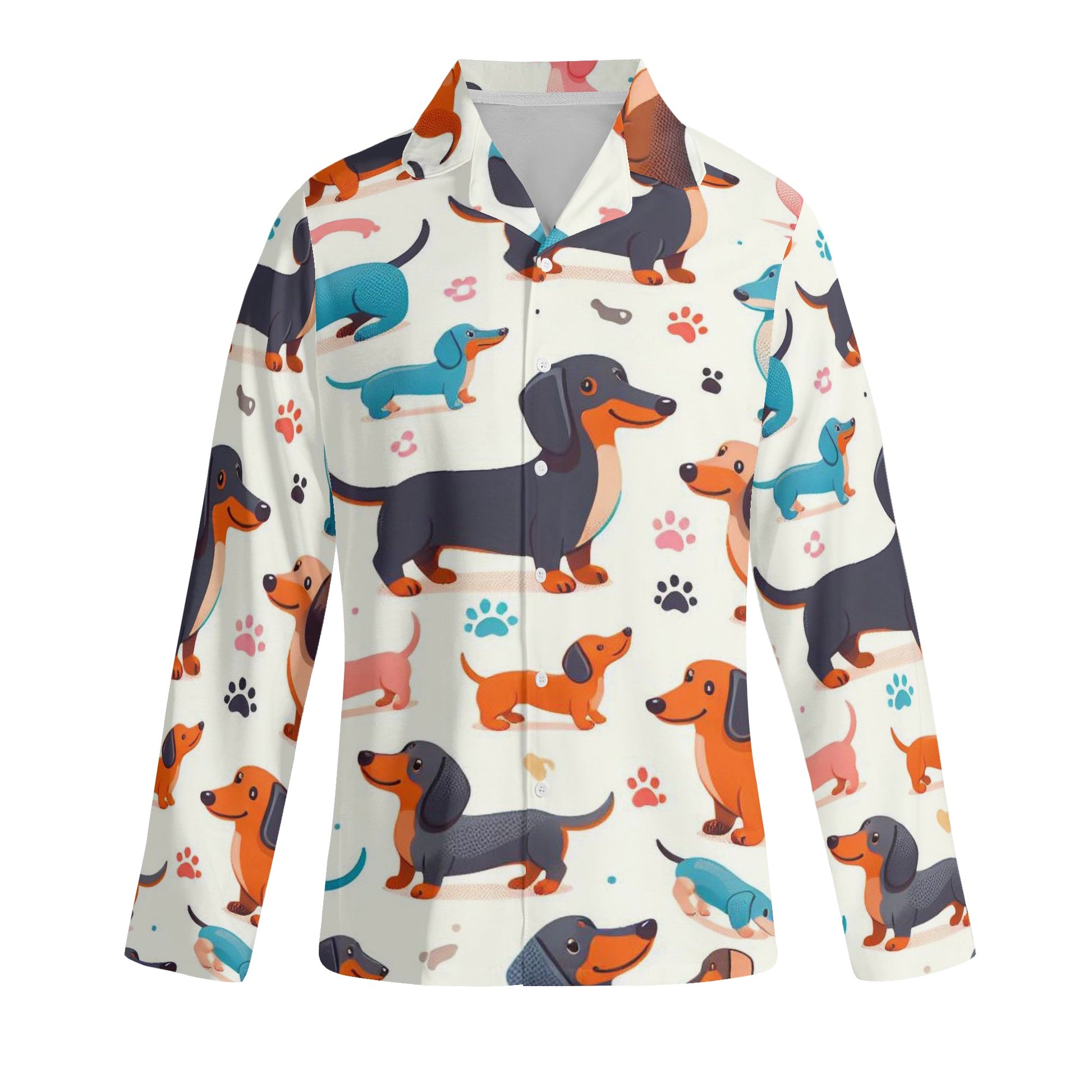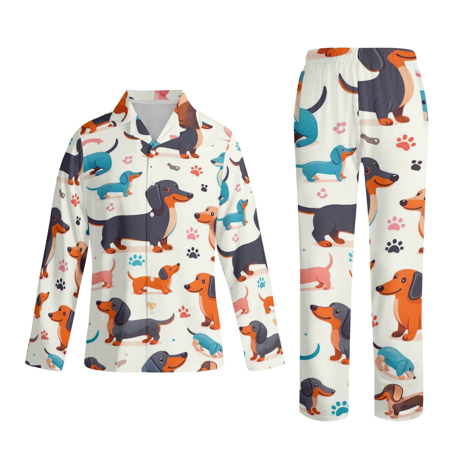 - ¿Amas a los perros salchicha tanto como a nosotros? Si es así, te encantará este conjunto de pijama acogedor y elegante que presenta un lindo y colorido patrón de perro salchicha. Ya sea que estés acurrucándote con tu amigo peludo o relajándote solo, este conjunto de pijama te mantendrá abrigado y cómodo durante toda la noche.