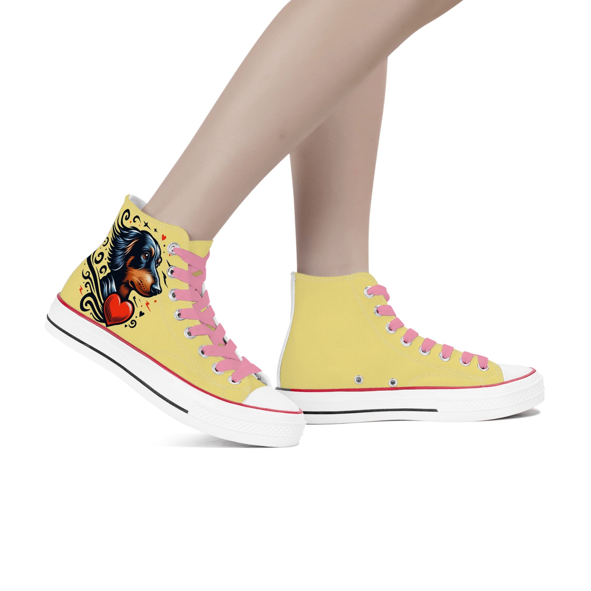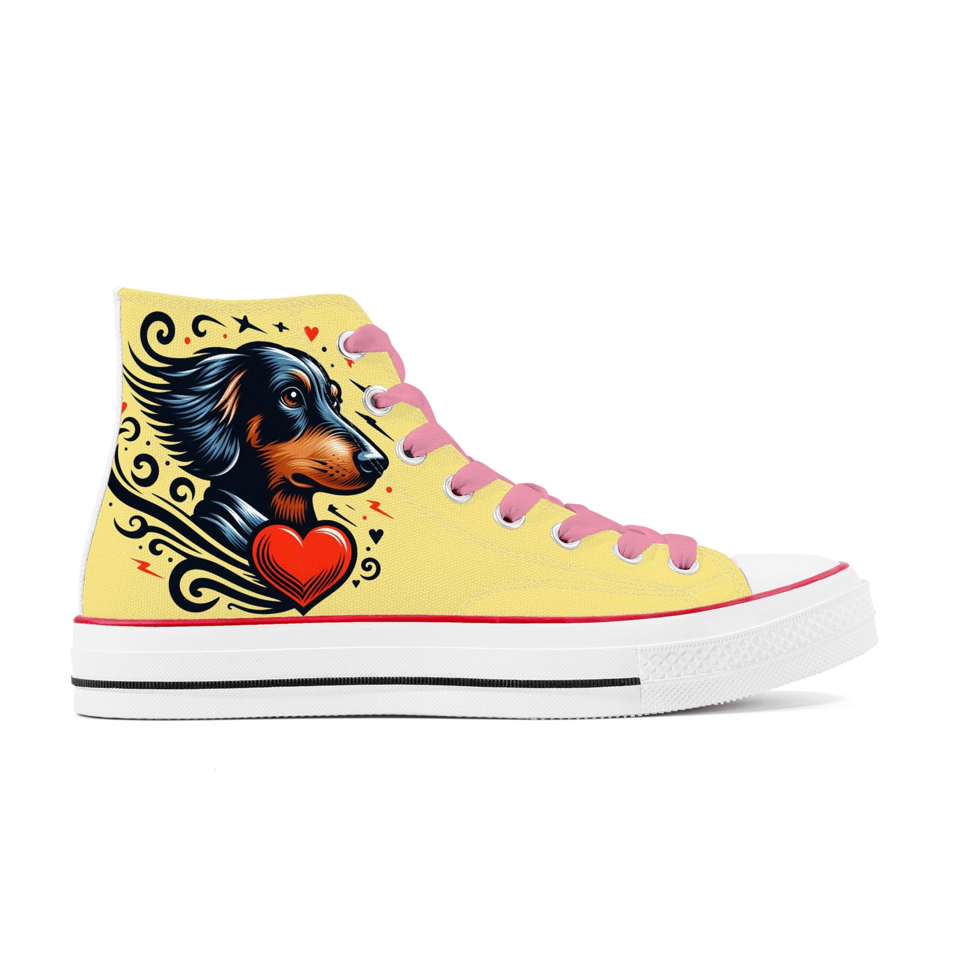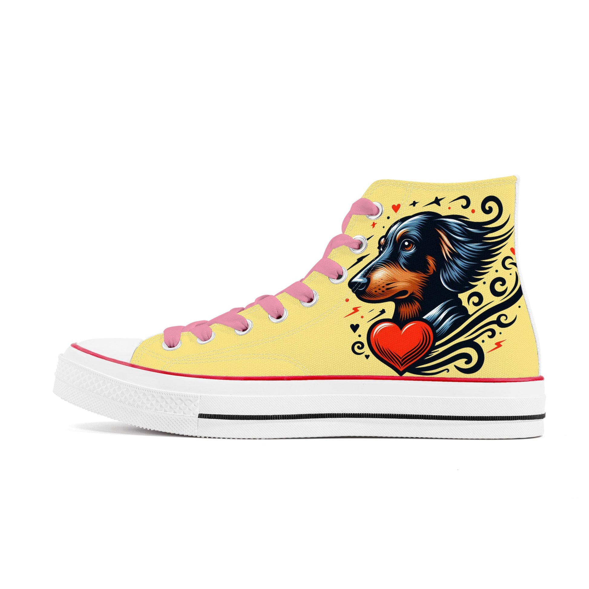 Si te encantan los perros salchicha, los perros encantadores y leales con cuerpos largos y patas cortas, te encantarán estos zapatos personalizados con estampado integral que presentan un divertido diseño de perro salchicha.