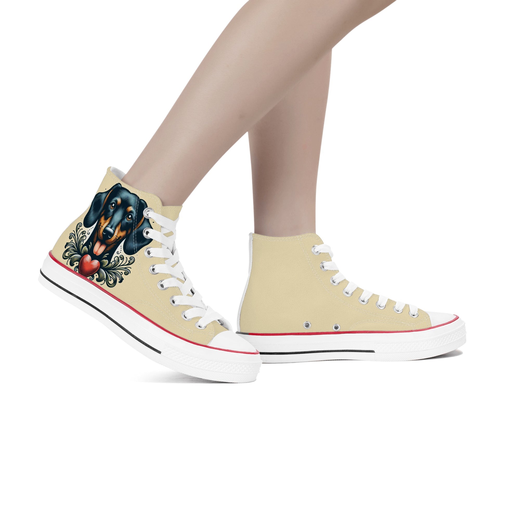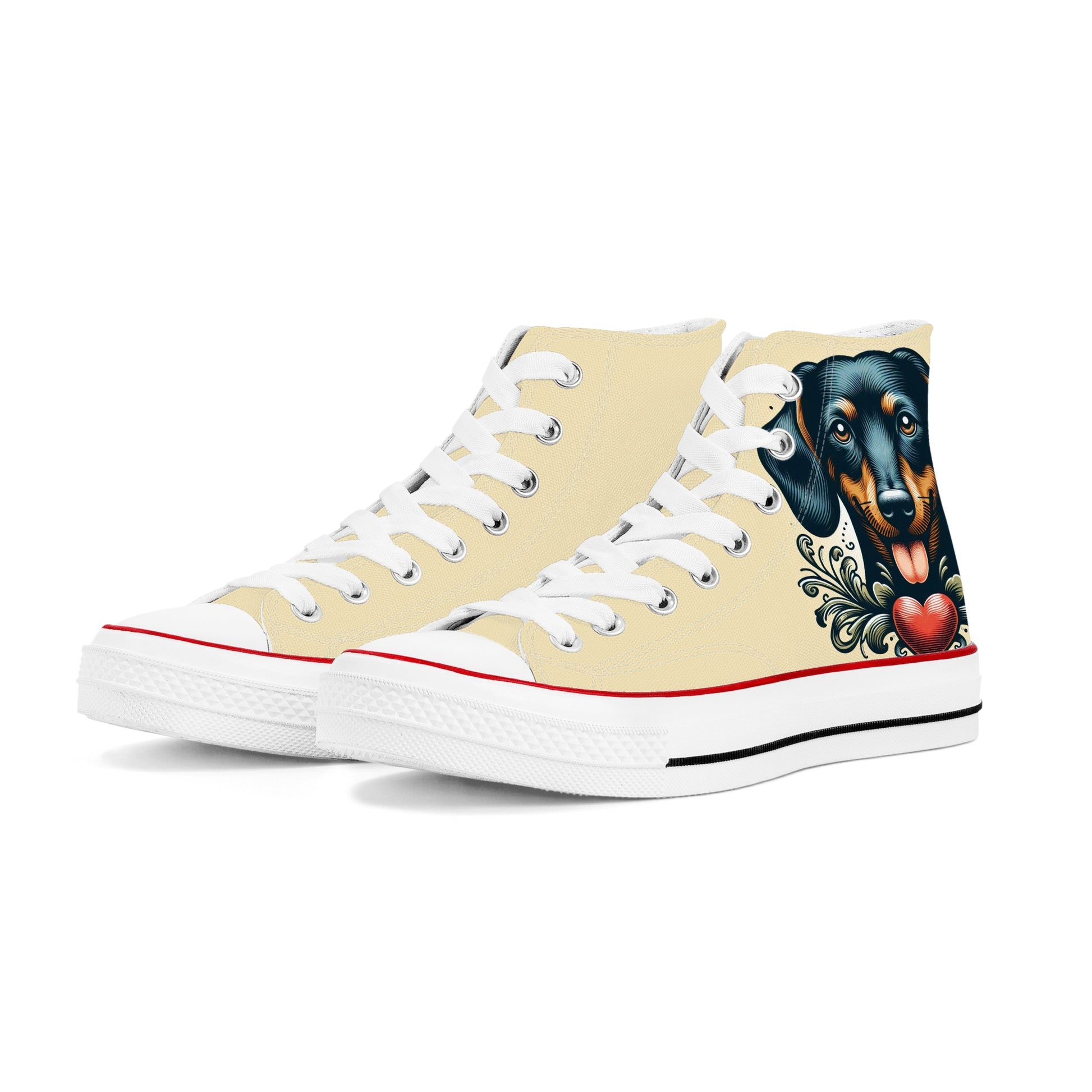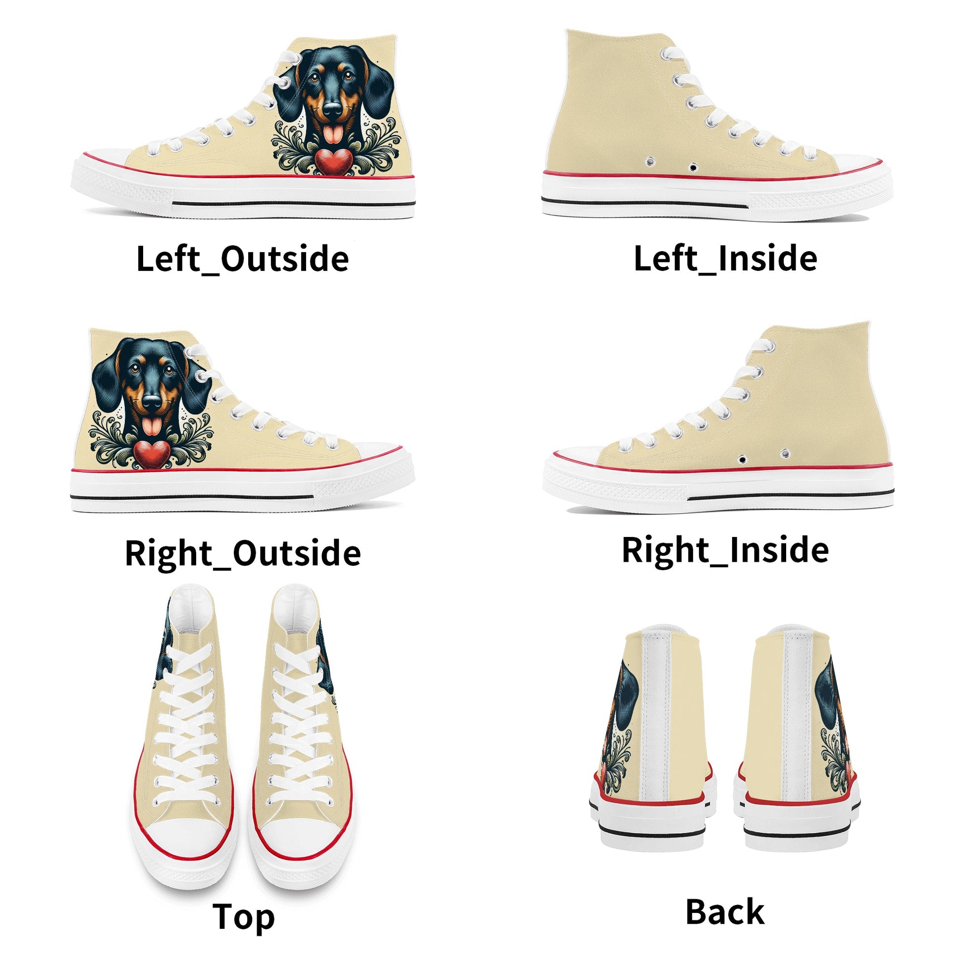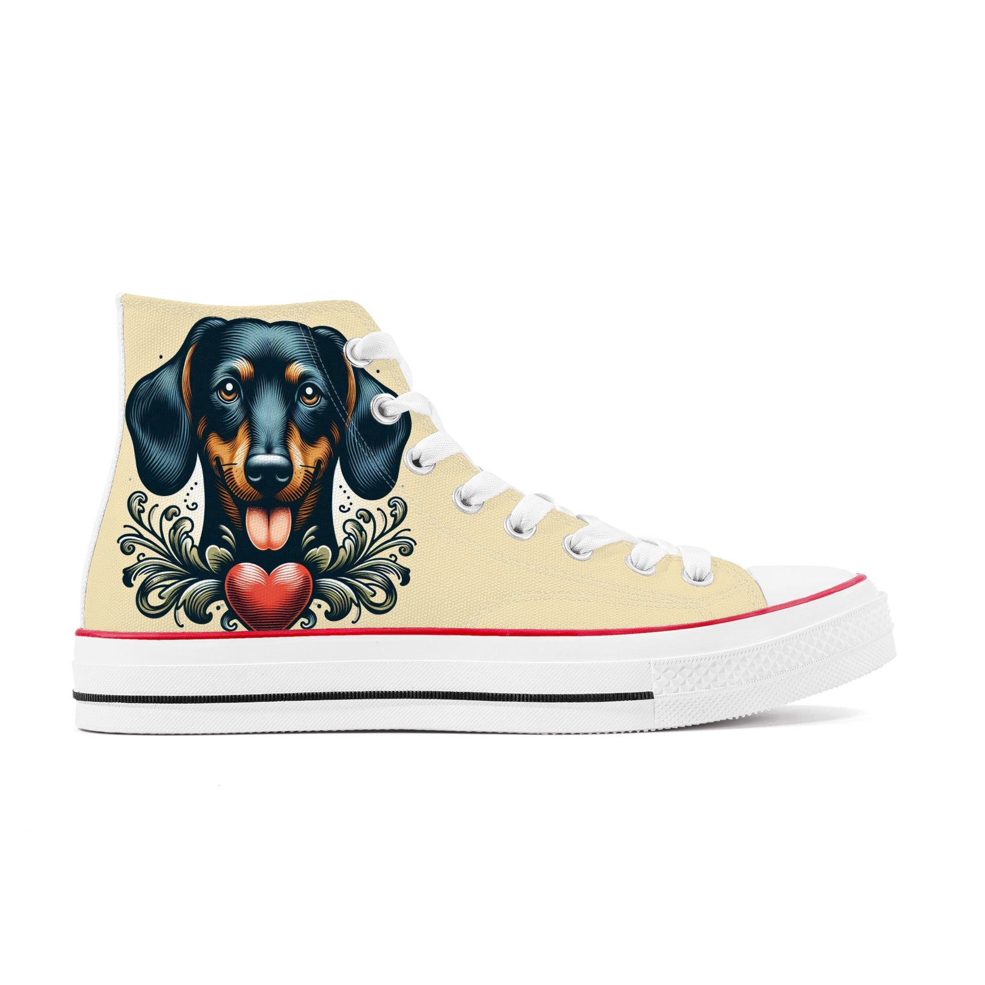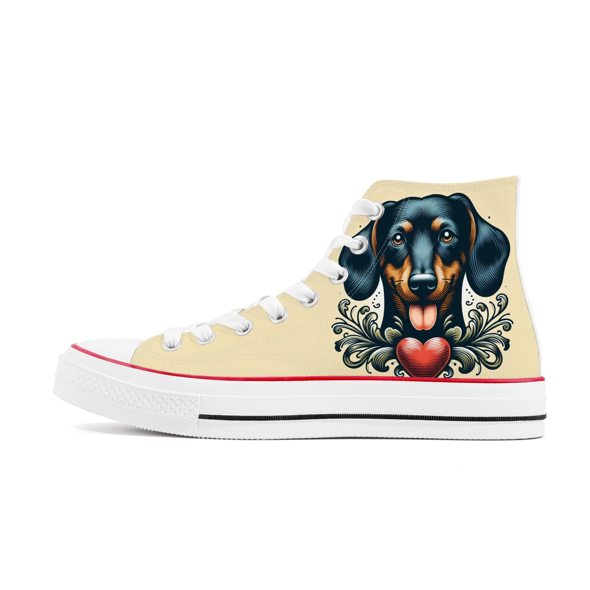 Si te encantan los perros salchicha, los perros encantadores y leales con cuerpos largos y patas cortas, te encantarán estos zapatos personalizados con estampado integral que presentan un divertido diseño de perro salchicha.